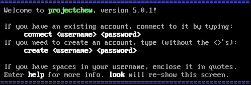 "banner_before_return": "\r\n\u001b[1m\u001b[34m==============================================================\u001b[0m\r\n Welcome to \u001b[1m\u001b[32mprojectchew\u001b[0m, version 5.0.1!\r\n\r\n If you have an existing account, connect to it by typing:\r\n \u001b[1m\u001b[37mconnect <username> <password>\u001b[0m\r\n If you need to create an account, type (without the <>'s):\r\n \u001b[1m\u001b[37mcreate <username> <password>\u001b[0m\r\n\r\n If you have spaces in your username, enclose it in quotes.\r\n Enter \u001b[1m\u001b[37mhelp\u001b[0m for more info. \u001b[1m\u001b[37mlook\u001b[0m will re-show this screen.\r\n\u001b[1m\u001b[34m==============================================================\u001b[0m\r\n",