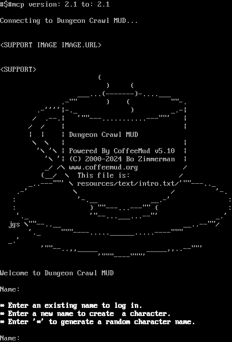 "banner_before_return": "\n\r#$#mcp version: 2.1 to: 2.1\n\r\n\rConnecting to Dungeon Crawl MUD...\n\r\n\u001b[6z\n\u001b[6z<SUPPORT IMAGE IMAGE.URL>\n\n\u001b[6z\n\u001b[6z<SUPPORT>\n (\n\r ) (\n\r ___...(-------)-....___\n\r .-"" ) ( ""-.\n\r .-''''|-._ ) _.-|\n\r / .--.| '""---...........---""' |\n\r / / | |\n\r | | | Dungeon Crawl MUD\n\r \\ \\ | |\n\r '\\ '\\ | Powered By CoffeeMud v5.10 |\n\r '\\ '| (C) 2000-2024 Bo Zimmerman |\n\r _/ /\\ www.coffeemud.org /\n\r (__/ \\ This file is: /\n\r _..---""' \\ resources/text/intro.txt/'""---.._\n\r .-' \\ / '-.\n\r : '-.__ __.-' :\n\r : ) ""---...---"" ( :\n\r '._ '"--...___...--"' _.'\n\r jgs \\""--..__ __..--""/\n\r '._ """----.....______.....----""" \r\n _.'\n\r '""--..,,_____ _____,,..--""'\n\r '"""----"""'\n\r\n\rWelcome to Dungeon Crawl MUD\n\r\n\rName: ",