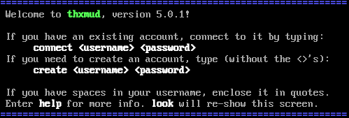 "banner_before_return": "\r\n\u001b[1m\u001b[34m==============================================================\u001b[0m\r\n Welcome to \u001b[1m\u001b[32mthxmud\u001b[0m, version 5.0.1!\r\n\r\n If you have an existing account, connect to it by typing:\r\n \u001b[1m\u001b[37mconnect <username> <password>\u001b[0m\r\n If you need to create an account, type (without the <>'s):\r\n \u001b[1m\u001b[37mcreate <username> <password>\u001b[0m\r\n\r\n If you have spaces in your username, enclose it in quotes.\r\n Enter \u001b[1m\u001b[37mhelp\u001b[0m for more info. \u001b[1m\u001b[37mlook\u001b[0m will re-show this screen.\r\n\u001b[1m\u001b[34m==============================================================\u001b[0m\r\n",