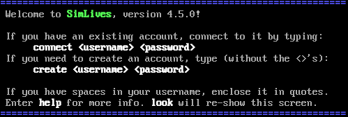 "banner_before_return": "\r\n\u001b[1m\u001b[34m==============================================================\u001b[0m\r\n Welcome to \u001b[1m\u001b[32mSimLives\u001b[0m, version 4.5.0!\r\n\r\n If you have an existing account, connect to it by typing:\r\n \u001b[1m\u001b[37mconnect <username> <password>\u001b[0m\r\n If you need to create an account, type (without the <>'s):\r\n \u001b[1m\u001b[37mcreate <username> <password>\u001b[0m\r\n\r\n If you have spaces in your username, enclose it in quotes.\r\n Enter \u001b[1m\u001b[37mhelp\u001b[0m for more info. \u001b[1m\u001b[37mlook\u001b[0m will re-show this screen.\r\n\u001b[1m\u001b[34m==============================================================\u001b[0m\r\n",