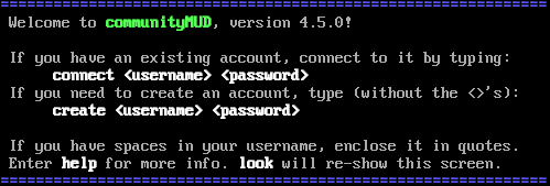 "banner_before_return": "\r\n\u001b[1m\u001b[34m==============================================================\u001b[0m\r\n Welcome to \u001b[1m\u001b[32mcommunityMUD\u001b[0m, version 4.5.0!\r\n\r\n If you have an existing account, connect to it by typing:\r\n \u001b[1m\u001b[37mconnect <username> <password>\u001b[0m\r\n If you need to create an account, type (without the <>'s):\r\n \u001b[1m\u001b[37mcreate <username> <password>\u001b[0m\r\n\r\n If you have spaces in your username, enclose it in quotes.\r\n Enter \u001b[1m\u001b[37mhelp\u001b[0m for more info. \u001b[1m\u001b[37mlook\u001b[0m will re-show this screen.\r\n\u001b[1m\u001b[34m==============================================================\u001b[0m\r\n",