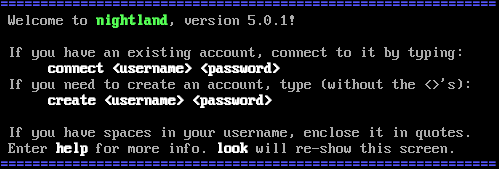 "banner_before_return": "\r\n\u001b[1m\u001b[34m==============================================================\u001b[0m\r\n Welcome to \u001b[1m\u001b[32mnightland\u001b[0m, version 5.0.1!\r\n\r\n If you have an existing account, connect to it by typing:\r\n \u001b[1m\u001b[37mconnect <username> <password>\u001b[0m\r\n If you need to create an account, type (without the <>'s):\r\n \u001b[1m\u001b[37mcreate <username> <password>\u001b[0m\r\n\r\n If you have spaces in your username, enclose it in quotes.\r\n Enter \u001b[1m\u001b[37mhelp\u001b[0m for more info. \u001b[1m\u001b[37mlook\u001b[0m will re-show this screen.\r\n\u001b[1m\u001b[34m==============================================================\u001b[0m\r\n",