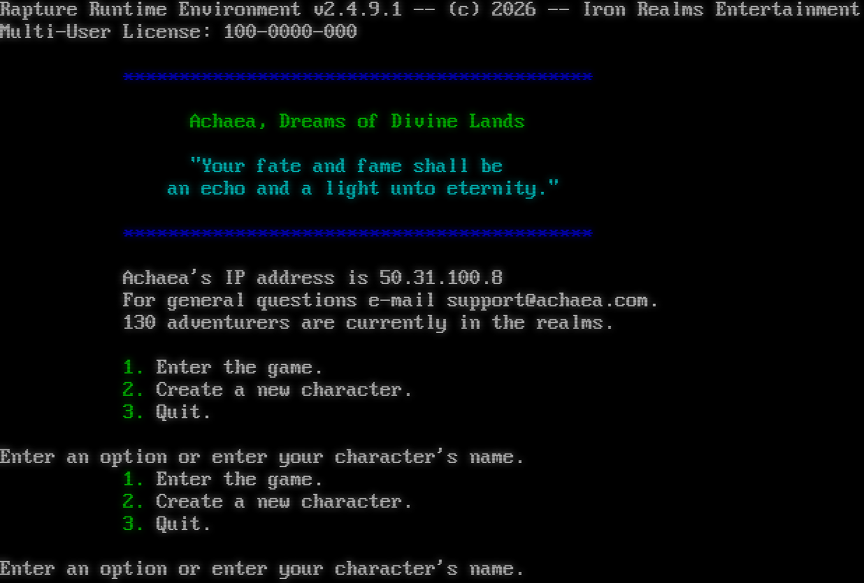 "banner_before_return": "Rapture Runtime Environment v2.4.9.1 -- (c) 2026 -- Iron Realms Entertainment\r\r\nMulti-User License: 100-0000-000\r\r\n\r\r\n\u001b[0;37m \u001b[34m******************************************\u001b[37m\r\n\r\n \u001b[32mAchaea, Dreams of Divine Lands\u001b[37m\r\n\r\n \u001b[36m\"Your fate and fame shall be\r\n an echo and a light unto eternity.\"\r\n\r\n \u001b[34m******************************************\u001b[37m\r\n\r\n Achaea's IP address is 50.31.100.8\r\n For general questions e-mail support@achaea.com.\r\n 130 adventurers are currently in the realms.\r\n\r\n \u001b[32m1.\u001b[37m Enter the game.\r\n \u001b[32m2.\u001b[37m Create a new character.\r\n \u001b[32m3.\u001b[37m Quit.\r\n\r\nEnter an option or enter your character's name. \r\n \u001b[32m1.\u001b[37m Enter the game.\r\n \u001b[32m2.\u001b[37m Create a new character.\r\n \u001b[32m3.\u001b[37m Quit.\r\n\r\nEnter an option or enter your character's name. ",