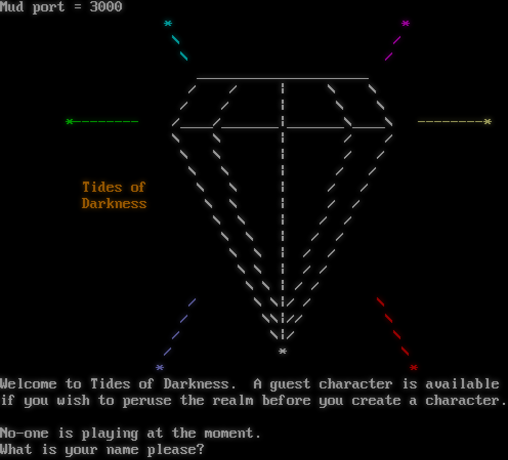 "banner_before_return": "Mud port = 3000\r\n \u001b[36m* \u001b[35m*\u001b[0m\r\n \u001b[36m\\ \u001b[0m \u001b[35m/ \u001b[0m\r\n \u001b[36m\\ \u001b[0m \u001b[35m/ \u001b[0m\r\n \u001b[1;37m_____________________\u001b[0m\r\n \u001b[1;37m/ / | \\ \\ \u001b[0m\r\n \u001b[1;37m/ / | \\ \\ \u001b[0m\r\n \u001b[32m*--------\u001b[0m \u001b[1;37m/____/_______|_______\\____\\ \u001b[1;33m--------*\u001b[0m\r\n \u001b[1;37m\\ \\ | / / \u001b[0m\r\n \u001b[1;37m\\ \\ | / /\u001b[0m\r\n \u001b[1;37m\\ \\ | / /\u001b[0m\r\n \u001b[33mTides of \u001b[1;37m\\ \\ | / /\u001b[0m\r\n \u001b[33mDarkness \u001b[1;37m\\ \\ | / /\u001b[0m\r\n \u001b[1;37m\\ \\ | / /\u001b[0m\r\n \u001b[1;37m\\ \\ | / /\u001b[0m\r\n \u001b[1;37m\\ \\ | / /\u001b[0m\r\n \u001b[1;37m\\ \\ | / / \u001b[0m\r\n \u001b[1;37m\\ \\ | / /\u001b[0m\r\n \u001b[1;34m/ \u001b[1;37m\\ \\|/ /\u001b[0m \u001b[31m\\ \u001b[0m\r\n \u001b[1;34m/ \u001b[1;37m\\\\|// \u001b[0;31m\\\u001b[0m\r\n \u001b[1;34m/ \u001b[1;37m\\|/ \u001b[0;31m\\ \u001b[0m\r\n \u001b[1;34m/ \u001b[1;37m* \u001b[0;31m\\ \u001b[0m\r\n \u001b[1;34m*\u001b[0m \u001b[0;31m*\u001b[0m\r\nWelcome to Tides of Darkness. A guest character is available\r\nif you wish to peruse the realm before you create a character.\r\n\r\nNo-one is playing at the moment.\r\nWhat is your name please? ",