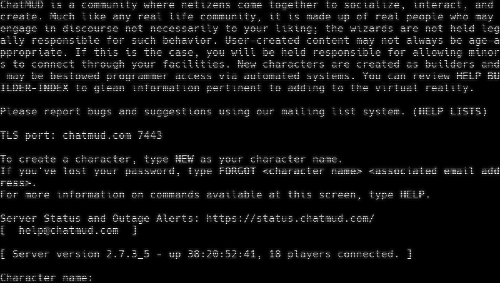 "banner_before_return": "Welcome to...\r\n\r\n ##### # # # # ######\r\n # # # # ## ##### ## ## # # # #\r\n # # # # # # # # # # # # # #\r\n # ###### # # # # # # # # # #\r\n # # # ###### # # # # # # #\r\n # # # # # # # # # # # # #\r\n ##### # # # # # # # ##### ######\r\n\r\n [ PUBLIC BETA ]\r\n\r\nChatMUD is a community where netizens come together to socialize, interact, and create. Much like any real life community, it is made up of real people who may engage in discourse not necessarily to your liking; the wizards are not held legally responsible for such behavior. User-created content may not always be age-appropriate. If this is the case, you will be held responsible for allowing minors to connect through your facilities. New characters are created as builders and may be bestowed programmer access via automated systems. You can review \u001b[1m\u001b[37mHELP BUILDER-INDEX\u001b[0m to glean information pertinent to adding to the virtual reality.\r\n\r\nPlease report bugs and suggestions using our mailing list system. (\u001b[1m\u001b[37mHELP LISTS\u001b[0m)\r\n\r\nTLS port: chatmud.com 7443\r\n\r\nTo create a character, type \u001b[1m\u001b[37mNEW\u001b[0m as your character name.\r\nIf you've lost your password, type \u001b[1m\u001b[37mFORGOT <character name> <associated email address>\u001b[0m.\r\nFor more information on commands available at this screen, type \u001b[1m\u001b[37mHELP\u001b[0m.\r\n\r\nServer Status and Outage Alerts: https://status.chatmud.com/\r\n[ help@chatmud.com ]\r\n\r\n[ Server version 2.7.3_5 - up 38:20:52:31, 18 players connected. ]\r\n\r\nCharacter name: \r\n",
