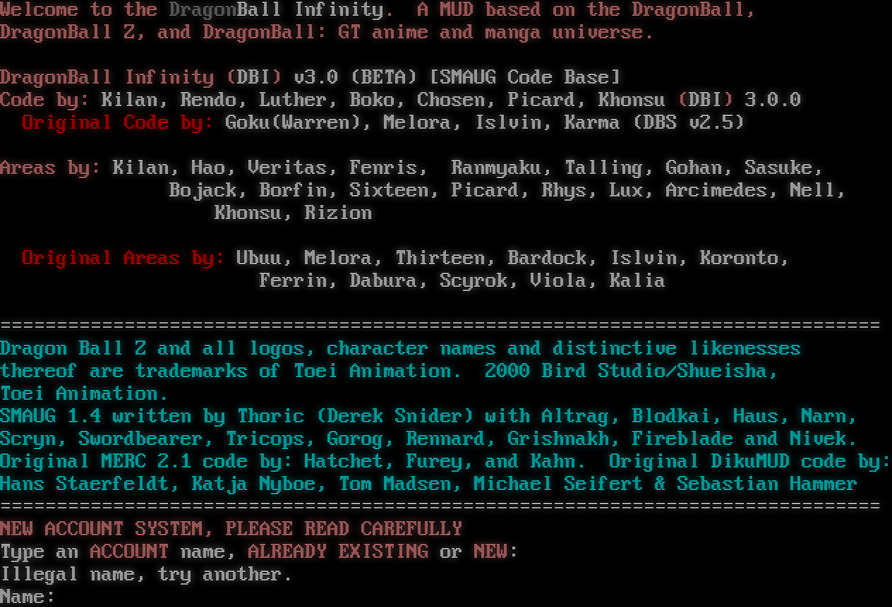 "banner_before_return": "\n\r\n\r\u001b[1;31m\n\rWelcome to the \u001b[1;30mDragon\u001b[1;37mBall \u001b[0;37mInfinity\u001b[1;31m. A MUD based on the DragonBall,\n\rDragonBall Z, and DragonBall: GT anime and manga universe.\n\r\n\r\u001b[1;31mDragonBall Infinity (\u001b[1;37mDBI\u001b[1;31m) \u001b[1;37mv3.0\u001b[0;37m (BETA) [SMAUG Code Base]\u001b[0;37m\n\r\u001b[1;31mCode by: \u001b[1;37mKilan, Rendo, Luther, Boko, Chosen, Picard, Khonsu \u001b[1;31m(\u001b[1;37mDBI\u001b[1;31m)\u001b[1;37m \u001b[1;37m\u001b[1;37m3.0.0\n\r\u001b[0;31m Original Code by: \u001b[0;37mGoku(Warren), Melora, Islvin, Karma (DBS\u001b[1;37m v2.5\u001b[0;37m)\u001b[0m\u001b[0;37m\n\r \n\r\u001b[1;31mAreas by: \u001b[1;37mKilan, Hao, Veritas, Fenris, Ranmyaku, Talling, Gohan, Sasuke,\n\r Bojack, Borfin, Sixteen, Picard, Rhys, Lux, Arcimedes, Nell,\n\r \u001b[1;37mKhonsu, Rizion\n\r\n\r\u001b[0;31m Original Areas by: \u001b[0;37mUbuu, Melora, Thirteen, Bardock, Islvin, Koronto,\n\r \u001b[0;37mFerrin, Dabura, Scyrok, Viola, Kalia\n\r\n\r\u001b[0;37m==============================================================================\u001b[0;36m\n\rDragon Ball Z and all logos, character names and distinctive likenesses\n\rthereof are trademarks of Toei Animation. 2000 Bird Studio/Shueisha,\n\rToei Animation.\n\rSMAUG 1.4 written by Thoric (Derek Snider) with Altrag, Blodkai, Haus, Narn,\n\rScryn, Swordbearer, Tricops, Gorog, Rennard, Grishnakh, Fireblade and Nivek.\n\rOriginal MERC 2.1 code by: Hatchet, Furey, and Kahn. Original DikuMUD code by:\n\rHans Staerfeldt, Katja Nyboe, Tom Madsen, Michael Seifert & Sebastian Hammer\n\r\u001b[0;37m==============================================================================\u001b[0m\u001b[0;37m\n\r\u001b[1;31mNEW ACCOUNT SYSTEM, PLEASE READ CAREFULLY\u001b[0m\u001b[0;37m\n\r\u001b[0;37mType an \u001b[1;31mACCOUNT \u001b[0;37mname, \u001b[1;31mALREADY EXISTING \u001b[0;37mor \u001b[1;31mNEW\u001b[1;37m: \u001b[0m\u001b[0;37m",