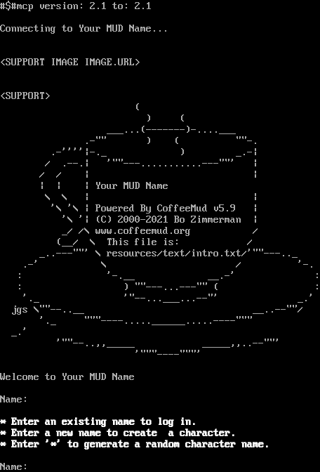 "banner_before_return": "\n\r#$#mcp version: 2.1 to: 2.1\n\r\n\rConnecting to Your MUD Name...\n\r\n\u001b[6z\n\u001b[6z<SUPPORT IMAGE IMAGE.URL>\n\n\u001b[6z\n\u001b[6z<SUPPORT>\n (\n\r ) (\n\r ___...(-------)-....___\n\r .-"" ) ( ""-.\n\r .-''''|-._ ) _.-|\n\r / .--.| '""---...........---""' |\n\r / / | |\n\r | | | Your MUD Name\n\r \\ \\ | |\n\r '\\ '\\ | Powered By CoffeeMud v5.9 |\n\r '\\ '| (C) 2000-2021 Bo Zimmerman |\n\r _/ /\\ www.coffeemud.org /\n\r (__/ \\ This file is: /\n\r _..---""' \\ resources/text/intro.txt/'""---.._\n\r .-' \\ / '-.\n\r : '-.__ __.-' :\n\r : ) ""---...---"" ( :\n\r '._ '"--...___...--"' _.'\n\r jgs \\""--..__ __..--""/\n\r '._ """----.....______.....----""" \r\n _.'\n\r '""--..,,_____ _____,,..--""'\n\r '"""----"""'\n\r\n\rWelcome to Your MUD Name\n\r\n\rName: ",