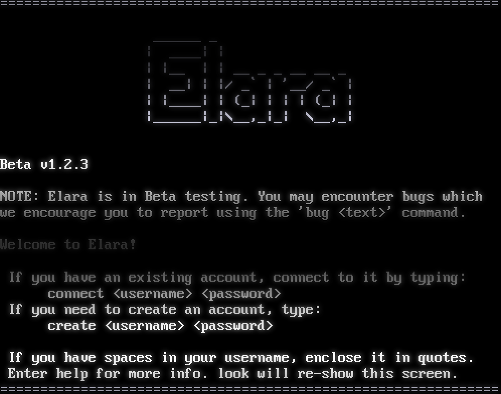 "banner_before_return": "\r\n\u001b[38;5;105m==============================================================\u001b[0m\r\n\u001b[38;5;105m\r\n ______ _ \r\n | ____| | \r\n | |__ | | __ _ _ __ __ _ \r\n | __| | |/ _` | '__/ _` |\r\n | |____| | (_| | | | (_| |\r\n |______|_|\\__,_|_| \\__,_|\r\n\u001b[0m \r\n\r\nBeta v1.2.3\r\n\r\nNOTE: Elara is in Beta testing. You may encounter bugs which\r\nwe encourage you to report using the 'bug <text>' command. \r\n\r\nWelcome to Elara!\r\n\r\n If you have an existing account, connect to it by typing:\r\n \u001b[1m\u001b[37mconnect <username> <password>\u001b[0m\r\n If you need to create an account, type:\r\n \u001b[1m\u001b[37mcreate <username> <password>\u001b[0m\r\n\r\n If you have spaces in your username, enclose it in quotes.\r\n Enter \u001b[1m\u001b[37mhelp\u001b[0m for more info. \u001b[1m\u001b[37mlook\u001b[0m will re-show this screen.\r\n\u001b[38;5;105m==============================================================\u001b[0m\r\n",