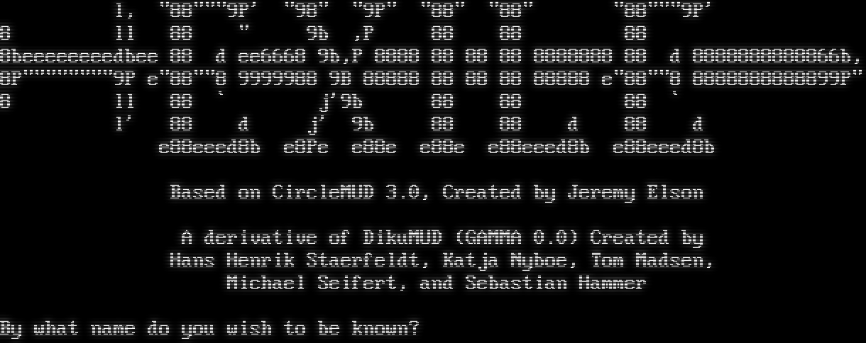 "banner_before_return": "\r\n\u001b[7z\u001b[7z\r\n\u001b[H\u001b[J\r\n\r\n l, \"88\"\"\"9P' \"98\" \"9P\" \"88\" \"88\" \"88\"\"\"9P'\r\n8 ll 88 \" 9b ,P 88 88 88\r\n8beeeeeeeedbee 88 d ee6668 9b,P 8888 88 88 88 8888888 88 d 8888888888866b,\r\n8P\"\"\"\"\"\"\"\"9P e\"88\"\"8 9999988 9B 88888 88 88 88 88888 e\"88\"\"8 8888888888899P\"\r\n8 ll 88 ` j'9b 88 88 88 `\r\n l' 88 d j' 9b 88 88 d 88 d\r\n e88eeed8b e8Pe e88e e88e e88eeed8b e88eeed8b\r\n\r\n Based on CircleMUD 3.0, Created by Jeremy Elson\r\n\r\n A derivative of DikuMUD (GAMMA 0.0) Created by\r\n Hans Henrik Staerfeldt, Katja Nyboe, Tom Madsen,\r\n Michael Seifert, and Sebastian Hammer\r\n\r\nBy what name do you wish to be known? ",