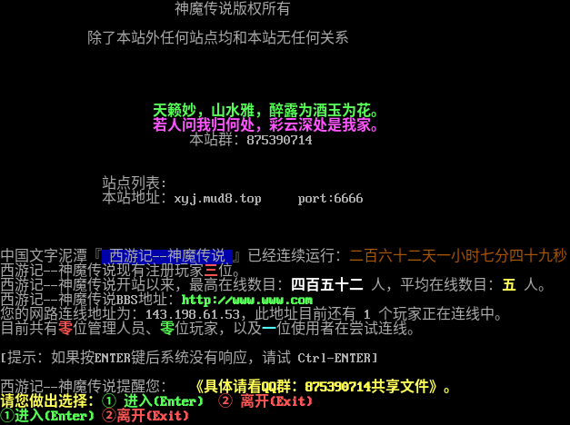 "banner_before_return": "\u001b[2J\t \r\n\u3000\u3000\u3000\u3000\u3000 \u3000\u3000\u3000\u3000\u3000\u795e\u9b54\u4f20\u8bf4\u7248\u6743\u6240\u6709\r\n\r\n \u9664\u4e86\u672c\u7ad9\u5916\u4efb\u4f55\u7ad9\u70b9\u5747\u548c\u672c\u7ad9\u65e0\u4efb\u4f55\u5173\u7cfb\r\n\r\n\r\n \r\n\r\n \u3000\u3000\u3000\u3000\u3000\u3000\u3000\u3000\u001b[1;32m\u5929\u7c41\u5999\uff0c\u5c71\u6c34\u96c5\uff0c\u9189\u9732\u4e3a\u9152\u7389\u4e3a\u82b1\u3002\u001b[2;37;0m\r\n\u3000\u3000 \u3000\u3000\u3000\u3000\u3000\u3000\u001b[1;35m\u82e5\u4eba\u95ee\u6211\u5f52\u4f55\u5904\uff0c\u5f69\u4e91\u6df1\u5904\u662f\u6211\u5bb6\u3002\u001b[2;37;0m\r\n \u672c\u7ad9\u7fa4\uff1a875390714\r\n\r\n\r\n \u7ad9\u70b9\u5217\u8868: \r\n \u672c\u7ad9\u5730\u5740\uff1axyj.mud8.top port:6666\r\n \r\n\r\n\r\n\u4e2d\u56fd\u6587\u5b57\u6ce5\u6f6d\u300e\u001b[44m \u897f\u6e38\u8bb0--\u795e\u9b54\u4f20\u8bf4 \u001b[2;37;0m\u300f\u5df2\u7ecf\u8fde\u7eed\u8fd0\u884c\uff1a\u001b[33m\u4e8c\u767e\u516d\u5341\u4e8c\u5929\u4e00\u5c0f\u65f6\u4e03\u5206\u56db\u5341\u4e5d\u79d2\u001b[2;37;0m\r\n\u897f\u6e38\u8bb0--\u795e\u9b54\u4f20\u8bf4\u73b0\u6709\u6ce8\u518c\u73a9\u5bb6\u001b[1;31m\u4e09\u001b[2;37;0m\u4f4d\u3002\r\n\u897f\u6e38\u8bb0--\u795e\u9b54\u4f20\u8bf4\u5f00\u7ad9\u4ee5\u6765\uff0c\u6700\u9ad8\u5728\u7ebf\u6570\u76ee\uff1a\u001b[1;37m\u56db\u767e\u4e94\u5341\u4e8c\u001b[2;37;0m \u4eba\uff0c\u5e73\u5747\u5728\u7ebf\u6570\u76ee\uff1a\u001b[1;33m\u4e94\u001b[2;37;0m \u4eba\u3002\r\n\u897f\u6e38\u8bb0--\u795e\u9b54\u4f20\u8bf4BBS\u5730\u5740\uff1a\u001b[1;32mhttp://www.www.com \r\n\u001b[2;37;0m\u60a8\u7684\u7f51\u8def\u8fde\u7ebf\u5730\u5740\u4e3a\uff1a\u001b[37m143.198.61.53\u001b[2;37;0m\uff0c\u6b64\u5730\u5740\u76ee\u524d\u8fd8\u6709 1 \u4e2a\u73a9\u5bb6\u6b63\u5728\u8fde\u7ebf\u4e2d\u3002\r\n\u76ee\u524d\u5171\u6709\u001b[1;31m\u96f6\u001b[2;37;0m\u4f4d\u7ba1\u7406\u4eba\u5458\u3001\u001b[1;32m\u96f6\u001b[2;37;0m\u4f4d\u73a9\u5bb6\uff0c\u4ee5\u53ca\u001b[1;36m\u4e00\u001b[2;37;0m\u4f4d\u4f7f\u7528\u8005\u5728\u5c1d\u8bd5\u8fde\u7ebf\u3002\r\n\r\n[\u63d0\u793a\uff1a\u5982\u679c\u6309ENTER\u952e\u540e\u7cfb\u7edf\u6ca1\u6709\u54cd\u5e94\uff0c\u8bf7\u8bd5 Ctrl-ENTER]\r\n\r\n\u897f\u6e38\u8bb0--\u795e\u9b54\u4f20\u8bf4\u63d0\u9192\u60a8\uff1a\u001b[1;33m \u300a\u5177\u4f53\u8bf7\u770bQQ\u7fa4\uff1a875390714\u5171\u4eab\u6587\u4ef6\u300b\u001b[1;33m\u3002\r\n\u8bf7\u60a8\u505a\u51fa\u9009\u62e9\uff1a\u001b[1;32m\u2460 \u8fdb\u5165(Enter) \u001b[1;31m\u2461 \u79bb\u5f00(Exit)\u001b[2;37;0m",