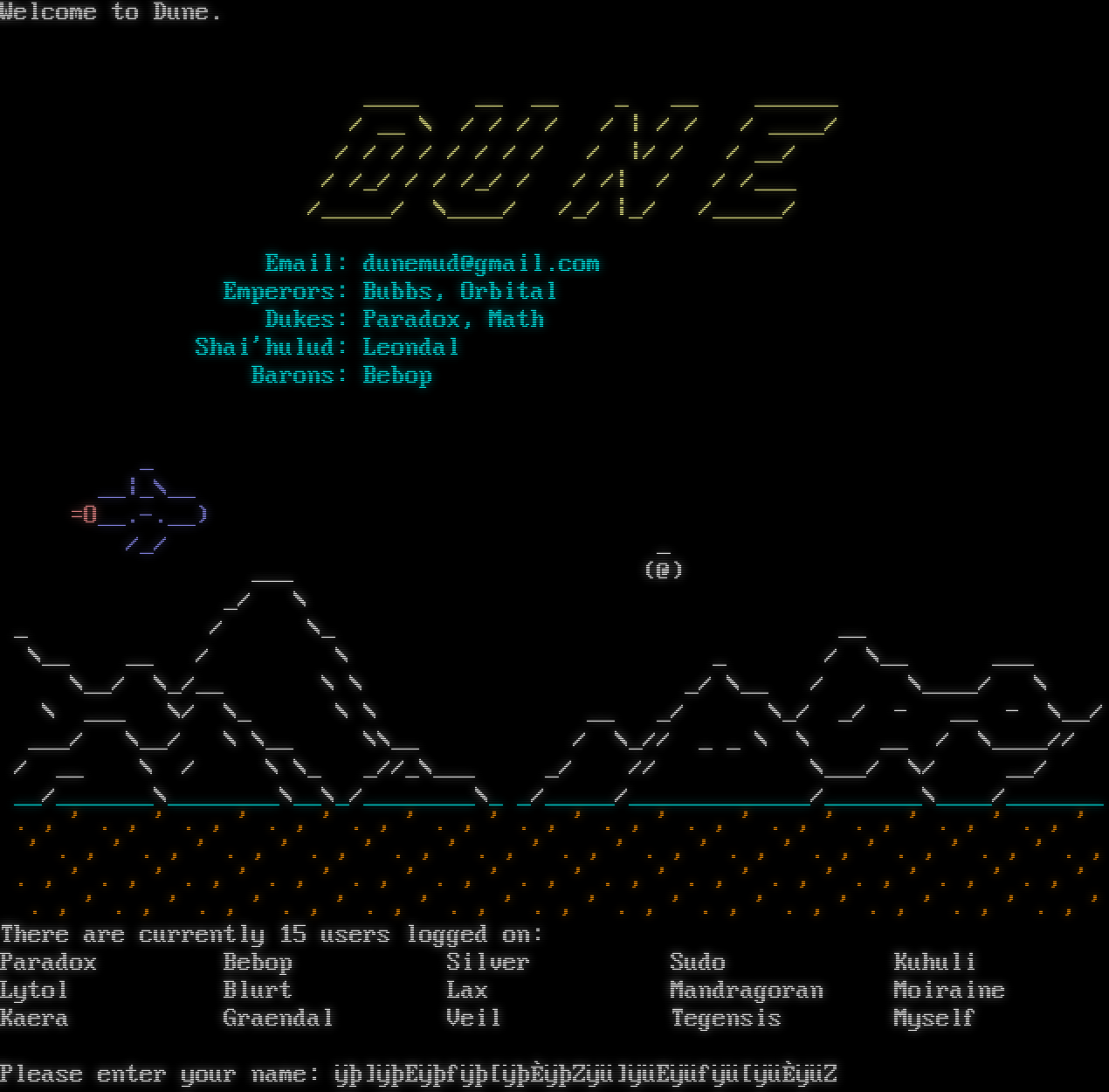 "banner_before_return": "Welcome to Dune.\r\n\r\n\r\n\u001b[1;33m ____ __ __ _ __ ______\u001b[0m\r\n\u001b[1;33m / __ \\ / / / / / | / / / ____/\u001b[0m\r\n\u001b[1;33m / / / / / / / / / |/ / / __/ \u001b[0m\r\n\u001b[1;33m / /_/ / / /_/ / / /| / / /___ \u001b[0m\r\n\u001b[1;33m /_____/ \\____/ /_/ |_/ /_____/ \u001b[0m\r\n\r\n\u001b[36m Email: dunemud@gmail.com \u001b[0m\r\n\u001b[36m Emperors: Bubbs, Orbital \u001b[0m\r\n\u001b[36m Dukes: Paradox, Math \u001b[0m\r\n\u001b[36m Shai'hulud: Leondal \u001b[0m\r\n\u001b[36m Barons: Bebop \u001b[0m\r\n \r\n \r\n \u001b[1;34m _\u001b[0m\r\n \u001b[1;34m __|_\\__\u001b[0m\r\n \u001b[1;31m=O\u001b[1;34m__.-.__)\u001b[0m\r\n \u001b[1;34m /_/ \u001b[1;37m _ \u001b[0m\r\n ___ \u001b[1;37m(@)\u001b[0m\r\n _/ \\ \r\n _ / \\_ __\r\n \\__ __ / \\ _ / \\__ ___ \r\n \\__/ \\_/__ \\ \\ _/ \\__ / \\____/ \\ \r\n \\ ___ \\/ \\_ \\ \\ __ _/ \\_/ _/ - __ - \\__/\r\n ___/ \\__/ \\ \\__ \\\\__ / \\_// _ _ \\ \\ __ / \\____// \r\n / __ \\ / \\ \\_ _//_\\___ _/ // \\___/ \\/ __/ \r\n\u001b[36m __\u001b[0m/\u001b[36m_______\u001b[0m\\\u001b[36m________\u001b[0m\\\u001b[36m__\u001b[0m\\\u001b[36m_\u001b[0m/\u001b[36m________\u001b[0m\\\u001b[36m_ _\u001b[0m/\u001b[36m_____\u001b[0m/\u001b[36m_____________\u001b[0m/\u001b[36m_______\u001b[0m\\\u001b[36m____\u001b[0m/\u001b[36m_______\u001b[0m\r\n\u001b[33m . , ' . , ' . , ' . , ' . , ' . , ' . , ' . , ' . , ' . , ' . , ' . , ' . , ' \u001b[0m \r\n\u001b[33m ' . , ' . , ' . , ' . , ' . , ' . , ' . , ' . , ' . , ' . , ' . , ' . , ' . ,\u001b[0m\r\n\u001b[33m . , ' . , ' . , ' . , ' . , ' . , ' . , ' . , ' . , ' . , ' . , ' . , ' . , ' \u001b[0m\r\n\u001b[33m . , ' . , ' . , ' . , ' . , ' . , ' . , ' . , ' . , ' . , ' . , ' . , ' . , '\u001b[0m\r\nThere are currently 15 users logged on:\r\nParadox Bebop Silver Sudo Kuhuli \r\nLytol Blurt Lax Mandragoran Moiraine \r\nKaera Graendal Veil Tegensis Myself \r\n\r\nPlease enter your name: \udcc3\udcbf\udcc3\udcbe]\udcc3\udcbf\udcc3\udcbeE\udcc3\udcbf\udcc3\udcbef\udcc3\udcbf\udcc3\udcbe[\udcc3\udcbf\udcc3\udcbe\udcc3\udc88\udcc3\udcbf\udcc3\udcbeZ\udcc3\udcbf\udcc3\udcbc]\udcc3\udcbf\udcc3\udcbcE\udcc3\udcbf\udcc3\udcbcf\udcc3\udcbf\udcc3\udcbc[\udcc3\udcbf\udcc3\udcbc\udcc3\udc88\udcc3\udcbf\udcc3\udcbcZ",