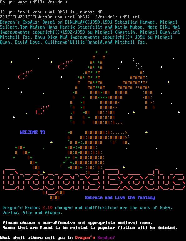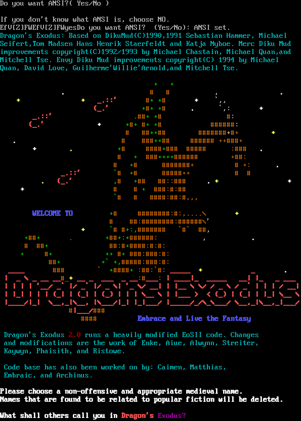 "banner_after_return": "If you don't know what ANSI is, choose NO.\n\rEfV[Z]FWEfV[Z]FWyesDo you want ANSI? (Yes/No): \u0000ANSI set.\n\r\u001b[0;0;36mDragon's Exodus: Based on DikuMud(C)1990,1991 Sebastian Hammer, Michael\n\rSeifert,Tom Madsen Hans Henrik Staerfeldt and Katja Nyboe. Merc Diku Mud\n\rimprovements copyright(C)1992/1993 by Michael Chastain, Michael Quan,and\n\rMitchell Tse. Envy Diku Mud improvements copyright(C) 1994 by Michael\n\rQuan, David Love, Guilherme'Willie'Arnold,and Mitchell Tse.\n\r \n\r \u001b[0;0;32m + +\n\r \u001b[0;1;37m . \u001b[0;0;33m # # \u001b[0;0;37m , \u001b[0;1;37m .\n\r \u001b[0;1;33m + + \u001b[0;1;31m _.::' \u001b[0;0;33m #\u001b[0;0;32m+ +\u001b[0;0;33m# \u001b[0;1;37m + \u001b[0;0;37m`,,\n\r \u001b[0;1;31m (_.' \u001b[0;0;32m+\u001b[0;0;33m#\u001b[0;0;32m+ +\u001b[0;0;33m# \u001b[0;1;37m. \u001b[0;0;37m `,: \u001b[0;1;37m +\n\r \u001b[0;1;31m _.::' \u001b[0;0;32m.\u001b[0;0;33m##\u001b[0;0;32m+ +\u001b[0;0;33m# \u001b[0;0;33m#\u001b[0;0;37m:\n\r \u001b[0;1;31m (_.' \u001b[0;1;37m + \u001b[0;0;32m+\u001b[0;0;33m#\u001b[0;0;32m+ \u001b[0;0;33m#\u001b[0;0;32m+ +\u001b[0;0;33m# \u001b[0;0;33m######\u001b[0;0;37m:\n\r \u001b[0;0;33m # \u001b[0;0;33m##\u001b[0;0;32m++\u001b[0;0;33m## \u001b[0;0;33m#######\u001b[0;0;37m+\u001b[0;0;33m#+ \u001b[0;1;33m +\n\r \u001b[0;1;37m. \u001b[0;0;33m# \u001b[0;0;33m###\u001b[0;0;32m++\u001b[0;0;33m## \u001b[0;0;33m###### ++###+\n\r \u001b[0;1;37m+ \u001b[0;1;33m. \u001b[0;0;32m+\u001b[0;0;33m# ####\u001b[0;0;32m+\u001b[0;0;33m### ##### :### \u001b[0;1;37m.\n\r \u001b[0;0;33m # \u001b[0;0;32m+ \u001b[0;0;33m###\u001b[0;0;32m++++\u001b[0;0;33m###### +##:\n\r \u001b[0;0;33m # \u001b[0;0;32m+\u001b[0;0;33m# #######+ # \u001b[0;0;33m+\u001b[0;0;33m: \u001b[0;1;37m .\n\r \u001b[0;1;31m _.::' \u001b[0;0;32m`\u001b[0;0;33m# \u001b[0;0;32m+\u001b[0;0;33m# #####++ # #\n\r \u001b[0;1;33m . \u001b[0;1;31m(_.' \u001b[0;0;32m,\u001b[0;0;33m# \u001b[0;0;32m+\u001b[0;0;33m## ##::### \u001b[0;1;37m. \u001b[0;1;33m+ \u001b[0;1;37m +\n\r \u001b[0;1;37m + \u001b[0;0;33m # # \u001b[0;0;32m+ \u001b[0;0;33m###:#:##\n\r \u001b[0;0;32m`\u001b[0;0;33m# # ####:##:#,,, \n\r \u001b[0;1;34mWELCOME TO \u001b[0;0;32m+\u001b[0;0;33m# ########:#:,....\\ \u001b[0;1;33m+\n\r \u001b[0;0;33m # ##:########:######\\\u001b[0;0;37m'\n\r \u001b[0;1;33m + \u001b[0;0;32m`\u001b[0;0;33m# #\u001b[0;0;32m+:,\u001b[0;0;33m####### `#` ##\u001b[0;0;37m,\n\r \u001b[0;0;32m+\u001b[0;0;33m##\u001b[0;0;32m+ . \u001b[0;0;32m+\u001b[0;0;33m##\u001b[0;0;32m+:+\u001b[0;0;33m######: \u001b[0;0;37m, \u001b[0;1;37m.\n\r \u001b[0;0;33m# ##\u001b[0;0;32m+ \u001b[0;0;33m##\u001b[0;0;32m:\u001b[0;0;33m#\u001b[0;0;32m+\u001b[0;0;33m####:#:#:\n\r \u001b[0;0;32m+ \u001b[0;0;33m#\u001b[0;0;32m+ \u001b[0;0;32m++ \u001b[0;0;33m#\u001b[0;0;32m+ \u001b[0;0;33m###:###:#:\n\r \u001b[0;0;33m##\u001b[0;0;32m+ \u001b[0;0;32m+` +,\u001b[0;0;33m#####:###:#:\n\r \u001b[0;1;31m ____ \u001b[0;0;33m### ` \u001b[0;0;32m+\u001b[0;0;33m####\u001b[0;0;32m+ \u001b[0;0;33m:##:`#: \u001b[0;1;31m_____ \u001b[0;1;33m+ \u001b[0;1;31m _ \u001b[0;1;37m .\n\r \u001b[0;1;31m| _ \\ _ __ __\u001b[0;0;33m#_\u001b[0;1;33m+ \u001b[0;1;31m__ _ ___ _ __\u001b[0;0;33m:#\u001b[0;1;31m___\u001b[0;0;33m:\u001b[0;1;31m | ____|_ _____ __| |_ _ ___\n\r | | | | '__/ _` |/ _` |/ _ \\| '_ \\/ __| | |__ \\ \\/ / _ \\ / _` | | | / __|\n\r | |_| | | | (_| | (_| | (_) | | | \\__ \\ | |___ > < (_) | (_| | |_| \\__ \\\n\r |____/|_| \\__,_|\\__, |\\___/|_| |_|___/ |_____/_/\\_\\___/ \\__,_|\\__,_|___/\n\r \u001b[0;0;33m#\u001b[0;1;31m|___/\u001b[0;0;33m###\n\r #### \u001b[0;1;34mEmbrace and Live the Fantasy\n\r \n\r\u001b[0;0;36m Dragon's Exodus \u001b[0;0;31m2.0 \u001b[0;0;36mruns a heavily modified EoSII code. Changes\n\r and modifications are the work of Enke, Aiue, Alwynn, Streiter,\n\r Kaywyn, Phaisith, and Ristowe.\n\r \n\r Code base has also been worked on by: Caimen, Matthias,\n\r Embraic, and Archinus.\n\r \n\r\u001b[0;1;37mPlease choose a non-offensive and appropriate medieval name.\n\rNames that are found to be related to popular fiction will be deleted.\n\r \n\rWhat shall others call you in \u001b[0;1;31mDragon's \u001b[0;0;35mExodus?\n\r\u0000",
