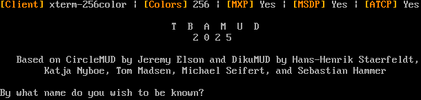 "banner_before_return": "\r\nAttempting to Detect Client, Please Wait...\r\n\u001b[7z\u001b[7z\r\n\u001b[H\u001b[J\u001b[38;5;214m[\u001b[38;5;208mClient\u001b[38;5;214m] \u001b[38;5;145mxterm-256color\u001b[0;00m | \u001b[38;5;214m[\u001b[38;5;208mColors\u001b[38;5;214m] \u001b[38;5;145m256\u001b[0;00m | \u001b[38;5;214m[\u001b[38;5;208mMXP\u001b[38;5;214m] \u001b[38;5;145mYes\u001b[0;00m | \u001b[38;5;214m[\u001b[38;5;208mMSDP\u001b[38;5;214m] \u001b[38;5;145mYes\u001b[0;00m | \u001b[38;5;214m[\u001b[38;5;208mATCP\u001b[38;5;214m] \u001b[38;5;145mYes\u001b[0;00m\r\n\r\n T B A M U D\r\n 2 0 2 5 \r\n\r\n Based on CircleMUD by Jeremy Elson and DikuMUD by Hans-Henrik Staerfeldt,\r\n Katja Nyboe, Tom Madsen, Michael Seifert, and Sebastian Hammer\r\n\r\nBy what name do you wish to be known? ",