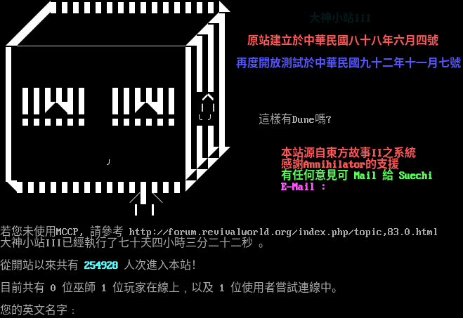 ◢███████████████◣ ◢◤ ◢█ 大神小站III ◢◤ ◢██ ◢◤ ◢███ 原站建立於中華民國八十八年六月四號 █ ̄ ̄ ̄ ̄ ̄ ̄ ̄ ̄ ̄ ̄ ̄ ̄ ̄ ̄ ̄████ █ ████ 再度開放測試於中華民國九十二年十一月七號 █ ████ █ ▃▃▃▃▃▃ ▃▃▃▃▃▃ ████ █ ██████ ██████ █ /\\ █ █ ██◤◥██ ██◤◥██ █∣∣█ █ ▅▅▅▅▅▅ ▅▅▅▅▅▅ █╰╯█ 這樣有Dune嗎? █ ████ █ ████ █ ██◤◤ 本站源自東方故事II之系統 █ ╯ █◤◤ 感謝Annihilator的支援 █ ◤◤ 有任何意見可 Mail 給 Suechi ◥███████████████◤ E-Mail : /█\ ▍ ▍ 若您未使用MCCP, 請參考 http://forum.revivalworld.org/index.php/topic,83.0.html 大神小站III已經執行了七十天四小時三十二秒 。 從開站以來共有 254925 人次進入本站! 目前共有 0 位巫師 1 位玩家在線上﹐以及 2 位使用者嘗試連線中。 您的英文名字﹕