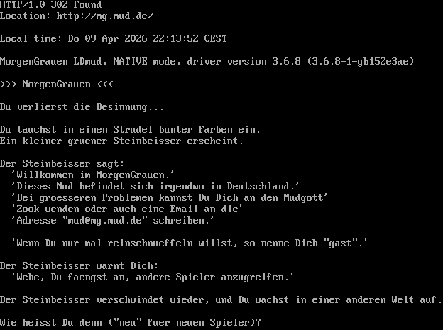 "banner_before_return": "HTTP/1.0 302 Found\r\nLocation: http://mg.mud.de/\r\n\r\nLocal time: Do 09 Apr 2026 22:13:52 CEST\r\n\r\nMorgenGrauen LDmud, NATIVE mode, driver version 3.6.8 (3.6.8-1-gb152e3ae)\r\n\r\n>>> MorgenGrauen <<<\r\n\r\nDu verlierst die Besinnung...\r\n\r\nDu tauchst in einen Strudel bunter Farben ein.\r\nEin kleiner gruener Steinbeisser erscheint.\r\n\r\nDer Steinbeisser sagt:\r\n 'Willkommen im MorgenGrauen.'\r\n 'Dieses Mud befindet sich irgendwo in Deutschland.'\r\n 'Bei groesseren Problemen kannst Du Dich an den Mudgott'\r\n 'Zook wenden oder auch eine Email an die'\r\n 'Adresse \"mud@mg.mud.de\" schreiben.'\r\n\r\n 'Wenn Du nur mal reinschnueffeln willst, so nenne Dich \"gast\".'\r\n\r\nDer Steinbeisser warnt Dich:\r\n 'Wehe, Du faengst an, andere Spieler anzugreifen.'\r\n\r\nDer Steinbeisser verschwindet wieder, und Du wachst in einer anderen Welt auf.\r\n\r\nWie heisst Du denn (\"neu\" fuer neuen Spieler)? ",