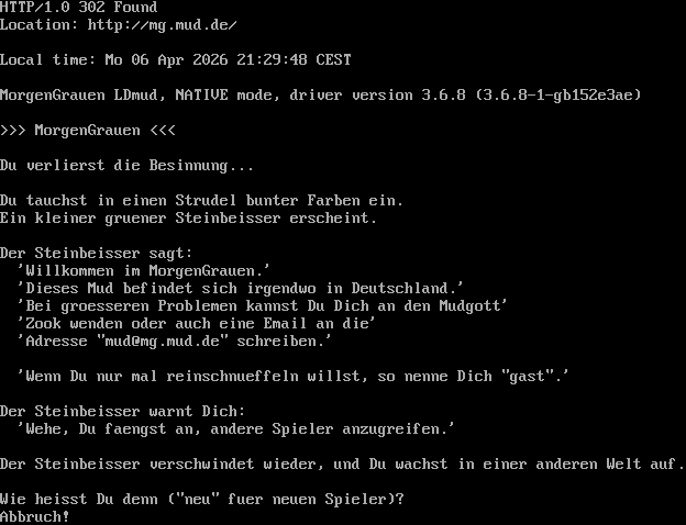 "banner_before_return": "HTTP/1.0 302 Found\r\nLocation: http://mg.mud.de/\r\n\r\nLocal time: Mo 06 Apr 2026 21:29:48 CEST\r\n\r\nMorgenGrauen LDmud, NATIVE mode, driver version 3.6.8 (3.6.8-1-gb152e3ae)\r\n\r\n>>> MorgenGrauen <<<\r\n\r\nDu verlierst die Besinnung...\r\n\r\nDu tauchst in einen Strudel bunter Farben ein.\r\nEin kleiner gruener Steinbeisser erscheint.\r\n\r\nDer Steinbeisser sagt:\r\n 'Willkommen im MorgenGrauen.'\r\n 'Dieses Mud befindet sich irgendwo in Deutschland.'\r\n 'Bei groesseren Problemen kannst Du Dich an den Mudgott'\r\n 'Zook wenden oder auch eine Email an die'\r\n 'Adresse \"mud@mg.mud.de\" schreiben.'\r\n\r\n 'Wenn Du nur mal reinschnueffeln willst, so nenne Dich \"gast\".'\r\n\r\nDer Steinbeisser warnt Dich:\r\n 'Wehe, Du faengst an, andere Spieler anzugreifen.'\r\n\r\nDer Steinbeisser verschwindet wieder, und Du wachst in einer anderen Welt auf.\r\n\r\nWie heisst Du denn (\"neu\" fuer neuen Spieler)? ",