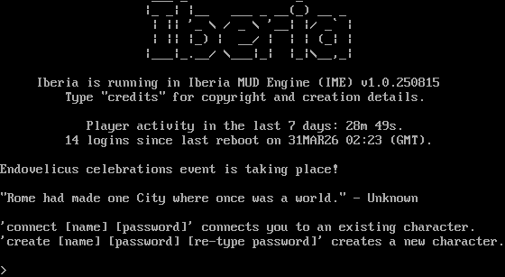 "banner_before_return": " ___ _ _ \n\r |_ _| |__ ___ _ __(_) __ _ \n\r | || '_ \\ / _ \\ '__| |/ _` |\n\r | || |_) | __/ | | | (_| |\n\r |___|_.__/ \\___|_| |_|\\__,_|\n\r\n\r Iberia is running in Iberia MUD Engine (IME) v1.0.250815\n\r Type \"credits\" for copyright and creation details.\n\r\n\r Player activity in the last 7 days: 28m 49s.\n\r 14 logins since last reboot on 31MAR26 02:23 (GMT).\n\r\n\rEndovelicus celebrations event is taking place!\n\r\n\r\"Rome had made one City where once was a world.\" - Unknown\n\r\n\r'connect [name] [password]' connects you to an existing character.\n\r'create [name] [password] [re-type password]' creates a new character.\n\r\u001b[0m\n\r>\u001b[0m\n\r\r\n\u001b[6z<!ELEMENT EXPIRE '<EXPIRE>'><!ELEMENT RName FLAG=\"RoomName\"><!ELEMENT RDesc FLAG=\"RoomDesc\"><!ELEMENT RExits FLAG=\"RoomExit\"><!ELEMENT Ex '<SEND \"&text;|look &text;\" EXPIRE=\"ime\">'><!ELEMENT Help '<SEND \"help &text;\">'><!ELEMENT FHelp '<SEND \"&text;\">'><!ELEMENT Item '<SEND \"look &text;|get &text;\" EXPIRE=\"ime\">'><!ELEMENT OIItem '<SEND \"look &text;|wear &text;|wield &text;|remove &text;|drop &text;\" EXPIRE=\"ime\">'><!ELEMENT Board '<SEND \"read\" EXPIRE=\"ime\">'><!ELEMENT NPC '<SEND \"look &text;|kill &text;|consider &text;|align &text;|shape &text;\" EXPIRE=\"ime\">'><!ELEMENT PC '<SEND \"look &text;|kill &text;|consider &text;|align &text;|shape &text;\" EXPIRE=\"ime\">'><!ELEMENT NextPage '<SEND \" \">'><!ELEMENT Prompt FLAG=\"Prompt\"><!ELEMENT Hp FLAG=\"Set hp\"><!ELEMENT MaxHp FLAG=\"Set maxhp\"><!ELEMENT End FLAG=\"Set end\"><!ELEMENT MaxEnd FLAG=\"Set maxend\">\u001b[7z",