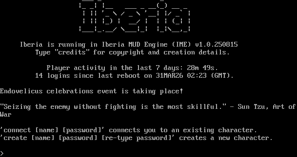 "banner_before_return": " ___ _ _ \n\r |_ _| |__ ___ _ __(_) __ _ \n\r | || '_ \\ / _ \\ '__| |/ _` |\n\r | || |_) | __/ | | | (_| |\n\r |___|_.__/ \\___|_| |_|\\__,_|\n\r\n\r Iberia is running in Iberia MUD Engine (IME) v1.0.250815\n\r Type \"credits\" for copyright and creation details.\n\r\n\r Player activity in the last 7 days: 28m 49s.\n\r 14 logins since last reboot on 31MAR26 02:23 (GMT).\n\r\n\rEndovelicus celebrations event is taking place!\n\r\n\r\"Seizing the enemy without fighting is the most skillful.\" - Sun Tzu, Art of \n\rWar\n\r\n\r'connect [name] [password]' connects you to an existing character.\n\r'create [name] [password] [re-type password]' creates a new character.\n\r\u001b[0m\n\r>\u001b[0m\n\r\r\n\u001b[6z<!ELEMENT EXPIRE '<EXPIRE>'><!ELEMENT RName FLAG=\"RoomName\"><!ELEMENT RDesc FLAG=\"RoomDesc\"><!ELEMENT RExits FLAG=\"RoomExit\"><!ELEMENT Ex '<SEND \"&text;|look &text;\" EXPIRE=\"ime\">'><!ELEMENT Help '<SEND \"help &text;\">'><!ELEMENT FHelp '<SEND \"&text;\">'><!ELEMENT Item '<SEND \"look &text;|get &text;\" EXPIRE=\"ime\">'><!ELEMENT OIItem '<SEND \"look &text;|wear &text;|wield &text;|remove &text;|drop &text;\" EXPIRE=\"ime\">'><!ELEMENT Board '<SEND \"read\" EXPIRE=\"ime\">'><!ELEMENT NPC '<SEND \"look &text;|kill &text;|consider &text;|align &text;|shape &text;\" EXPIRE=\"ime\">'><!ELEMENT PC '<SEND \"look &text;|kill &text;|consider &text;|align &text;|shape &text;\" EXPIRE=\"ime\">'><!ELEMENT NextPage '<SEND \" \">'><!ELEMENT Prompt FLAG=\"Prompt\"><!ELEMENT Hp FLAG=\"Set hp\"><!ELEMENT MaxHp FLAG=\"Set maxhp\"><!ELEMENT End FLAG=\"Set end\"><!ELEMENT MaxEnd FLAG=\"Set maxend\">\u001b[7z",