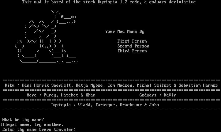 "banner_before_return": "\n\r\u001b[0m\u001b[0m\n\r This mud is based of the stock Dystopia 1.2 code, a godwars deriviative\n\r\n\r \udca0 \\=/,\n\r | @___oo\n\r /\\ /\\ / (___,,,}\n\r ) /^\\) ^\\/ _)\n\r ) /^\\/ _) Your Mud Name By\n\r ) _ / / _)\n\r /\\ )/\\/ || | )_) First Person\n\r < > |(,,) )__) Second Person\n\r || / \\)___)\\ Third Person\n\r | \\____( )___) )___\n\r \\______(_______;;; __;;;\n\r\n\r\n\r\n\r =========================================================================================\n\r Diku : Hans Henrik Saerfelt, Katja Nyboe, Tom Madsen, Michal Seifert & Sebastian Hammer\n\r =========================================================================================\n\r Merc : Furey, Hatchet & Khan Godwars : KaVir\n\r =========================================================================================\n\r Dystopia : Vladd, Tarasque, Dracknuur & Jobo\n\r =========================================================================================\n\r\n\r What be thy name? \u001b[0m",