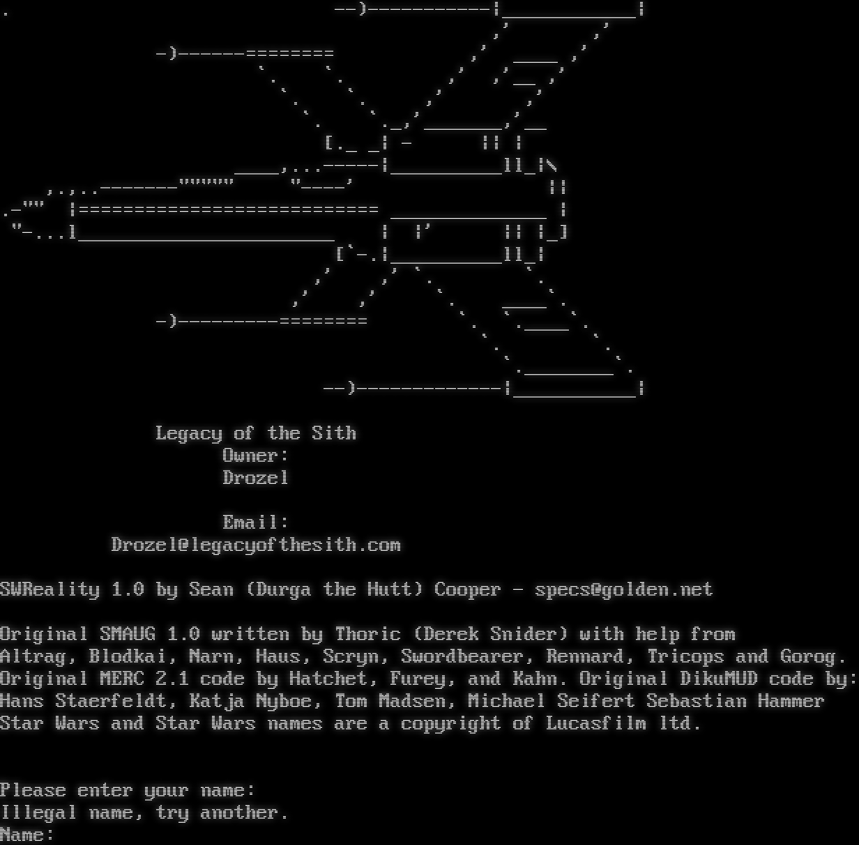 "banner_before_return": "\n\r. --)-----------|____________| \n\r ,' ,'\n\r -)------======== ,' ____ ,'\n\r `. `. ,' ,'__ ,'\n\r `. `. ,' ,'\n\r `. `._,'_______,'__\n\r [._ _| - || |\n\r ____,...-----|__________ll_|\\\n\r ,.,..-------\"\"\"\"\" \"----' ||\n\r.-\"\" |=========================== ______________ |\n\r \"-...l_______________________ | |' || |_]\n\r [`-.|__________ll_|\n\r ,' ,' `. `.\n\r ,' ,' `. ____`.\n\r -)---------======== `. `.____`.\n\r `. `.\n\r `.________`.\n\r --)-------------|___________|\n\r \n\r Legacy of the Sith\n\r Owner:\n\r Drozel\n\r\n\r Email:\n\r Drozel@legacyofthesith.com\n\r \n\rSWReality 1.0 by Sean (Durga the Hutt) Cooper - specs@golden.net\n\r\n\rOriginal SMAUG 1.0 written by Thoric (Derek Snider) with help from \n\rAltrag, Blodkai, Narn, Haus, Scryn, Swordbearer, Rennard, Tricops and Gorog.\n\rOriginal MERC 2.1 code by Hatchet, Furey, and Kahn. Original DikuMUD code by:\n\rHans Staerfeldt, Katja Nyboe, Tom Madsen, Michael Seifert Sebastian Hammer\n\rStar Wars and Star Wars names are a copyright of Lucasfilm ltd.\n\r\n\r \n\rPlease enter your name:\n\r",