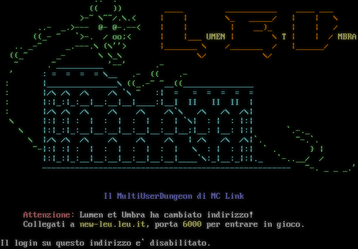 "banner_before_return": "\u001b[7z\u001b[70;201m\u001b[0;40;1;32m .. .\r\n\r\u001b[0;40;1;32m (( )) \u001b[0;40;33m ____ ___________ ____ ___\r\n\r\u001b[0;40;1;32m >-~ \\~~/.\\.< \u001b[0;40;33m| | \\_ _____/ | | \\\r\n\r\u001b[0;40;1;32m ..- _.>--- @- @-.--< \u001b[0;40;33m| | | __)_ | | /\r\n\r\u001b[0;40;1;32m ((_- ~ `>-. / oo;< \u001b[0;40;33m| |___ \u001b[0;40;1;33mUMEN \u001b[0;40;33m| \\ \u001b[0;40;1;33mT \u001b[0;40;33m| | / \u001b[0;40;1;33mMBRA\r\n\r\u001b[0;40;1;32m .. _-~ _.---.\\ (\\''> \u001b[0;40;33m|_______ \\ /_______ / |______/\r\n\r\u001b[0;40;1;32m ((_~ _- \\ \\_\\ \u001b[0;40;33m \\/ \\/\r\n\r\u001b[0;40;1;32m ~ \u001b[0;40;1;36m \u001b[0;40;1;32m.~\u001b[0;40;1;36m__________ \u001b[0;40;1;32m'--' .-\r\n\r\u001b[0;40;1;32m ' \u001b[0;40;1;36m: = = = = \\__ \u001b[0;40;1;32m.- (( .-\r\n\r\u001b[0;40;1;32m : \u001b[0;40;1;36m|_______________\\ \u001b[0;40;1;32m((_.-~ ~\u001b[0;40;1;36m__\u001b[0;40;1;32m((\u001b[0;40;1;36m_______________\r\n\r\u001b[0;40;1;32m : \u001b[0;40;1;36m|/\\ /\\ /\\ /\\ `\\ \u001b[0;40;1;32m~\u001b[0;40;1;36m :| = = = = = =\r\n\r\u001b[0;40;1;32m : \u001b[0;40;1;36m|:|_:|_:__|__:__|__|____:|__I II II II |\r\n\r\u001b[0;40;1;32m : \u001b[0;40;1;36m|/\\ /\\ /\\ /\\ /\\ /\\`\\ /\\ /\\ /\\|\r\n\r\u001b[0;40;1;32m \\ \u001b[0;40;1;36m|:| :| : | : | : | : | `\\| : | : |:|\u001b[0;40;1;32m\r\n\r\u001b[0;40;1;32m \\ \u001b[0;40;1;36m|:|_:|_:__|__:__|__:__|__:__|__;|__: |__: |:|\u001b[0;40;1;32m `.-._\r\n\r\u001b[0;40;1;32m \\ \u001b[0;40;1;36m|/\\ /\\ /\\ /\\ /\\ /\\ | /\\ /\\ /\\|\u001b[0;40;1;32m`. ~-.`.\r\n\r\u001b[0;40;1;32m ~-\u001b[0;40;1;36m|:| :| : | : | : | : | \\ : | : |:| \u001b[0;40;1;32m` . } |\r\n\r\u001b[0;40;1;36m |:|_:|_:__|__:__|__:__|__:__|____`\\:_|__:_|:|._ \u001b[0;40;1;32m`-..__/ /\r\n\r\u001b[0;40;1;36m ----------------------------------------------------- \u001b[0;40;1;32m~-. _ _ _.'\r\n\r\n\r\n\r \u001b[0;40;1;34mIl MultiUserDungeon di MC Link\r\n\r\n\r\u001b[0;40;37m\u001b[71;201m \u001b[0;40;1;31mAttenzione: \u001b[0;40;1;37mLumen et Umbra ha cambiato indirizzo!\u001b[0;40;1;31m\r\n\r \u001b[0;40;1;37mCollegati a \u001b[0;40;1;33mnew-leu.leu.it\u001b[0;40;1;37m, porta \u001b[0;40;1;33m6000\u001b[0;40;1;37m per entrare in gioco.\u001b[0;40;37m\r\n\r\n\r\u001b[0;40;37mIl login su questo indirizzo e` disabilitato.",
