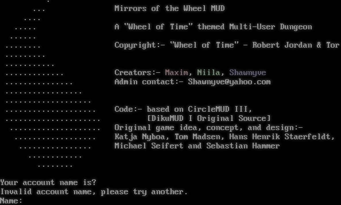 "banner_before_return": "\r\n\u001b[40m\u001b[1;37m . \u001b[0m\r\n\u001b[40m\u001b[1;37m ... \u001b[0m Mirrors of the Wheel MUD \r\n\u001b[40m\u001b[1;37m .... \u001b[0m\r\n\u001b[40m\u001b[1;37m ..... \u001b[0m A \"Wheel of Time\" themed Multi-User Dungeon\r\n\u001b[40m\u001b[1;37m ...... \u001b[0m\r\n\u001b[40m\u001b[1;37m ........ \u001b[0m Copyright:- \"Wheel of Time\" - Robert Jordan & Tor\r\n\u001b[40m\u001b[1;37m ......... \u001b[0m\r\n\u001b[40m\u001b[1;37m ........... \u001b[0m\r\n\u001b[40m\u001b[1;37m ............. \u001b[0m Creators:- \u001b[1;31mMaxim\u001b[0m, \u001b[1;32mNiila\u001b[0m, \u001b[1;34mShawnyve\u001b[0m\r\n\u001b[40m\u001b[1;37m ............... \u001b[0m Admin contact:- Shawnyve@yahoo.com \r\n\u001b[40m\u001b[1;37m ................. \u001b[0m\r\n\u001b[40m\u001b[1;37m ................... \u001b[0m\r\n\u001b[40m\u001b[1;37m .................... \u001b[0m Code:- based on CircleMUD III, \r\n\u001b[40m\u001b[1;37m ..................... \u001b[0m [DikuMUD I Original Source]\r\n\u001b[40m\u001b[1;37m .................... \u001b[0m Original game idea, concept, and design:-\r\n\u001b[40m\u001b[1;37m .................. \u001b[0m Katja Nyboa, Tom Madsen, Hans Henrik Staerfeldt,\r\n\u001b[40m\u001b[1;37m ................ \u001b[0m Michael Seifert and Sebastian Hammer\r\n\u001b[40m\u001b[1;37m ............ \u001b[0m\r\n\u001b[40m\u001b[1;37m ........ \u001b[0m \r\nPlease wait...\u001b[2K\n\rYour account name is? ",
