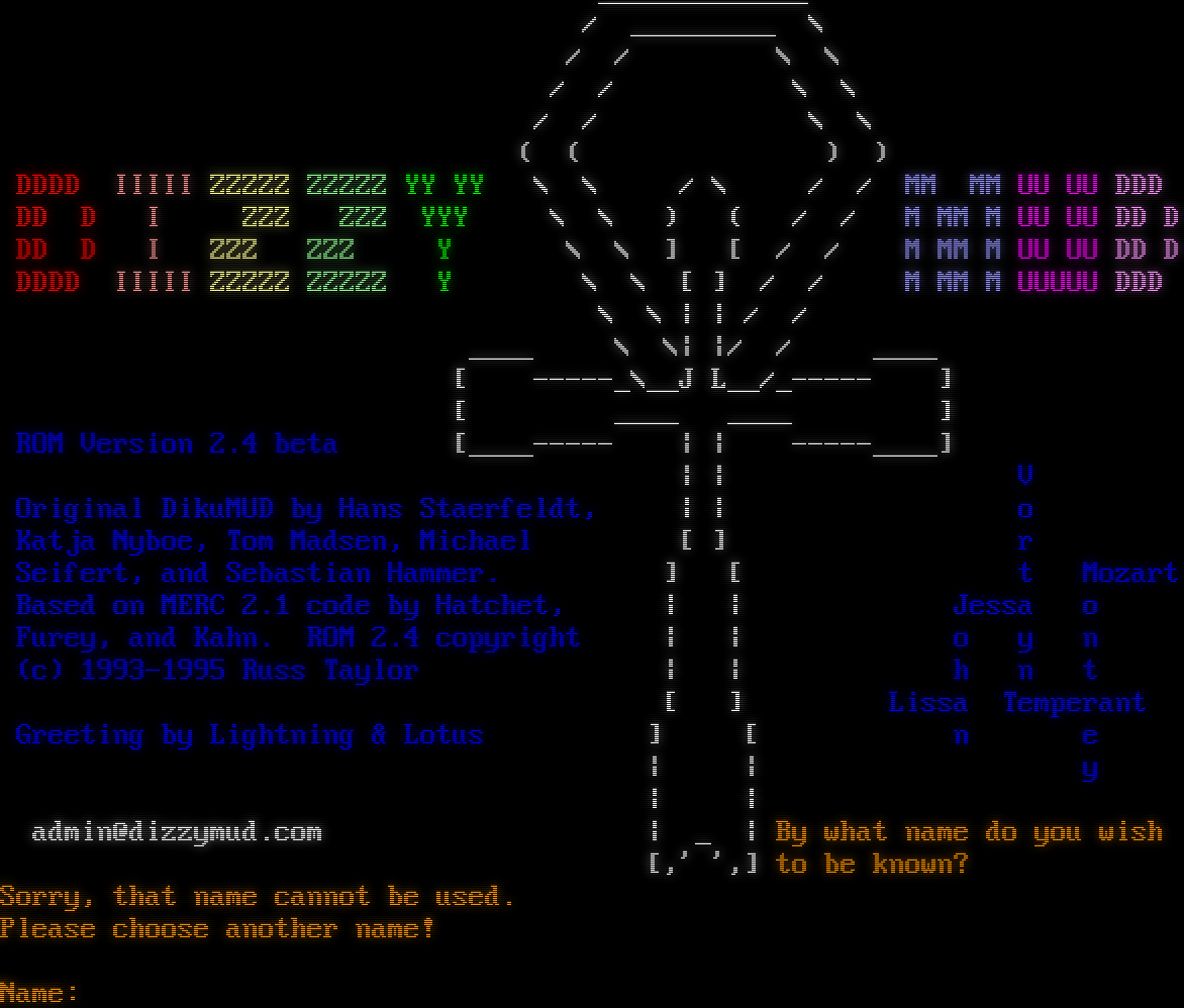 - Telnet: telnet://mud.dizzymud.com:4000