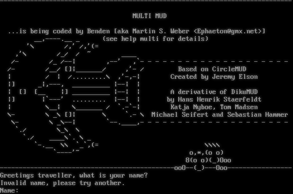 "banner_before_return": "\r\n\r\n-----------------------------------------------------------------------------\r\n \r\n MULTI MUD\r\n\r\n ...is being coded by Benden [aka Martin S. Weber <Ephaeton@gmx.net>]\r\n __,----.__ _ (see help multi for details)\r\n '\\ /,' /,'(=\r\n ,'\\ /_/ / ~ ____ \r\n /- /_ /--| ,--' ,`- - - - - - - - - - - - - - - - - - - -\r\n /- /__/ []|_______/ ,'- / Based on CircleMUD\r\n | / | /.........\\ ,'-,-| Created by Jeremy Elson\r\n |] _|,---, __________ |--| | \r\n | [] [__ |] __________ |--| | A derivative of DikuMUD\r\n |] |`---' ......... |--| | by Hans Henrik Staerfeldt\r\n | \\__| \\_______ / `.-`-| Katja Nyboe, Tom Madsen\r\n \\- \\ _\\ []| \\ `.- \\ Michael Seifert and Sebastian Hammer\r\n \\- \\ _\\--| `--.____,- - - - - - - - - - - - - - - - - - - -\r\n `./ \\_\\ \\\r\n `./ ____\\`. \\ _\r\n `-.__ \\\\ `_`,(= \\\\\\\\\r\n `----'~ o,*,(o o)\r\n 8(o o)(_)Ooo\r\n----------------------------------------------ooO--(_)---Ooo-----------------\r\nGreetings traveller, what is your name? ",