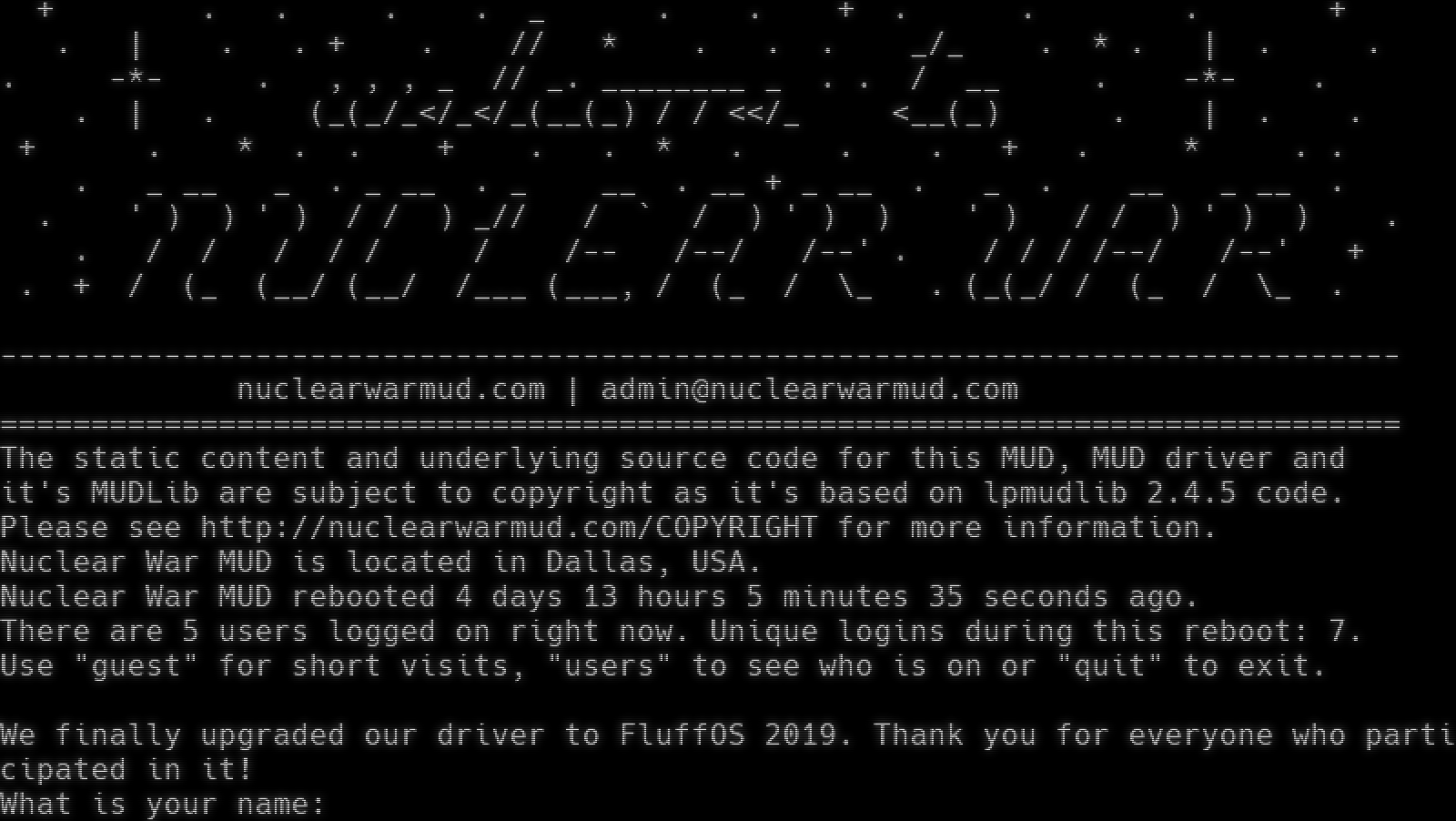 "banner_before_return": "\r\n + . . . . _ . . + . . . +\r\n . | . . + . // * . . . _/_ . * . | . .\r\n. -*- . , , , _ // _. ________ _ . . / __ . -*- .\r\n . | . (_(_/_</_</_(__(_) / / <</_ <__(_) . | . .\r\n + . * . . + . . * . . . + . * . .\r\n . _ __ _ . _ __ . _ __ . __ + _ __ . _ . __ _ __ .\r\n . ' ) ) ' ) / / ) _// / ` / ) ' ) ) ' ) / / ) ' ) ) .\r\n . / / / / / / /-- /--/ /--' . / / / /--/ /--' +\r\n . + / (_ (__/ (__/ /___ (___, / (_ / \\_ . (_(_/ / (_ / \\_ .\r\n\r\n-----------------------------------------------------------------------------\r\n nuclearwarmud.com | admin@nuclearwarmud.com\r\n=============================================================================\r\nThe static content and underlying source code for this MUD, MUD driver and\r\nit's MUDLib are subject to copyright as it's based on lpmudlib 2.4.5 code.\r\nPlease see http://nuclearwarmud.com/COPYRIGHT for more information.\r\nNuclear War MUD is located in Dallas, USA.\r\nNuclear War MUD rebooted 4 days 13 hours 5 minutes 35 seconds ago.\r\nThere are 5 users logged on right now. Unique logins during this reboot: 7.\r\nUse \"guest\" for short visits, \"users\" to see who is on or \"quit\" to exit.\r\n\r\nWe finally upgraded our driver to FluffOS 2019. Thank you for everyone who participated in it!\r\nWhat is your name: ",