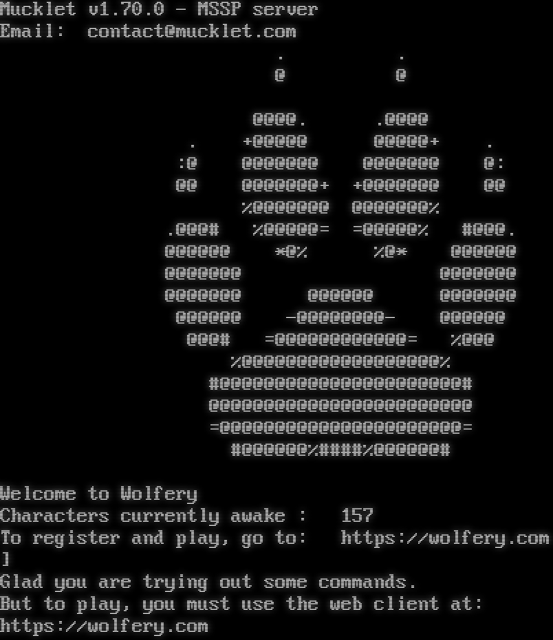 "banner_after_return": "Glad you are trying out some commands.\r\nBut to play, you must use the web client at:\r\nhttps://wolfery.com\r\n",