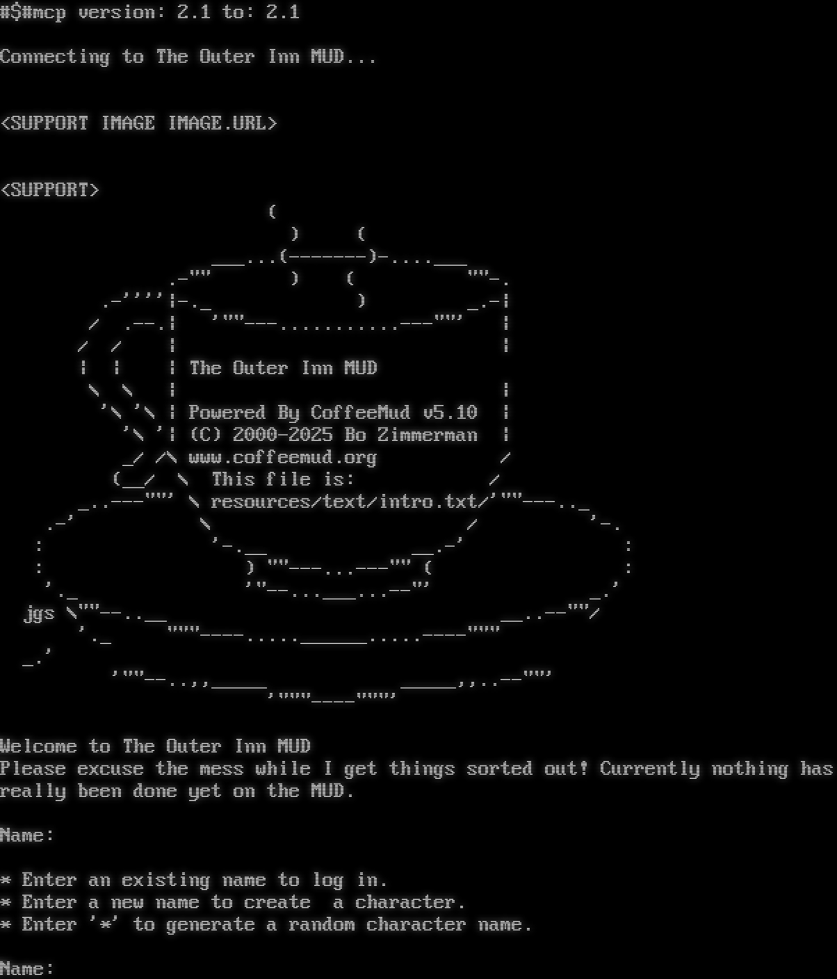 Server requested (accepted): GMCP, MCCP2, MSDP, MSP, MSSP, MXP, NEW_ENVIRON, TTYPE