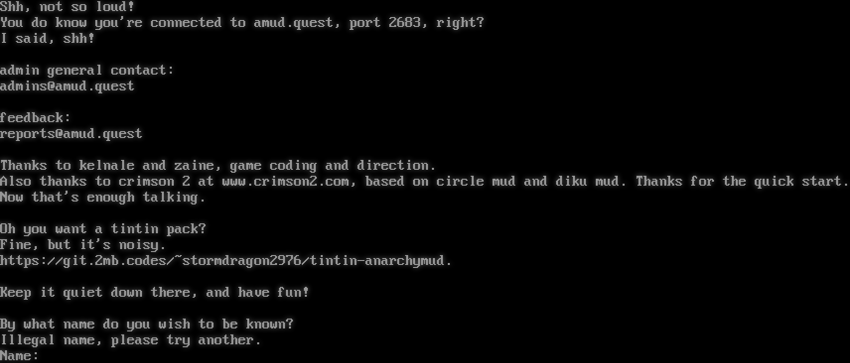 Server requested (accepted): ATCP, CHARSET, MXP, NAWS, TTYPE