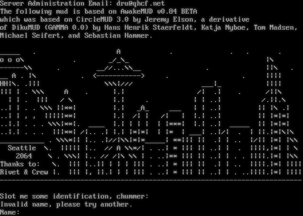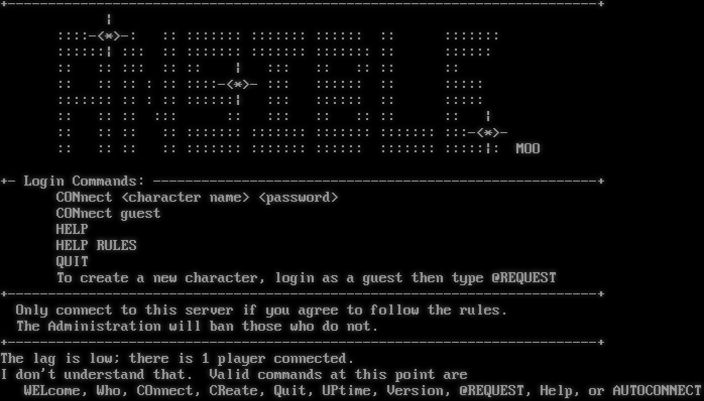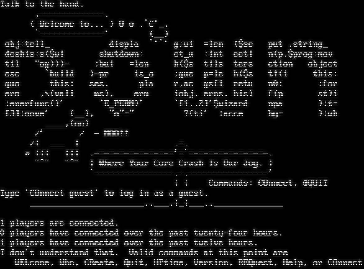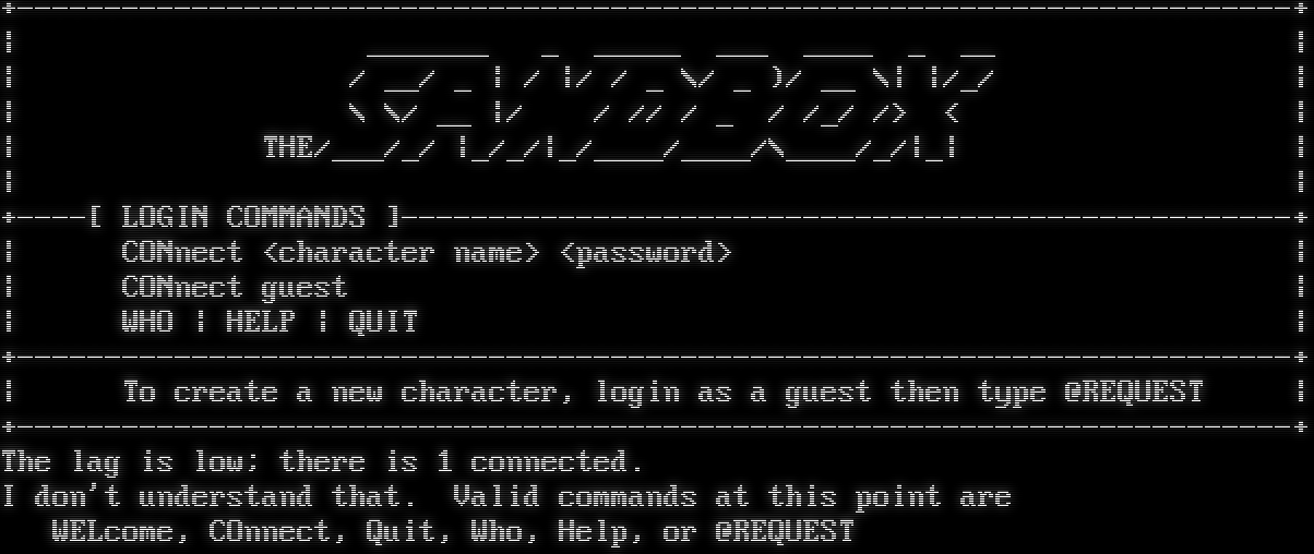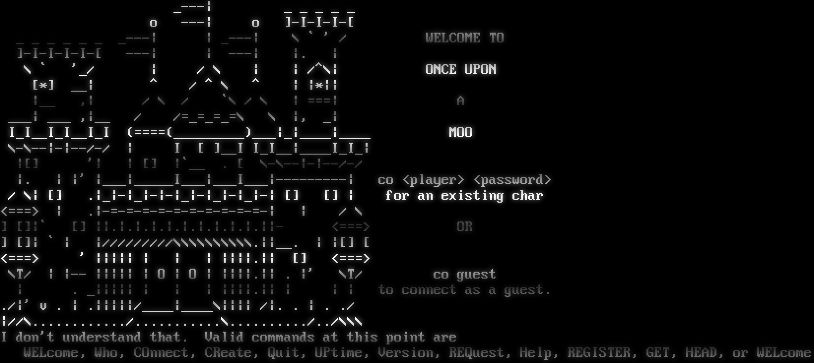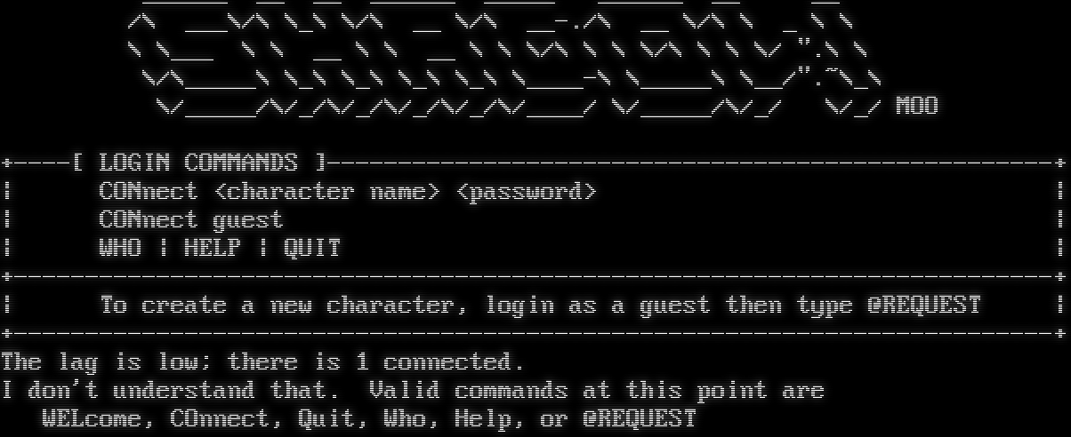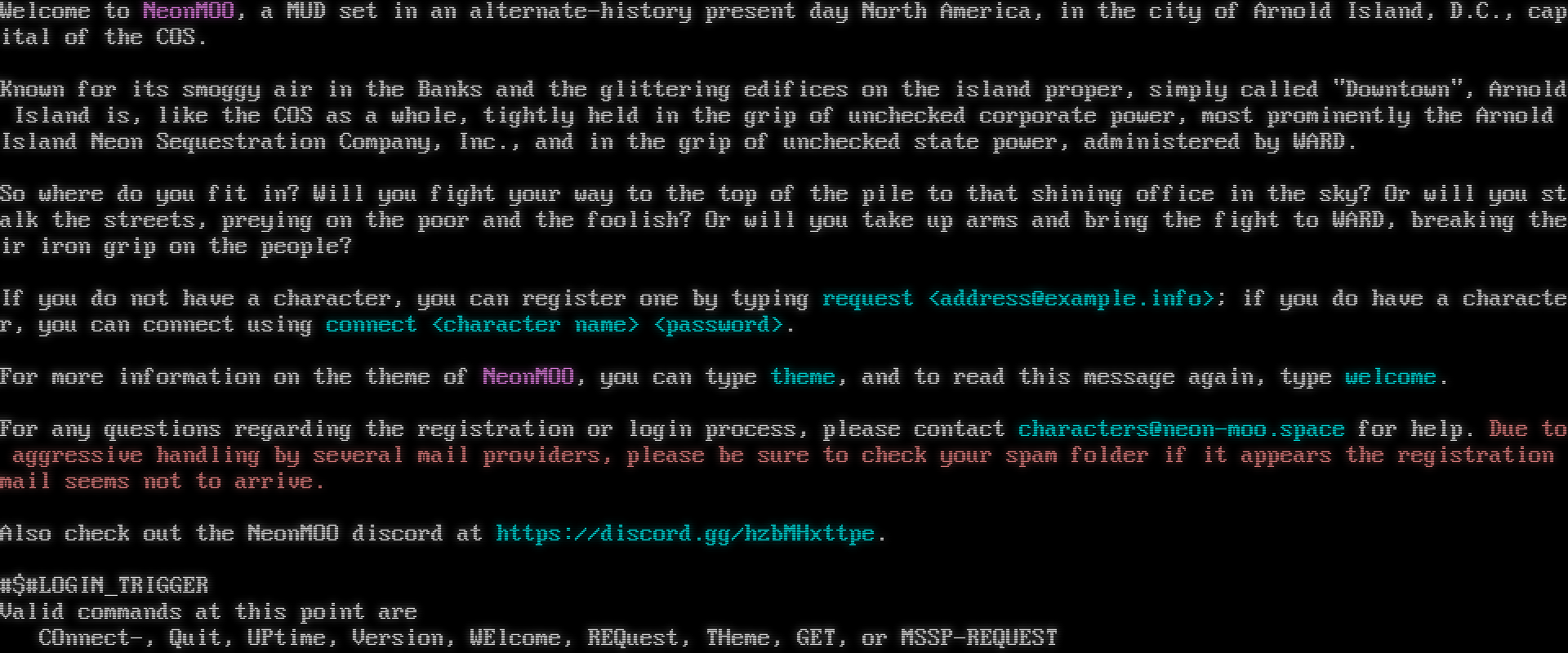 Welcome to NeonMOO, a MUD set in an alternate-history present day North America, in the city of Arnold Island, D.C., capital of the COS. Known for its smoggy air in the Banks and the glittering edifices on the island proper, simply called "Downtown", Arnold Island is, like the COS as a whole, tightly held in the grip of unchecked corporate power, most prominently the Arnold Island Neon Sequestration Company, Inc., and in the grip of unchecked state power, administered by WARD. So where do you fit in? Will you fight your way to the top of the pile to that shining office in the sky? Or will you stalk the streets, preying on the poor and the foolish? Or will you take up arms and bring the fight to WARD, breaking their iron grip on the people? If you do not have a character, you can register one by typing request <address@example.info>; if you do have a character, you can connect using connect <character name> <password>. For more information on the theme of NeonMOO, you can type theme, and to read this message again, type welcome. For any questions regarding the registration or login process, please contact characters@neon-moo.space for help. Due to aggressive handling by several mail providers, please be sure to check your spam folder if it appears the registration mail seems not to arrive. Also check out the NeonMOO discord at https://discord.gg/hzbMHxttpe. #$#LOGIN_TRIGGER Valid commands at this point are COnnect-, Quit, UPtime, Version, WElcome, REQuest, THeme, GET, or MSSP-REQUEST