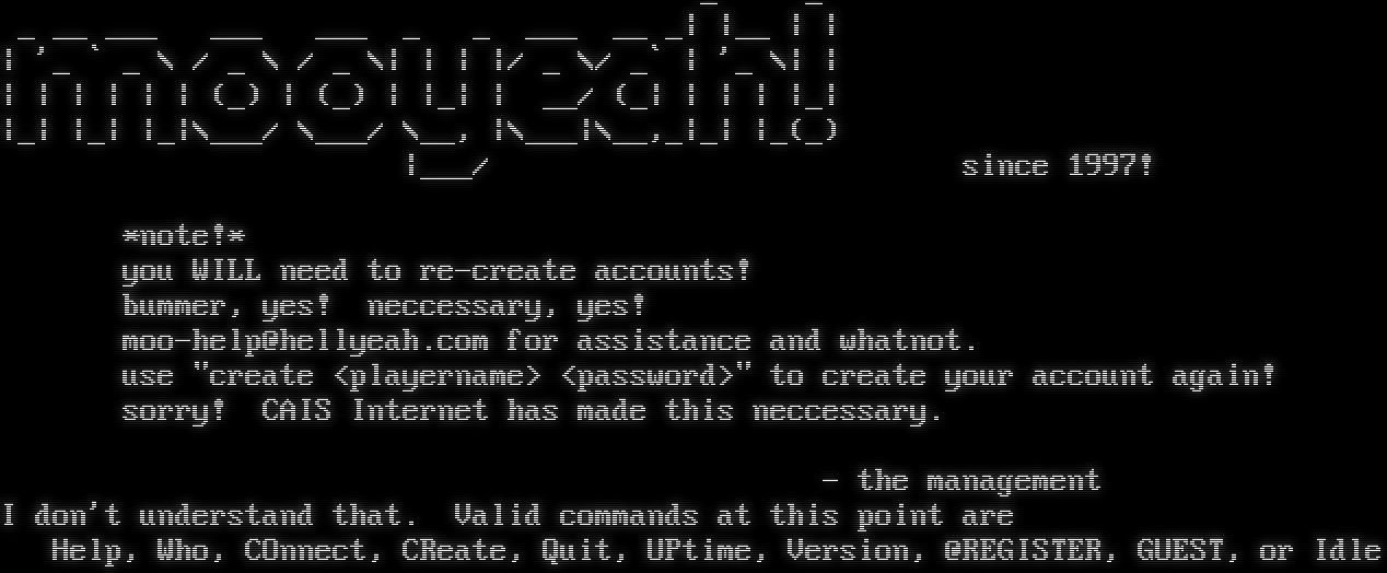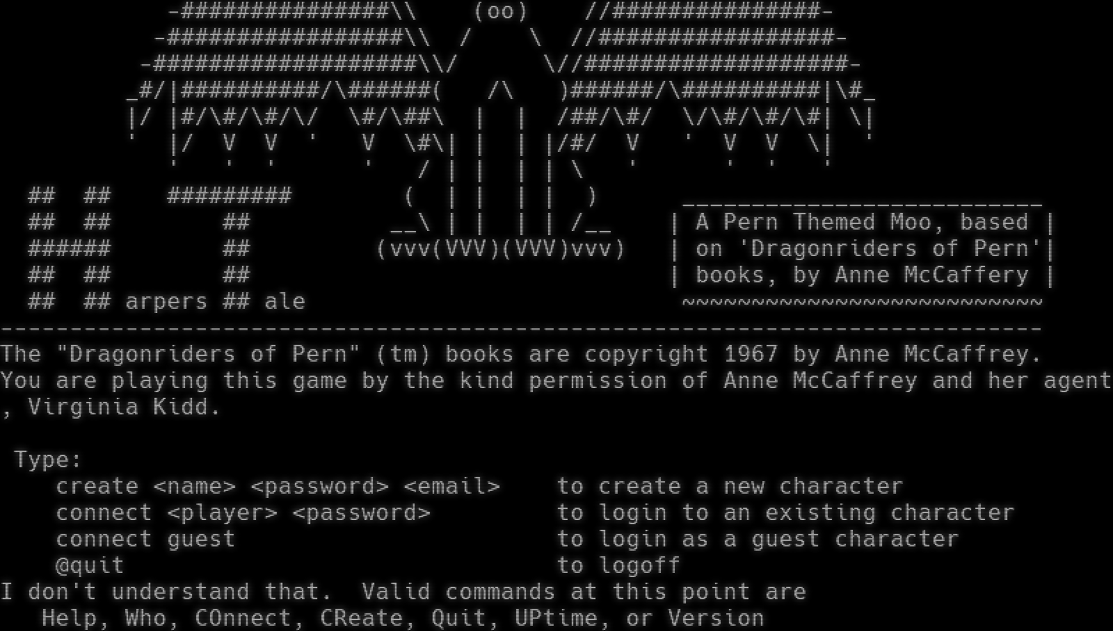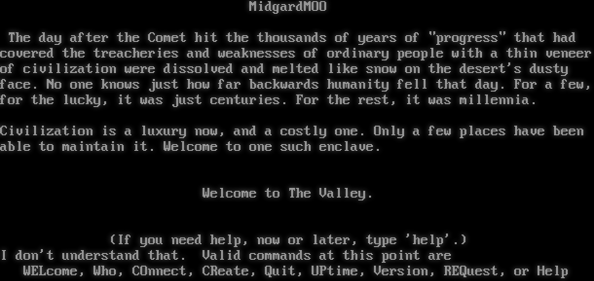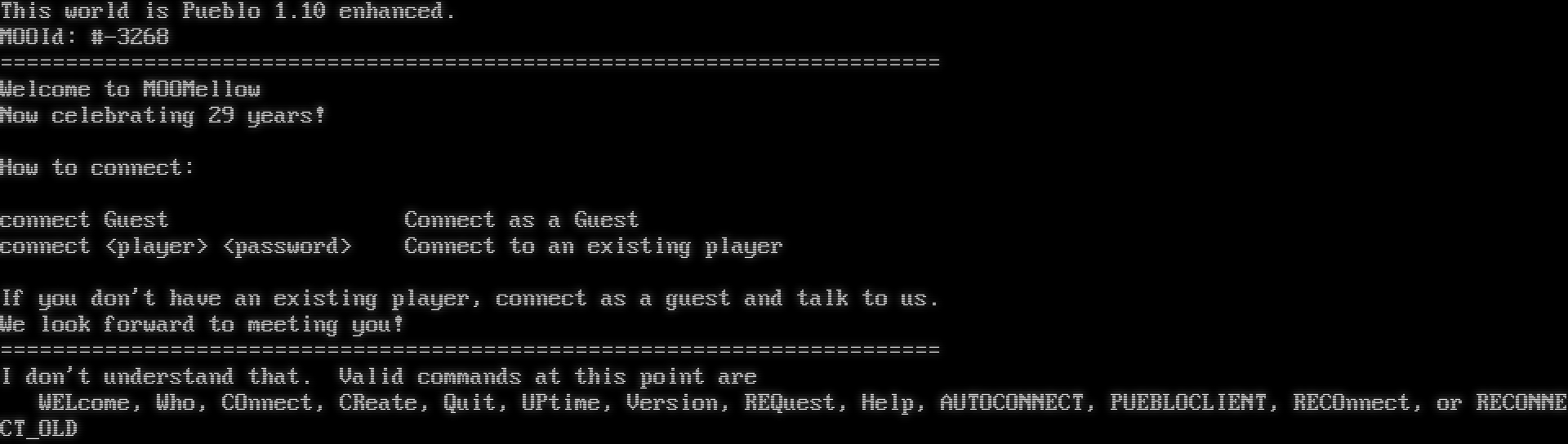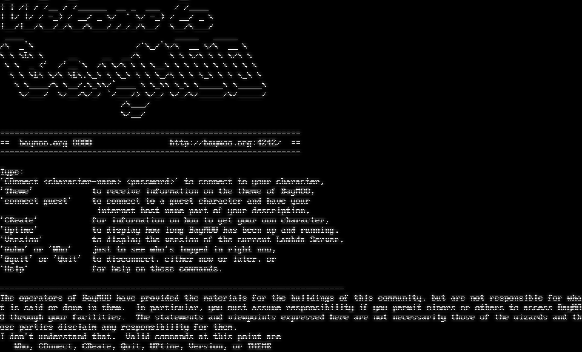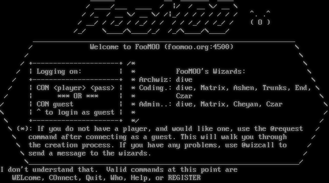 Welcome to NeonMOO, a MUD set in an alternate-history present day North America, in the city of Arnold Island, D.C., capital of the COS. Known for its smoggy air in the Banks and the glittering edifices on the island proper, simply called "Downtown", Arnold Island is, like the COS as a whole, tightly held in the grip of unchecked corporate power, most prominently the Arnold Island Neon Sequestration Company, Inc., and in the grip of unchecked state power, administered by WARD. So where do you fit in? Will you fight your way to the top of the pile to that shining office in the sky? Or will you stalk the streets, preying on the poor and the foolish? Or will you take up arms and bring the fight to WARD, breaking their iron grip on the people? If you do not have a character, you can register one by typing request <address@example.info>; if you do have a character, you can connect using connect <character name> <password>. For more information on the theme of NeonMOO, you can type theme, and to read this message again, type welcome. For any questions regarding the registration or login process, please contact characters@neon-moo.space for help. Due to aggressive handling by several mail providers, please be sure to check your spam folder if it appears the registration mail seems not to arrive. Also check out the NeonMOO discord at https://discord.gg/hzbMHxttpe. #$#LOGIN_TRIGGER Valid commands at this point are COnnect-, Quit, UPtime, Version, WElcome, REQuest, THeme, GET, or MSSP-REQUEST