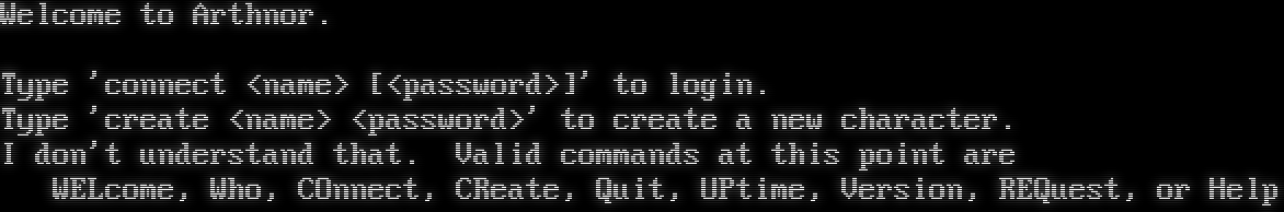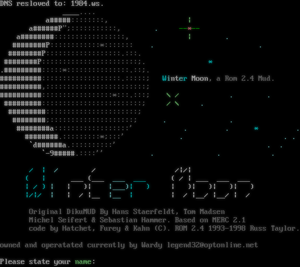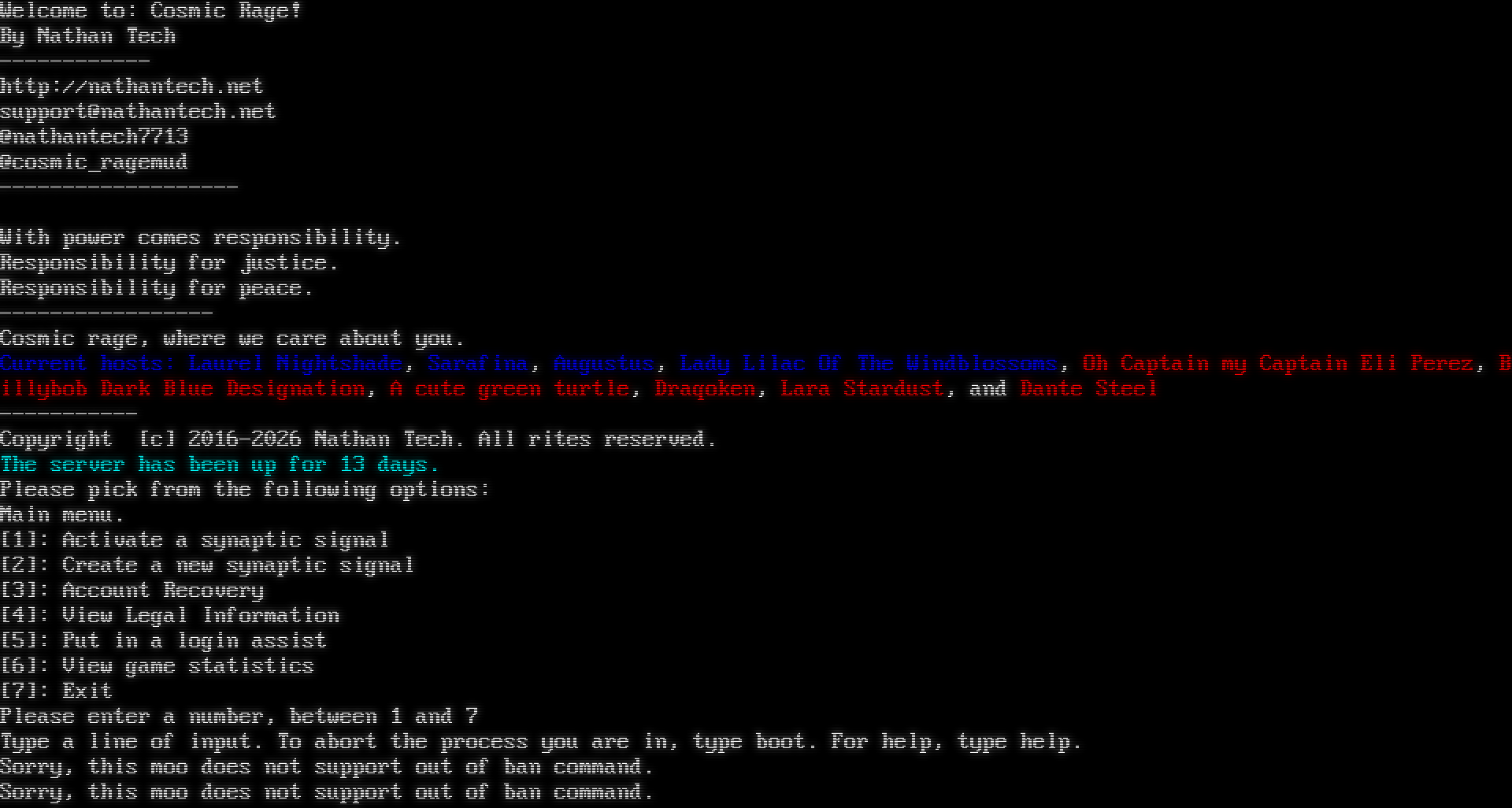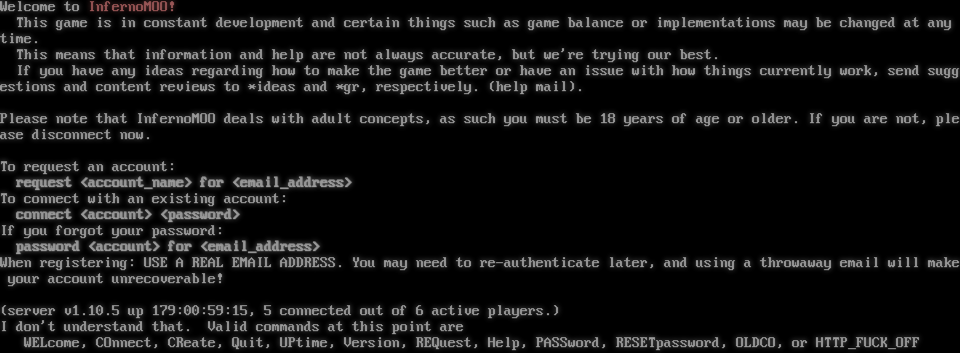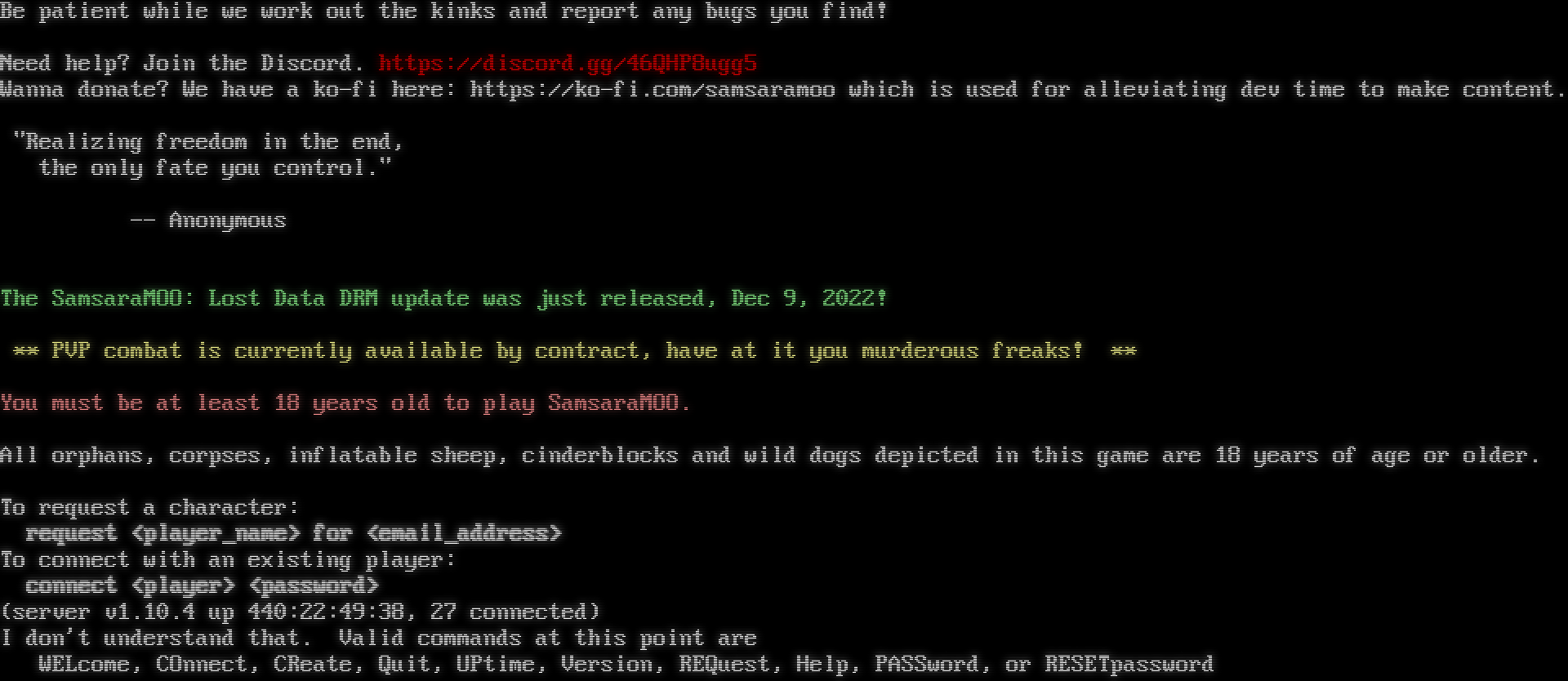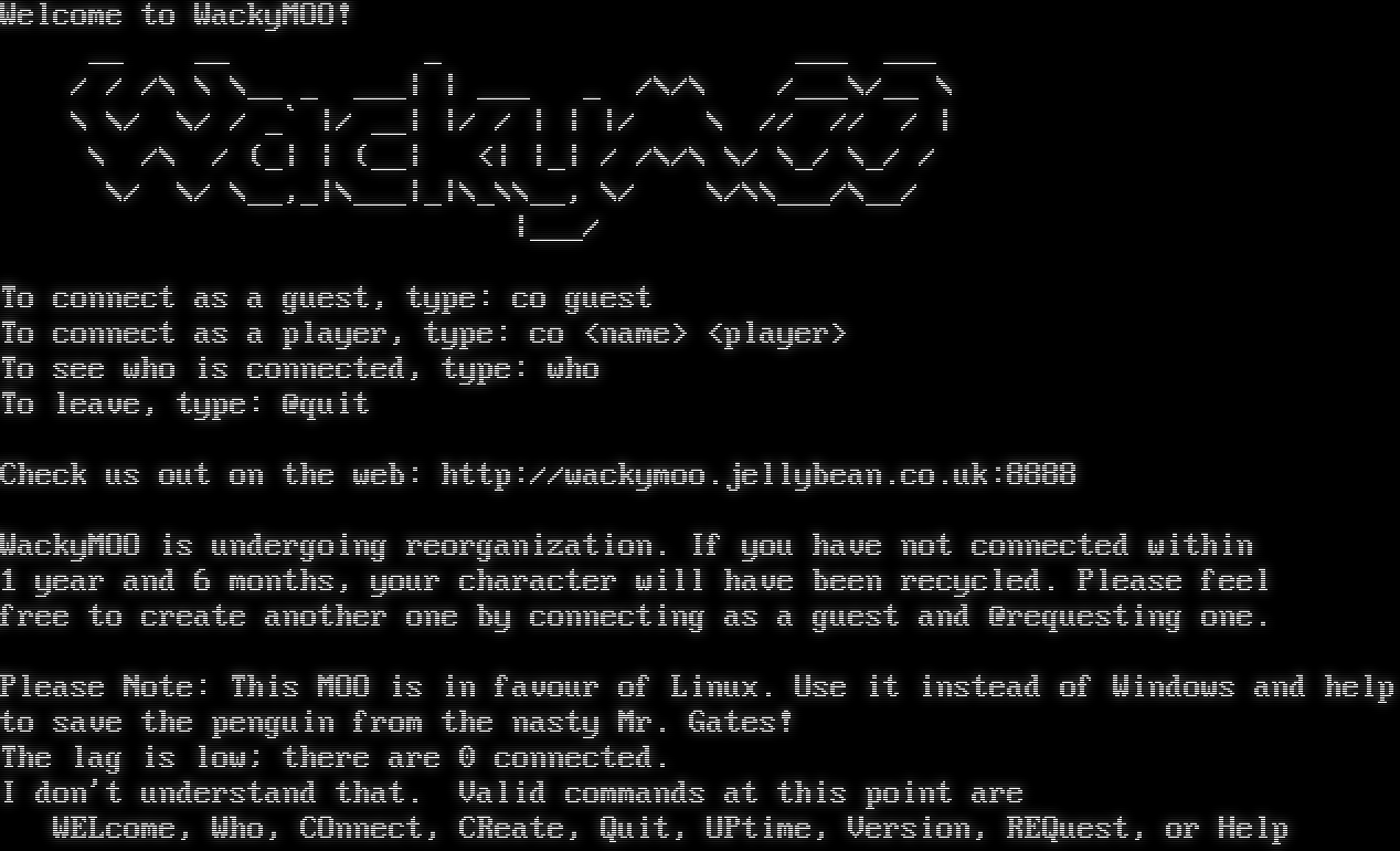 Welcome to NeonMOO, a MUD set in an alternate-history present day North America, in the city of Arnold Island, D.C., capital of the COS. Known for its smoggy air in the Banks and the glittering edifices on the island proper, simply called "Downtown", Arnold Island is, like the COS as a whole, tightly held in the grip of unchecked corporate power, most prominently the Arnold Island Neon Sequestration Company, Inc., and in the grip of unchecked state power, administered by WARD. So where do you fit in? Will you fight your way to the top of the pile to that shining office in the sky? Or will you stalk the streets, preying on the poor and the foolish? Or will you take up arms and bring the fight to WARD, breaking their iron grip on the people? If you do not have a character, you can register one by typing request <address@example.info>; if you do have a character, you can connect using connect <character name> <password>. For more information on the theme of NeonMOO, you can type theme, and to read this message again, type welcome. For any questions regarding the registration or login process, please contact characters@neon-moo.space for help. Due to aggressive handling by several mail providers, please be sure to check your spam folder if it appears the registration mail seems not to arrive. Also check out the NeonMOO discord at https://discord.gg/hzbMHxttpe. #$#LOGIN_TRIGGER Valid commands at this point are COnnect-, Quit, UPtime, Version, WElcome, REQuest, THeme, GET, or MSSP-REQUEST