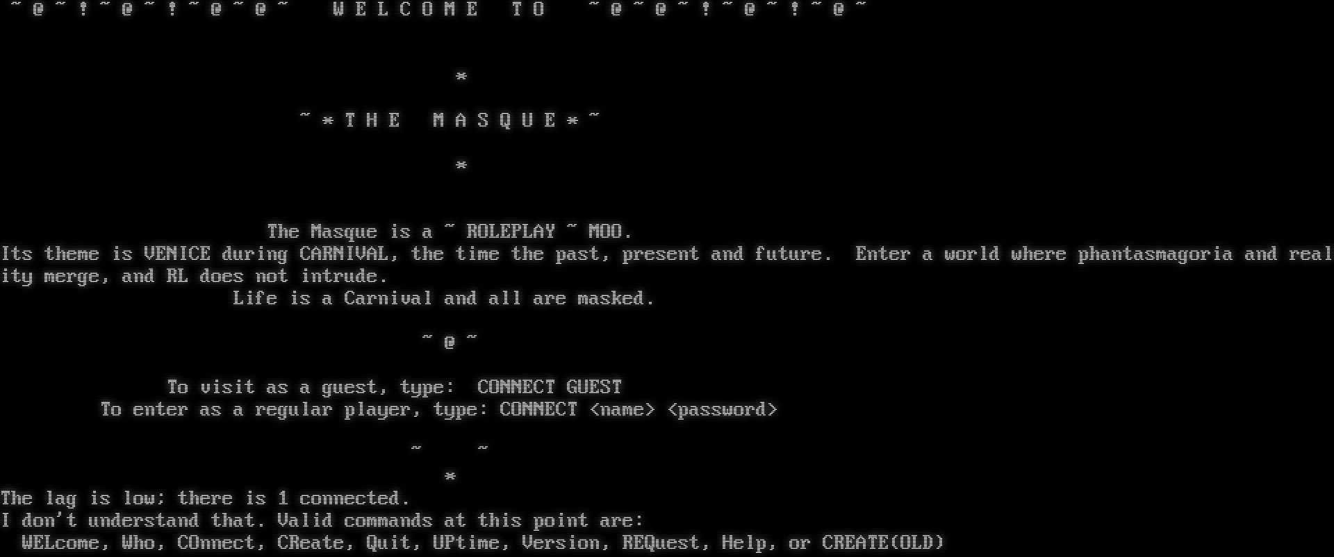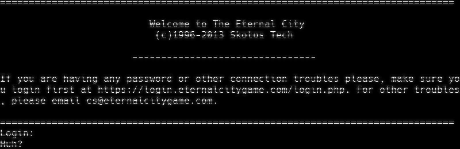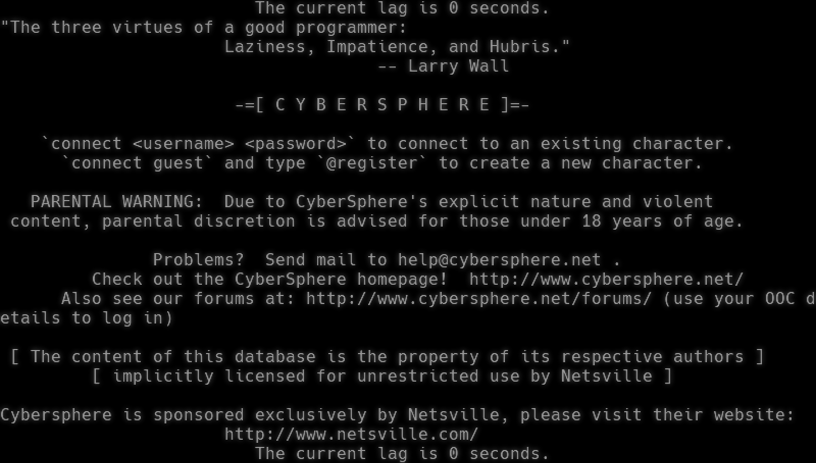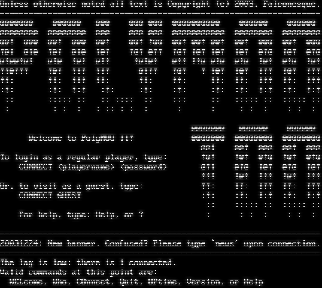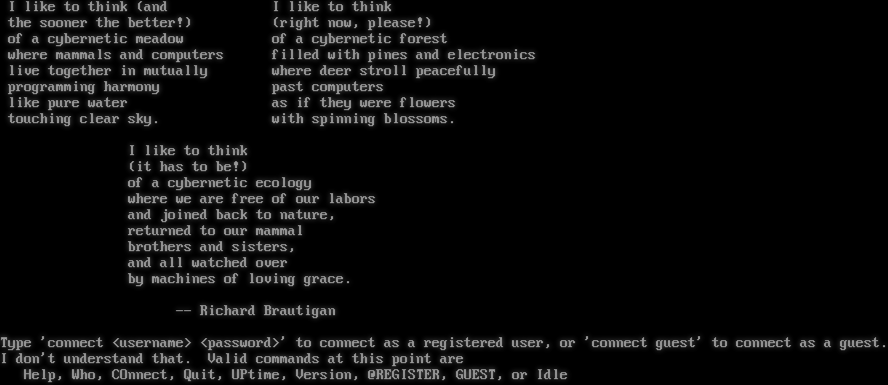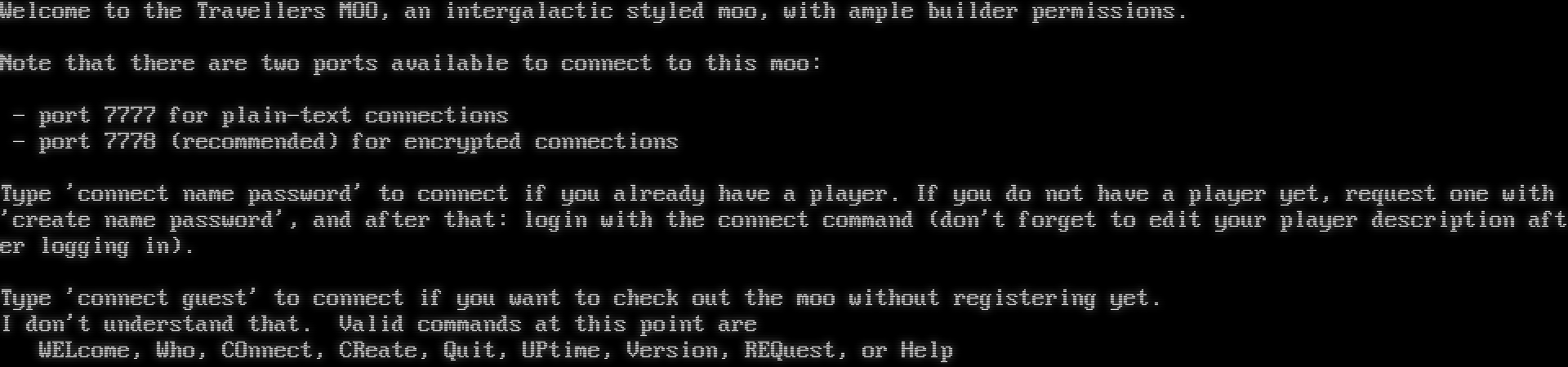 Welcome to NeonMOO, a MUD set in an alternate-history present day North America, in the city of Arnold Island, D.C., capital of the COS. Known for its smoggy air in the Banks and the glittering edifices on the island proper, simply called "Downtown", Arnold Island is, like the COS as a whole, tightly held in the grip of unchecked corporate power, most prominently the Arnold Island Neon Sequestration Company, Inc., and in the grip of unchecked state power, administered by WARD. So where do you fit in? Will you fight your way to the top of the pile to that shining office in the sky? Or will you stalk the streets, preying on the poor and the foolish? Or will you take up arms and bring the fight to WARD, breaking their iron grip on the people? If you do not have a character, you can register one by typing request <address@example.info>; if you do have a character, you can connect using connect <character name> <password>. For more information on the theme of NeonMOO, you can type theme, and to read this message again, type welcome. For any questions regarding the registration or login process, please contact characters@neon-moo.space for help. Due to aggressive handling by several mail providers, please be sure to check your spam folder if it appears the registration mail seems not to arrive. Also check out the NeonMOO discord at https://discord.gg/hzbMHxttpe. #$#LOGIN_TRIGGER Valid commands at this point are COnnect-, Quit, UPtime, Version, WElcome, REQuest, THeme, GET, or MSSP-REQUEST
