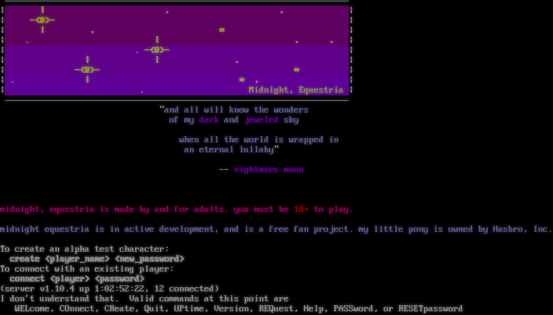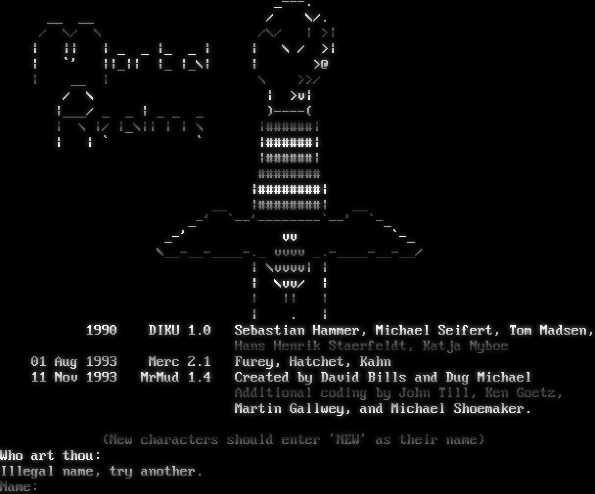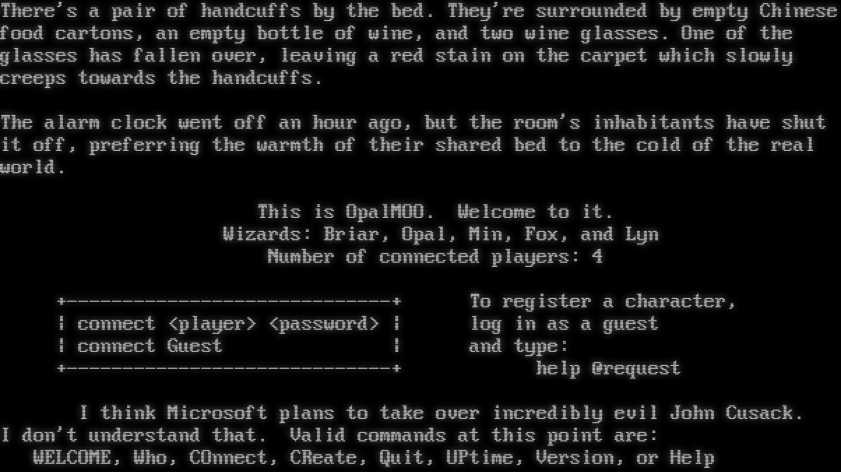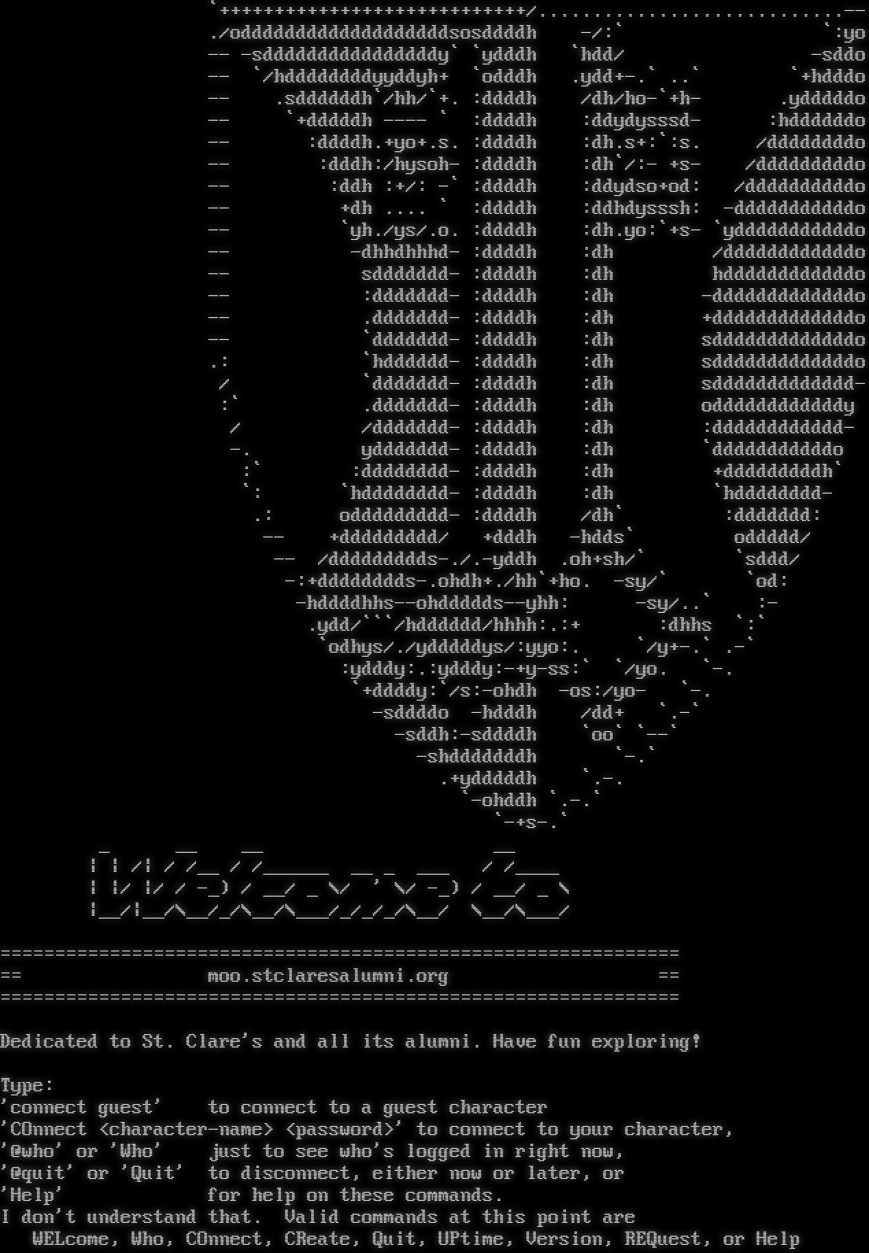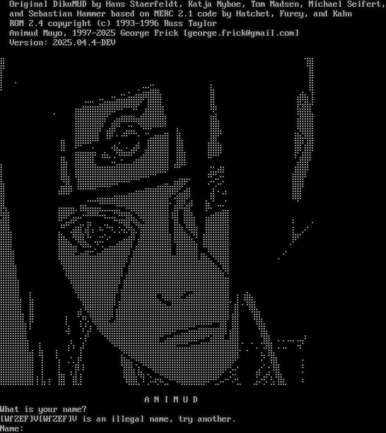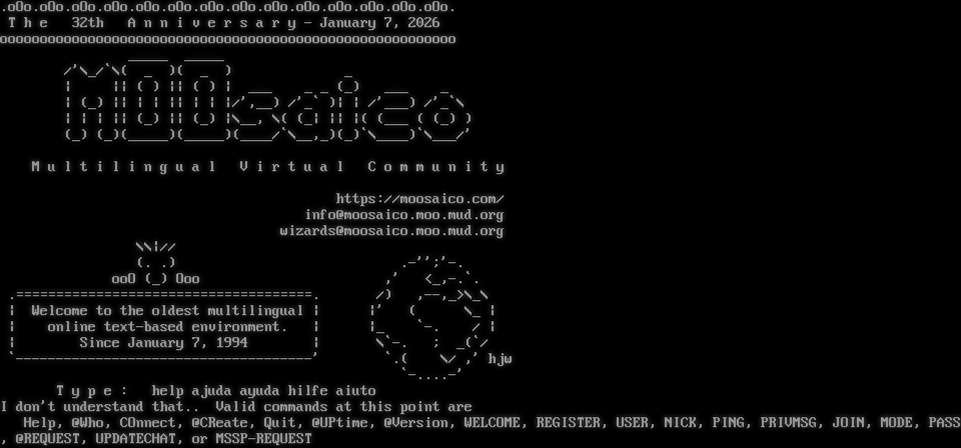 Welcome to NeonMOO, a MUD set in an alternate-history present day North America, in the city of Arnold Island, D.C., capital of the COS. Known for its smoggy air in the Banks and the glittering edifices on the island proper, simply called "Downtown", Arnold Island is, like the COS as a whole, tightly held in the grip of unchecked corporate power, most prominently the Arnold Island Neon Sequestration Company, Inc., and in the grip of unchecked state power, administered by WARD. So where do you fit in? Will you fight your way to the top of the pile to that shining office in the sky? Or will you stalk the streets, preying on the poor and the foolish? Or will you take up arms and bring the fight to WARD, breaking their iron grip on the people? If you do not have a character, you can register one by typing request <address@example.info>; if you do have a character, you can connect using connect <character name> <password>. For more information on the theme of NeonMOO, you can type theme, and to read this message again, type welcome. For any questions regarding the registration or login process, please contact characters@neon-moo.space for help. Due to aggressive handling by several mail providers, please be sure to check your spam folder if it appears the registration mail seems not to arrive. Also check out the NeonMOO discord at https://discord.gg/hzbMHxttpe. #$#LOGIN_TRIGGER Valid commands at this point are COnnect-, Quit, UPtime, Version, WElcome, REQuest, THeme, GET, or MSSP-REQUEST