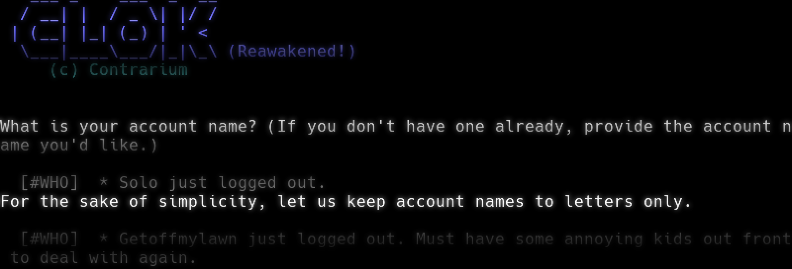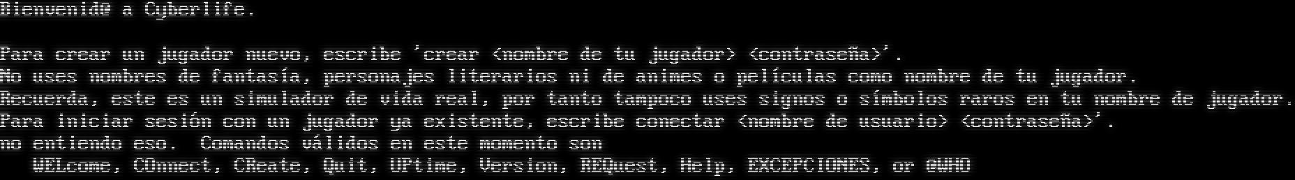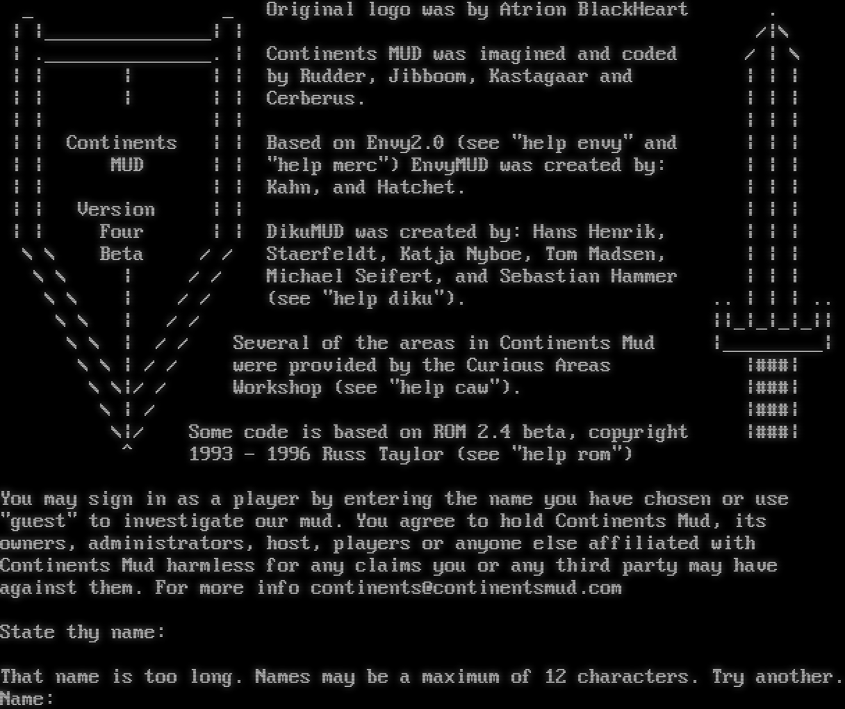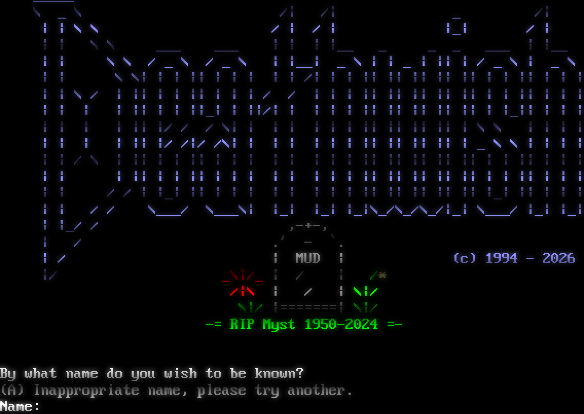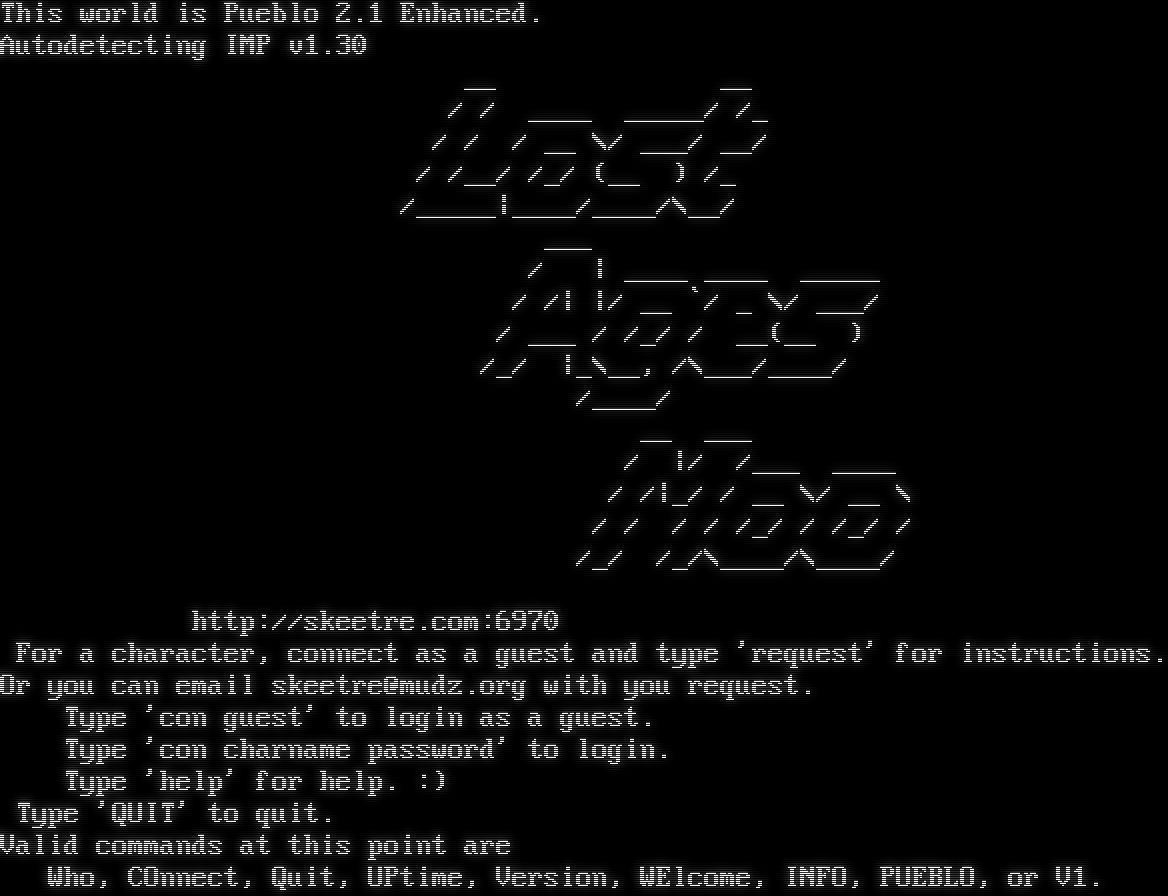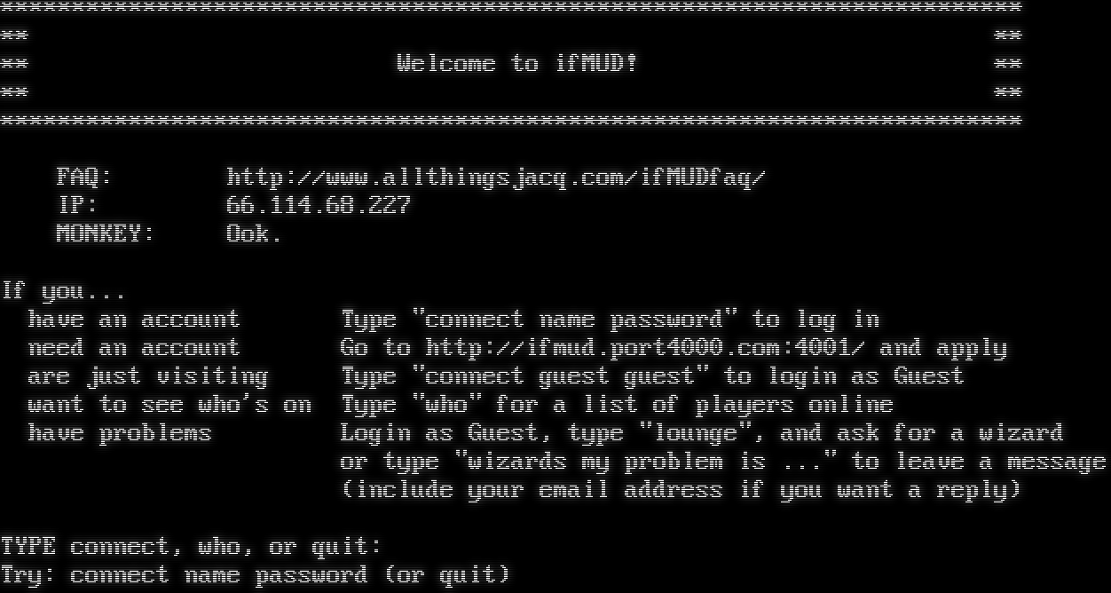 Welcome to NeonMOO, a MUD set in an alternate-history present day North America, in the city of Arnold Island, D.C., capital of the COS. Known for its smoggy air in the Banks and the glittering edifices on the island proper, simply called "Downtown", Arnold Island is, like the COS as a whole, tightly held in the grip of unchecked corporate power, most prominently the Arnold Island Neon Sequestration Company, Inc., and in the grip of unchecked state power, administered by WARD. So where do you fit in? Will you fight your way to the top of the pile to that shining office in the sky? Or will you stalk the streets, preying on the poor and the foolish? Or will you take up arms and bring the fight to WARD, breaking their iron grip on the people? If you do not have a character, you can register one by typing request <address@example.info>; if you do have a character, you can connect using connect <character name> <password>. For more information on the theme of NeonMOO, you can type theme, and to read this message again, type welcome. For any questions regarding the registration or login process, please contact characters@neon-moo.space for help. Due to aggressive handling by several mail providers, please be sure to check your spam folder if it appears the registration mail seems not to arrive. Also check out the NeonMOO discord at https://discord.gg/hzbMHxttpe. #$#LOGIN_TRIGGER Valid commands at this point are COnnect-, Quit, UPtime, Version, WElcome, REQuest, THeme, GET, or MSSP-REQUEST