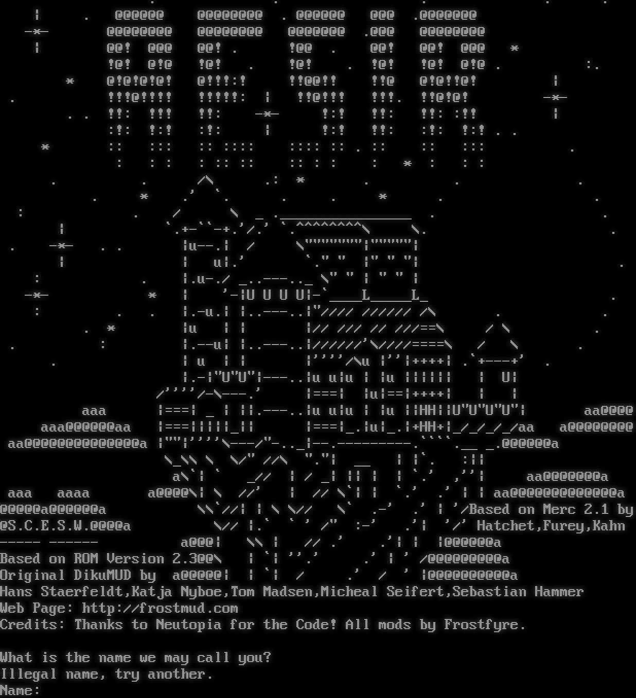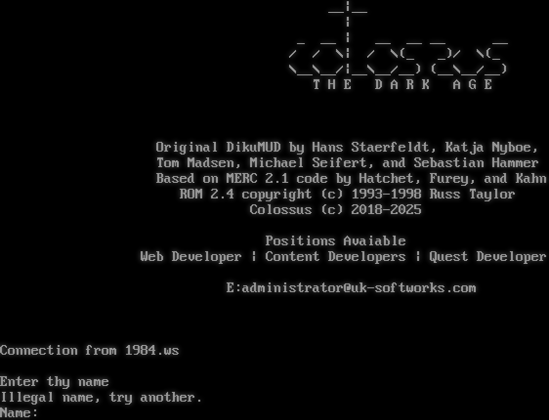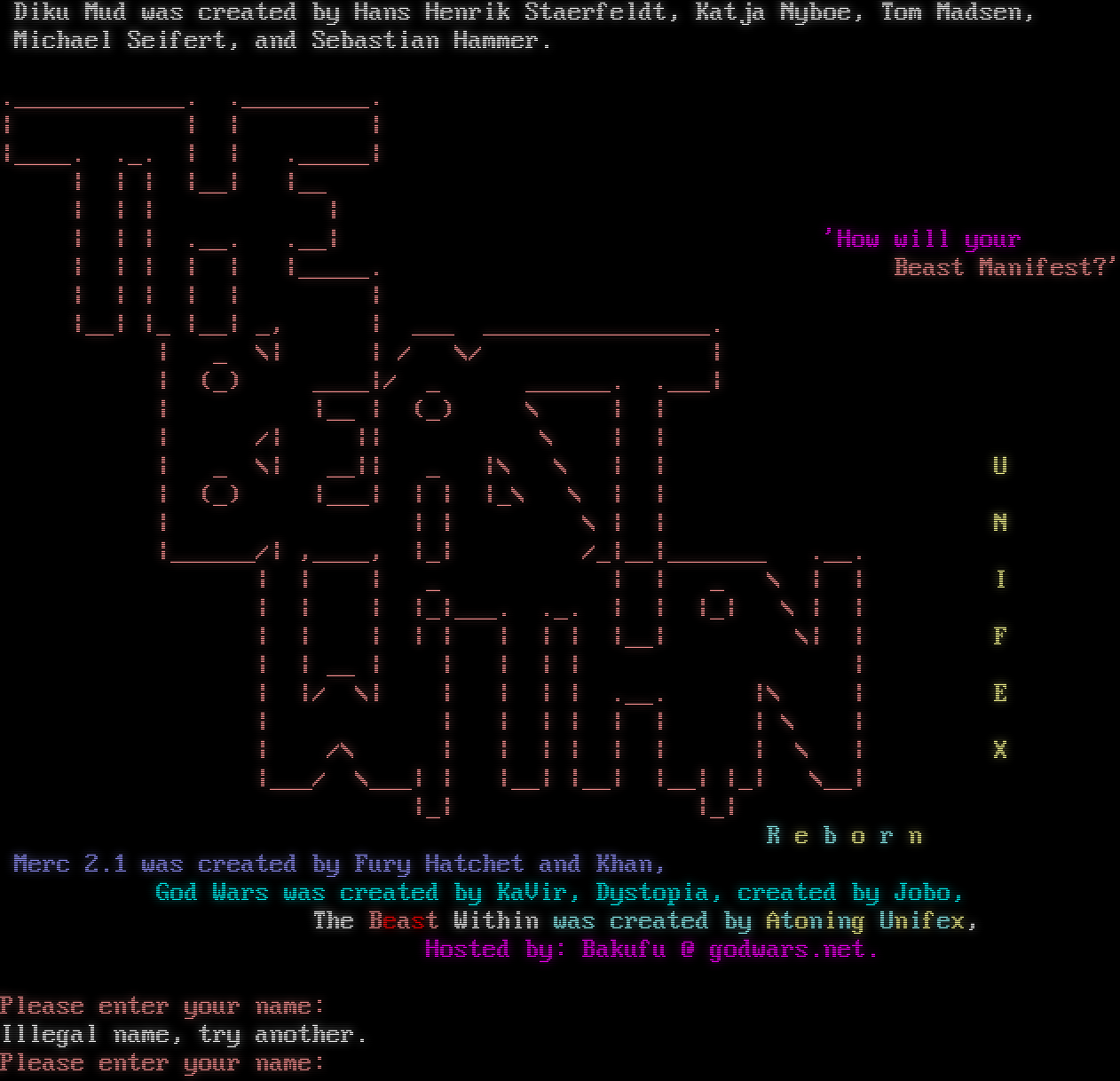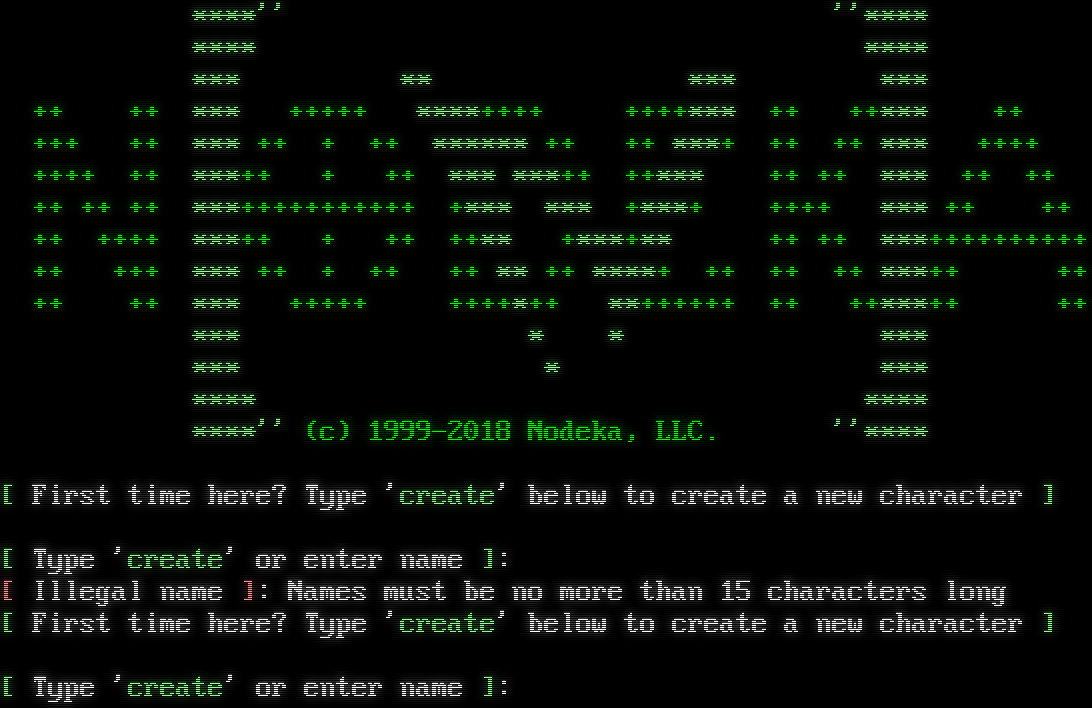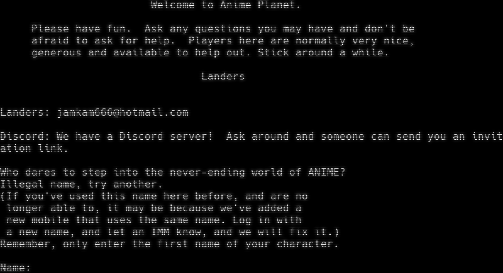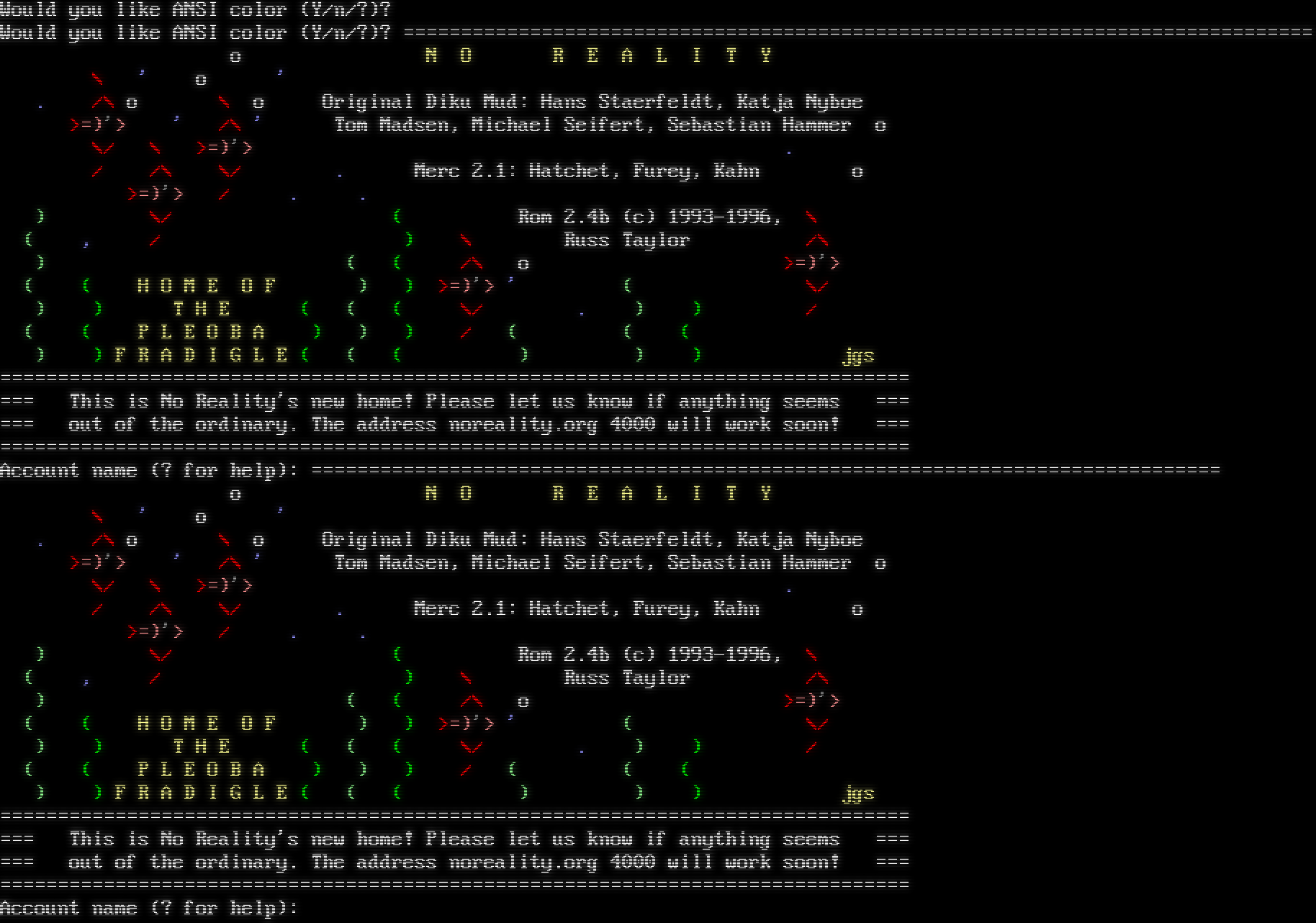 Welcome to NeonMOO, a MUD set in an alternate-history present day North America, in the city of Arnold Island, D.C., capital of the COS. Known for its smoggy air in the Banks and the glittering edifices on the island proper, simply called "Downtown", Arnold Island is, like the COS as a whole, tightly held in the grip of unchecked corporate power, most prominently the Arnold Island Neon Sequestration Company, Inc., and in the grip of unchecked state power, administered by WARD. So where do you fit in? Will you fight your way to the top of the pile to that shining office in the sky? Or will you stalk the streets, preying on the poor and the foolish? Or will you take up arms and bring the fight to WARD, breaking their iron grip on the people? If you do not have a character, you can register one by typing request <address@example.info>; if you do have a character, you can connect using connect <character name> <password>. For more information on the theme of NeonMOO, you can type theme, and to read this message again, type welcome. For any questions regarding the registration or login process, please contact characters@neon-moo.space for help. Due to aggressive handling by several mail providers, please be sure to check your spam folder if it appears the registration mail seems not to arrive. Also check out the NeonMOO discord at https://discord.gg/hzbMHxttpe. #$#LOGIN_TRIGGER Valid commands at this point are COnnect-, Quit, UPtime, Version, WElcome, REQuest, THeme, GET, or MSSP-REQUEST
