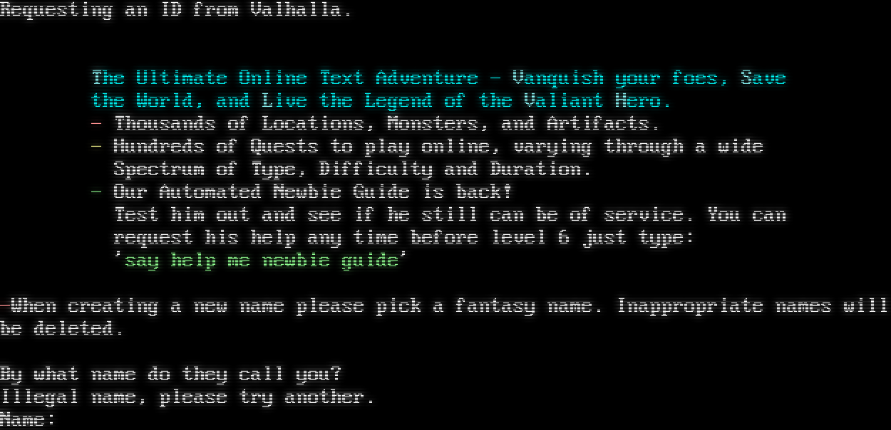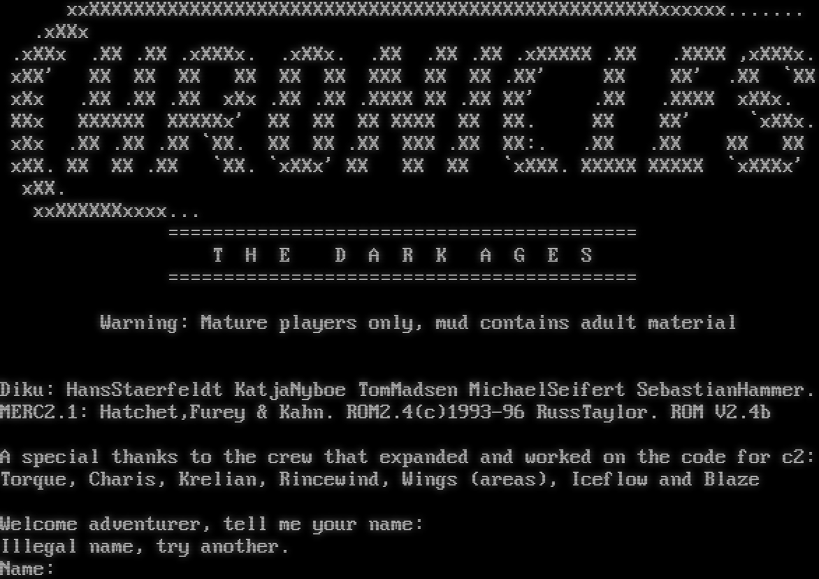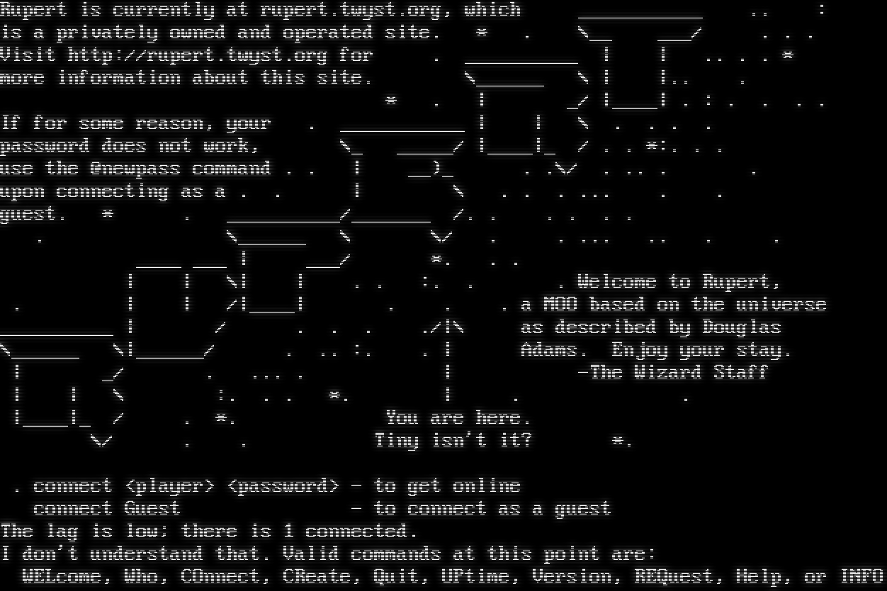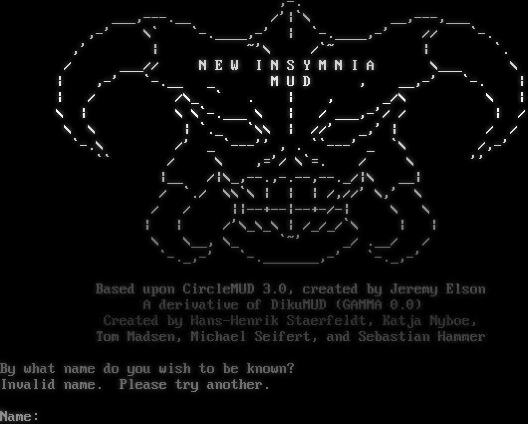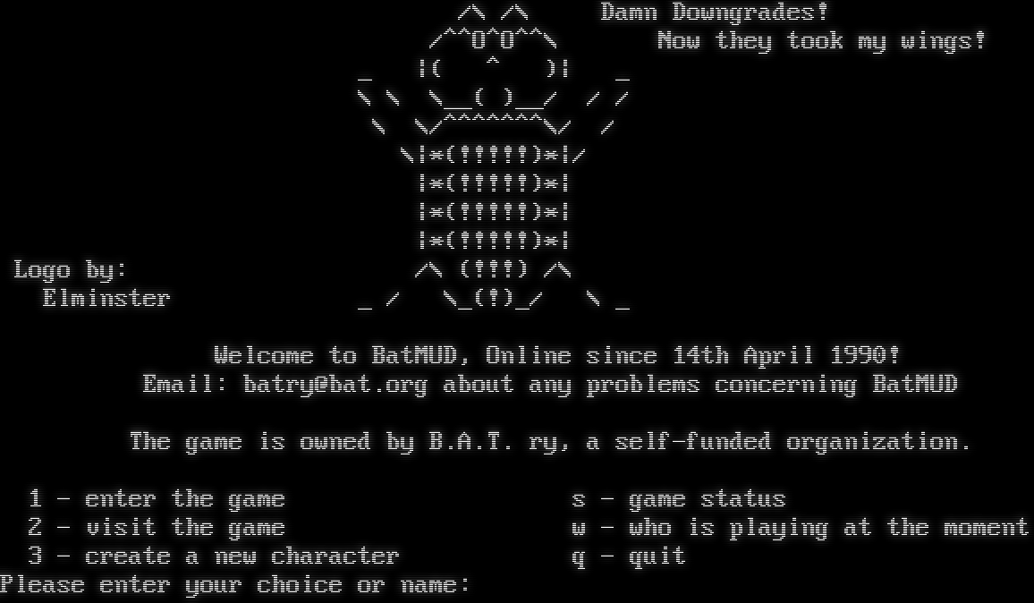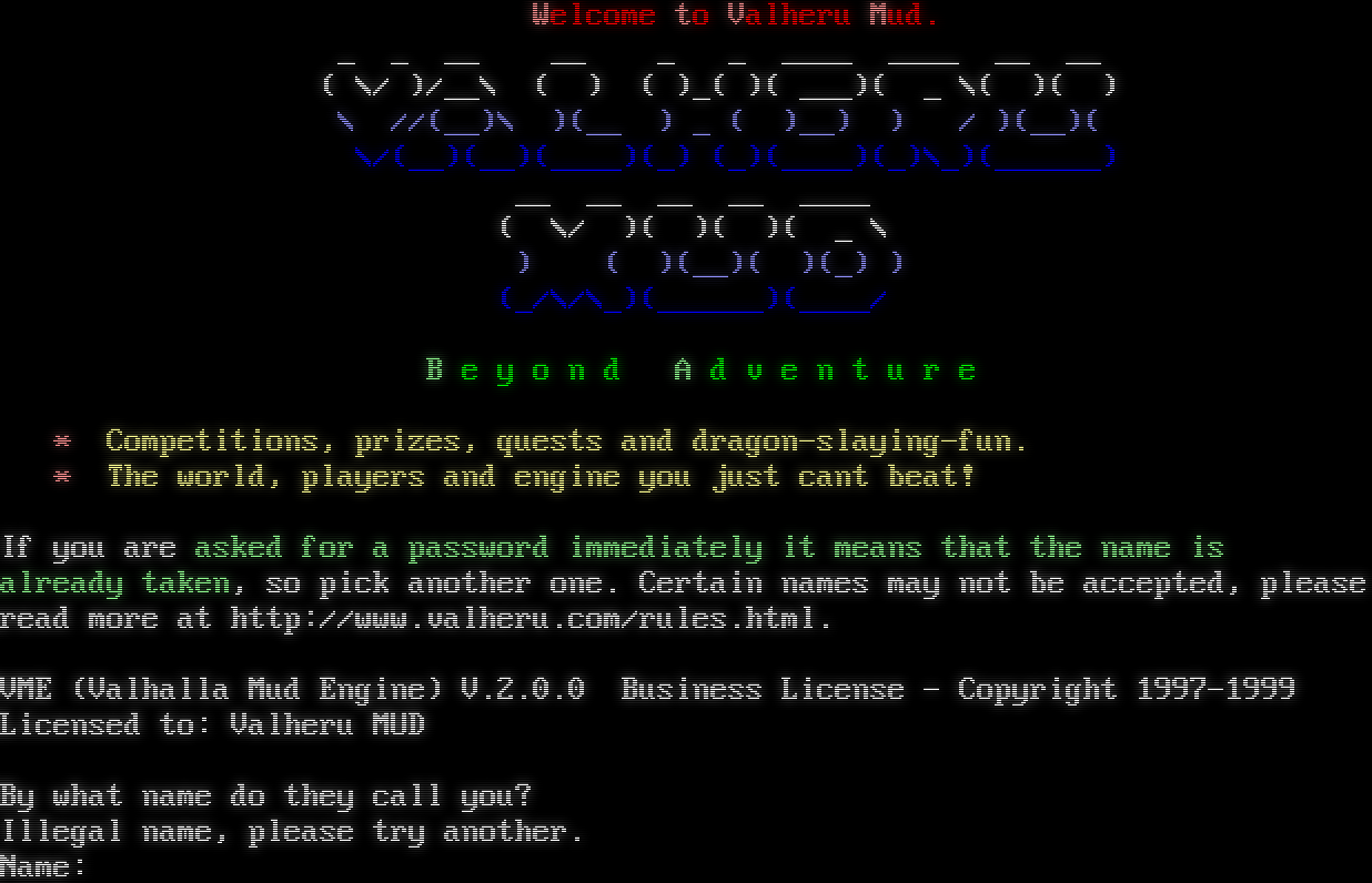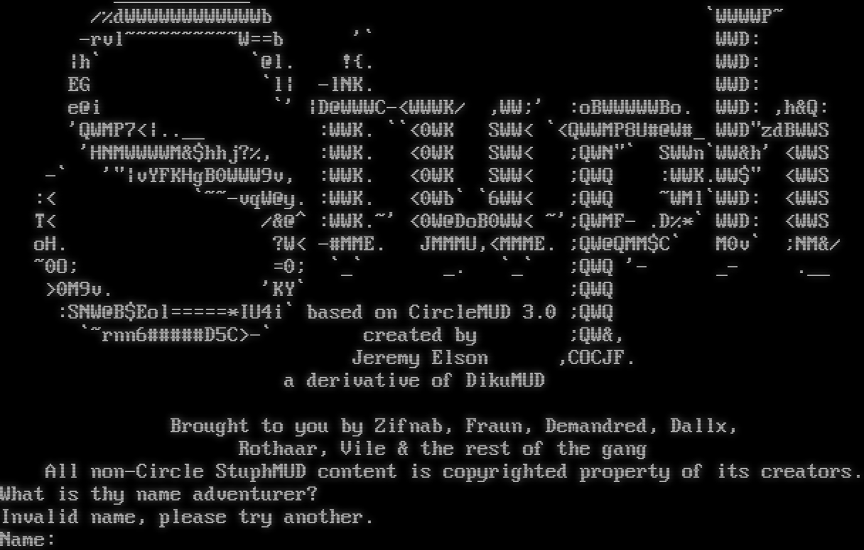 Welcome to NeonMOO, a MUD set in an alternate-history present day North America, in the city of Arnold Island, D.C., capital of the COS. Known for its smoggy air in the Banks and the glittering edifices on the island proper, simply called "Downtown", Arnold Island is, like the COS as a whole, tightly held in the grip of unchecked corporate power, most prominently the Arnold Island Neon Sequestration Company, Inc., and in the grip of unchecked state power, administered by WARD. So where do you fit in? Will you fight your way to the top of the pile to that shining office in the sky? Or will you stalk the streets, preying on the poor and the foolish? Or will you take up arms and bring the fight to WARD, breaking their iron grip on the people? If you do not have a character, you can register one by typing request <address@example.info>; if you do have a character, you can connect using connect <character name> <password>. For more information on the theme of NeonMOO, you can type theme, and to read this message again, type welcome. For any questions regarding the registration or login process, please contact characters@neon-moo.space for help. Due to aggressive handling by several mail providers, please be sure to check your spam folder if it appears the registration mail seems not to arrive. Also check out the NeonMOO discord at https://discord.gg/hzbMHxttpe. #$#LOGIN_TRIGGER Valid commands at this point are COnnect-, Quit, UPtime, Version, WElcome, REQuest, THeme, GET, or MSSP-REQUEST