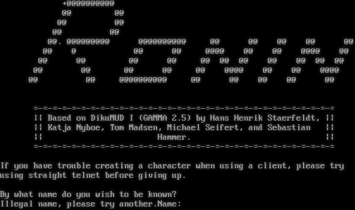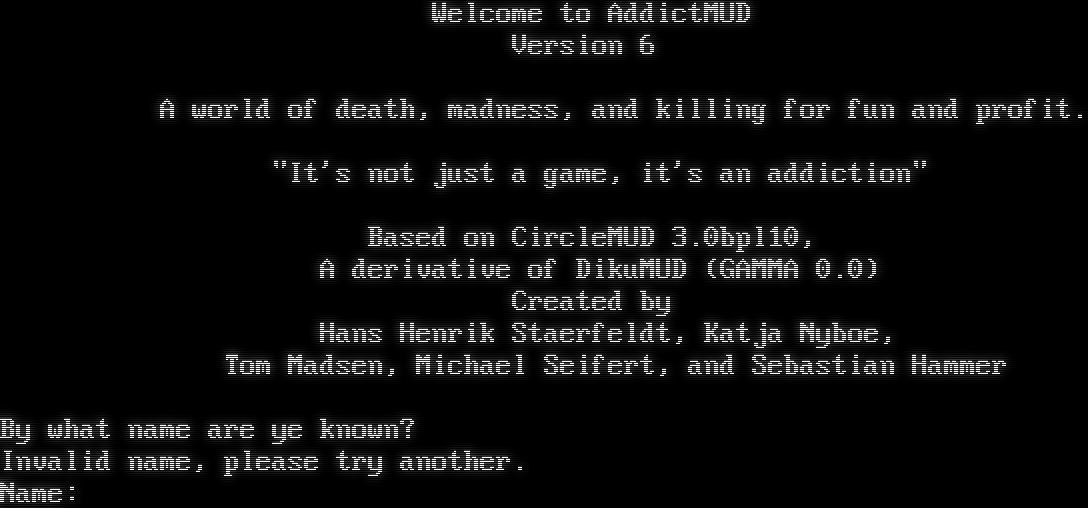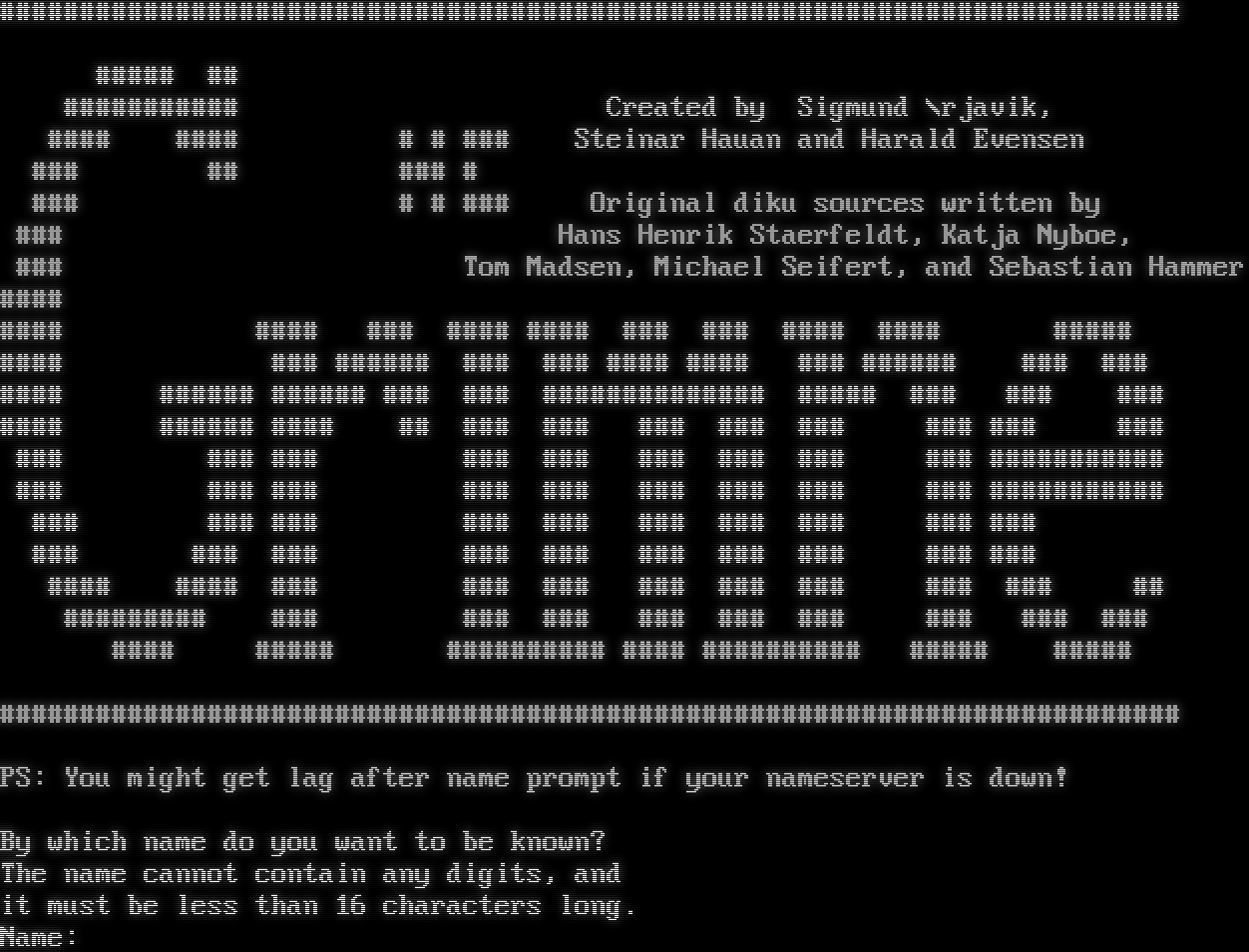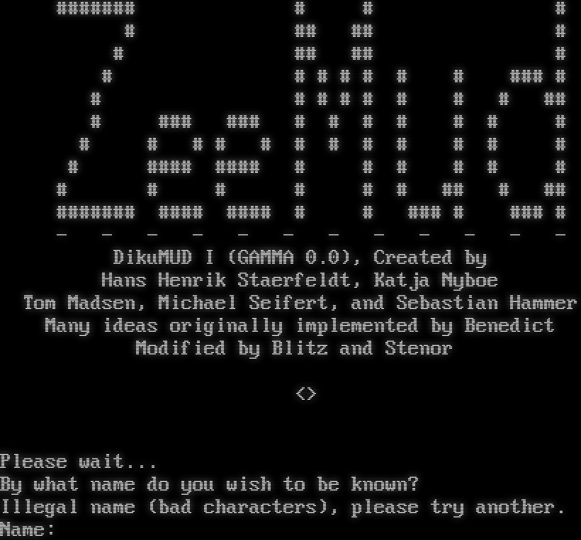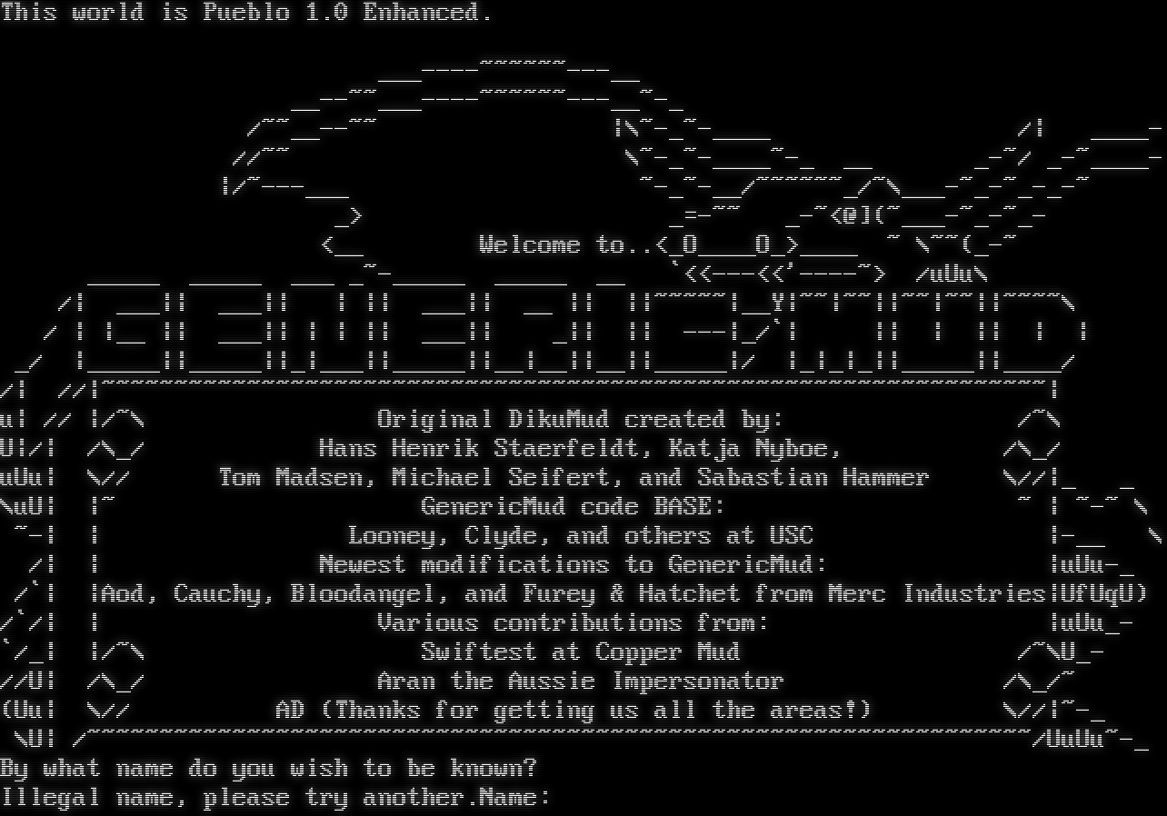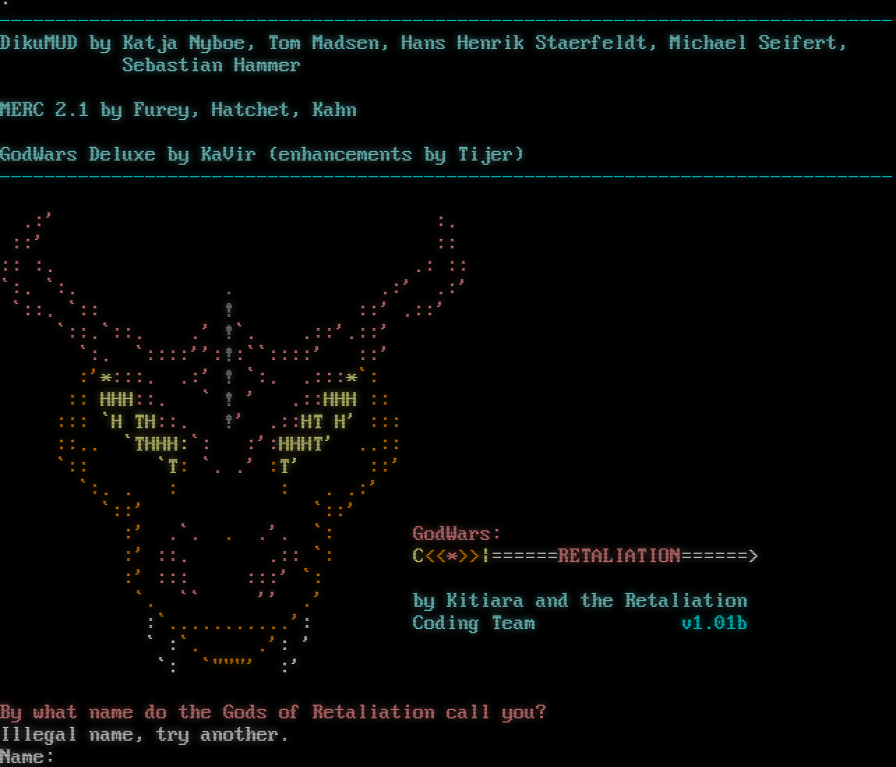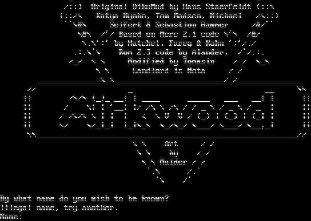 Welcome to NeonMOO, a MUD set in an alternate-history present day North America, in the city of Arnold Island, D.C., capital of the COS. Known for its smoggy air in the Banks and the glittering edifices on the island proper, simply called "Downtown", Arnold Island is, like the COS as a whole, tightly held in the grip of unchecked corporate power, most prominently the Arnold Island Neon Sequestration Company, Inc., and in the grip of unchecked state power, administered by WARD. So where do you fit in? Will you fight your way to the top of the pile to that shining office in the sky? Or will you stalk the streets, preying on the poor and the foolish? Or will you take up arms and bring the fight to WARD, breaking their iron grip on the people? If you do not have a character, you can register one by typing request <address@example.info>; if you do have a character, you can connect using connect <character name> <password>. For more information on the theme of NeonMOO, you can type theme, and to read this message again, type welcome. For any questions regarding the registration or login process, please contact characters@neon-moo.space for help. Due to aggressive handling by several mail providers, please be sure to check your spam folder if it appears the registration mail seems not to arrive. Also check out the NeonMOO discord at https://discord.gg/hzbMHxttpe. #$#LOGIN_TRIGGER Valid commands at this point are COnnect-, Quit, UPtime, Version, WElcome, REQuest, THeme, GET, or MSSP-REQUEST