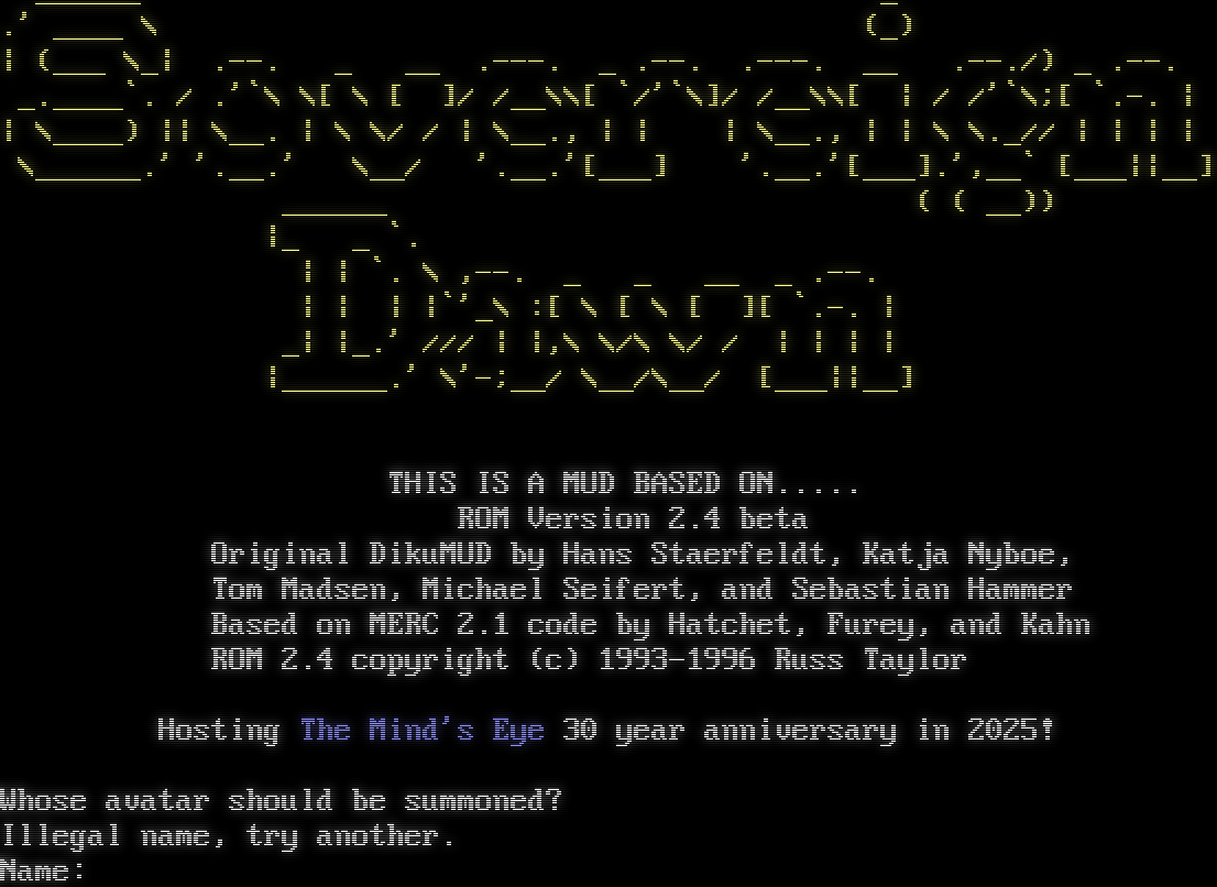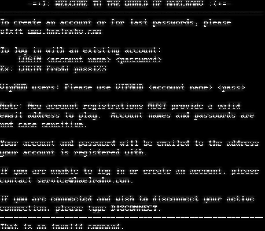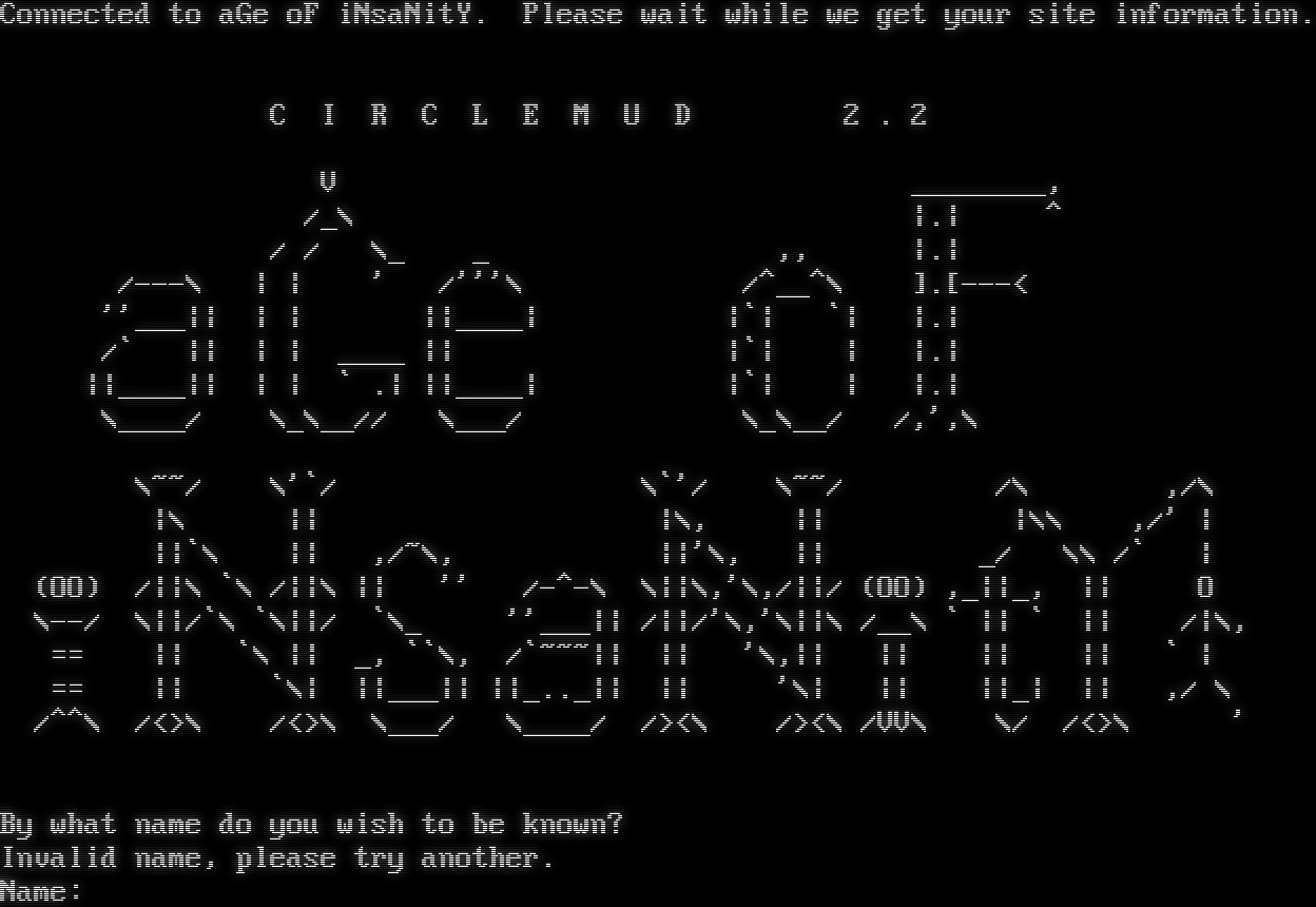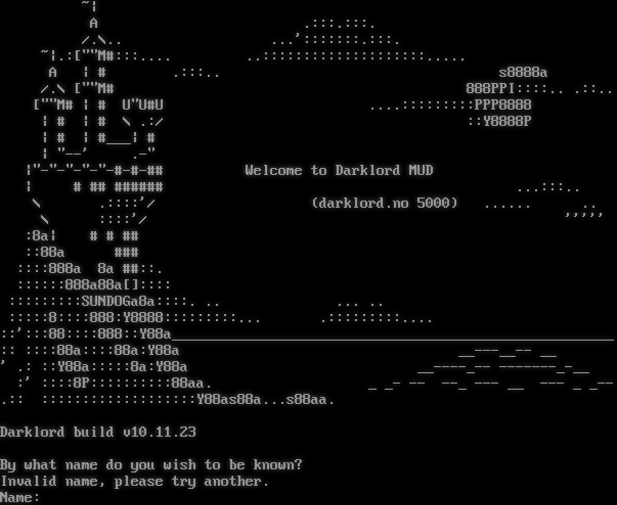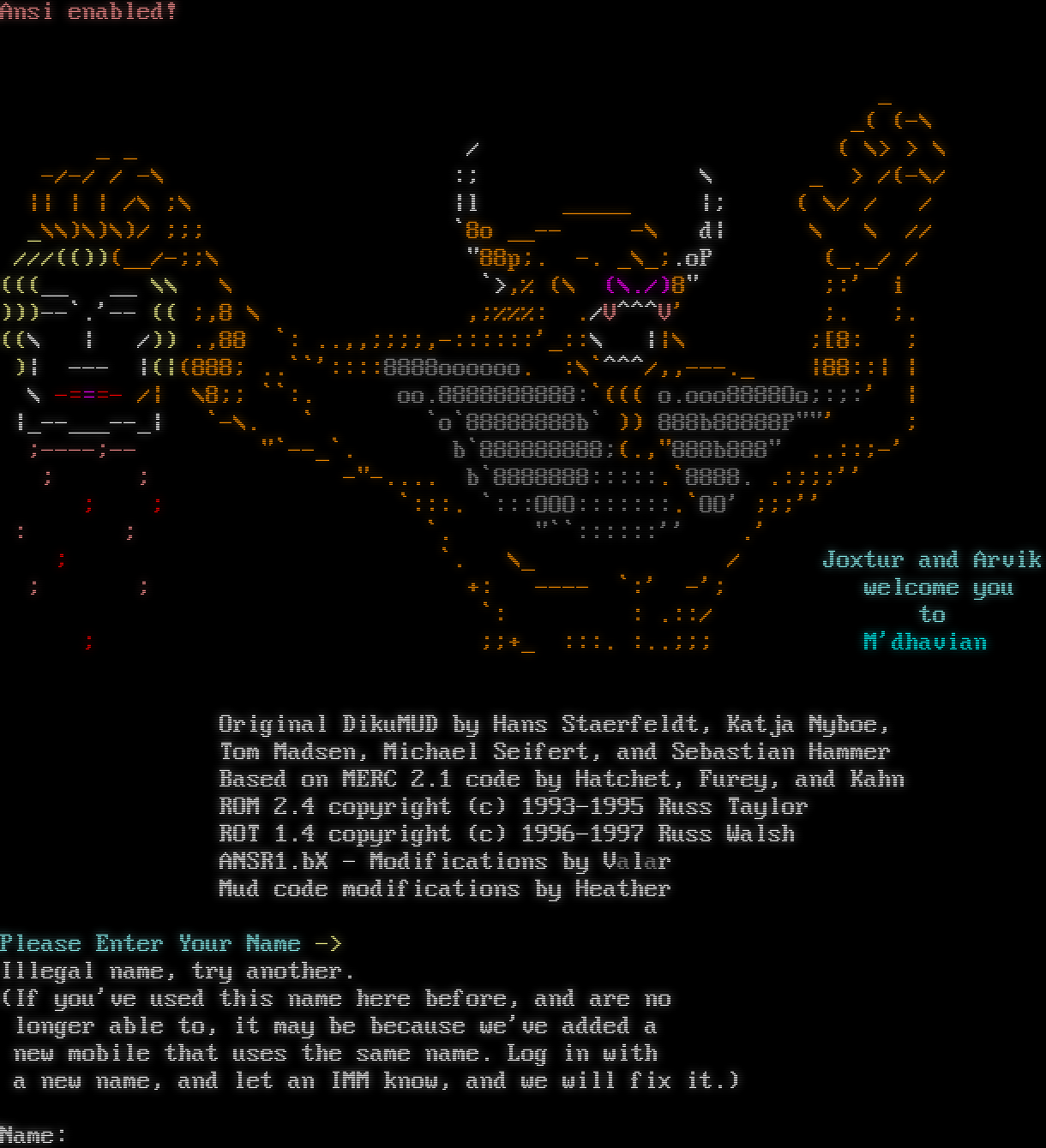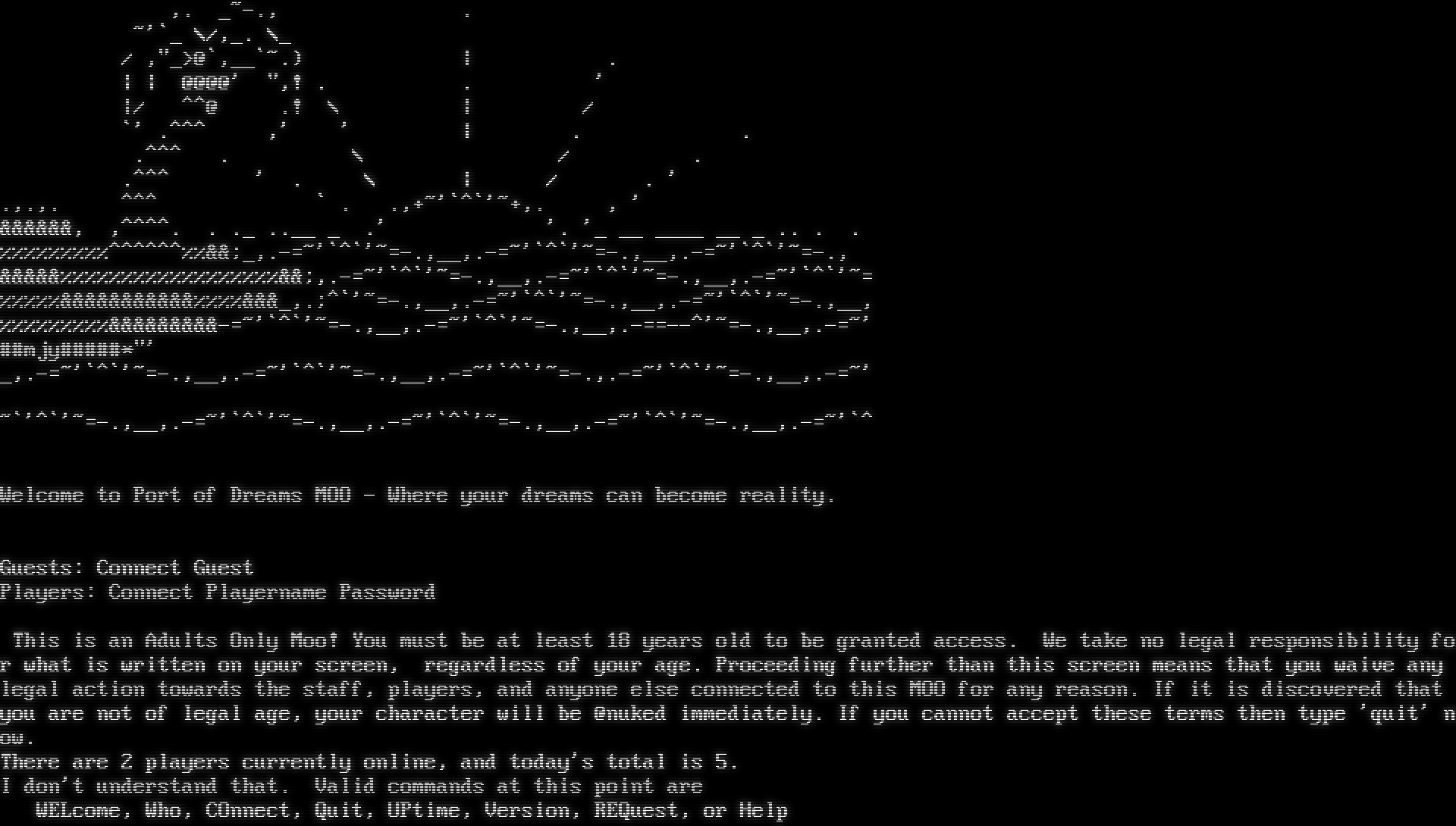 Welcome to NeonMOO, a MUD set in an alternate-history present day North America, in the city of Arnold Island, D.C., capital of the COS. Known for its smoggy air in the Banks and the glittering edifices on the island proper, simply called "Downtown", Arnold Island is, like the COS as a whole, tightly held in the grip of unchecked corporate power, most prominently the Arnold Island Neon Sequestration Company, Inc., and in the grip of unchecked state power, administered by WARD. So where do you fit in? Will you fight your way to the top of the pile to that shining office in the sky? Or will you stalk the streets, preying on the poor and the foolish? Or will you take up arms and bring the fight to WARD, breaking their iron grip on the people? If you do not have a character, you can register one by typing request <address@example.info>; if you do have a character, you can connect using connect <character name> <password>. For more information on the theme of NeonMOO, you can type theme, and to read this message again, type welcome. For any questions regarding the registration or login process, please contact characters@neon-moo.space for help. Due to aggressive handling by several mail providers, please be sure to check your spam folder if it appears the registration mail seems not to arrive. Also check out the NeonMOO discord at https://discord.gg/hzbMHxttpe. #$#LOGIN_TRIGGER Valid commands at this point are COnnect-, Quit, UPtime, Version, WElcome, REQuest, THeme, GET, or MSSP-REQUEST