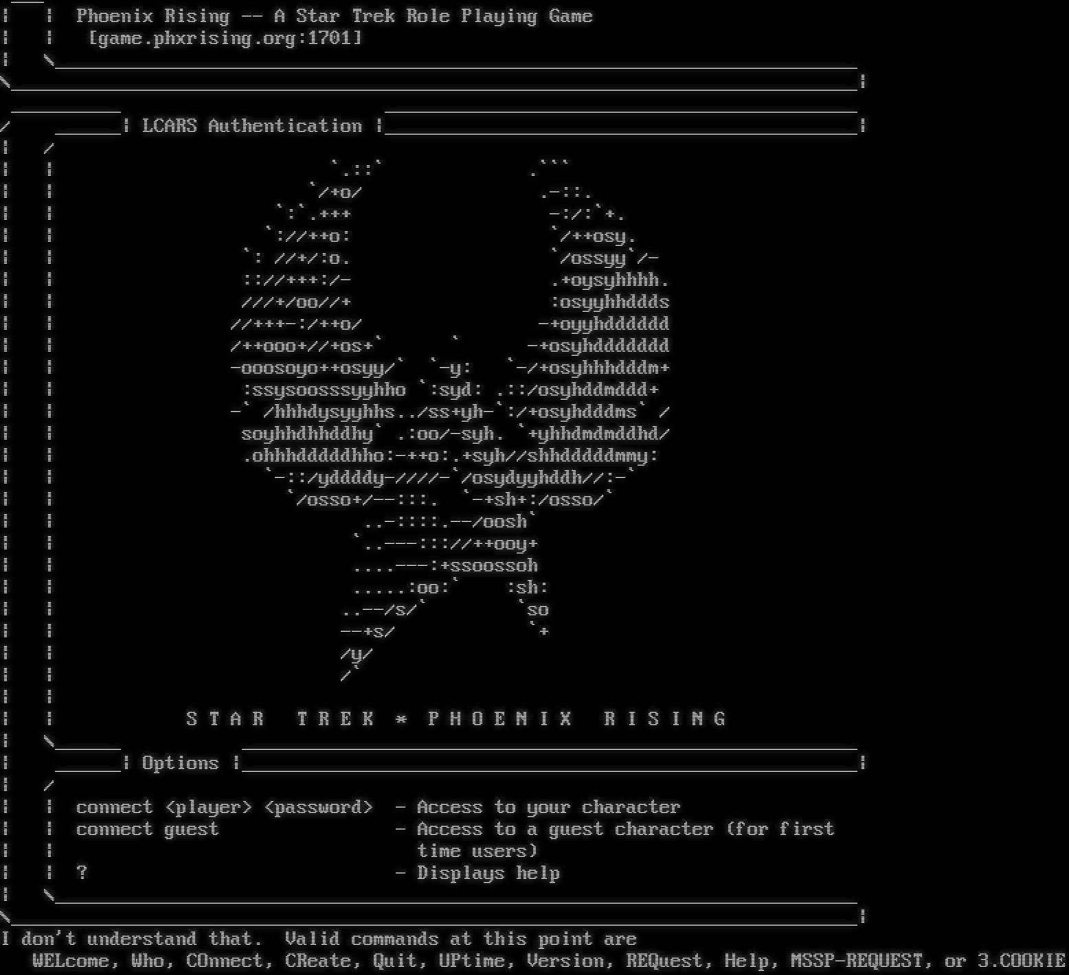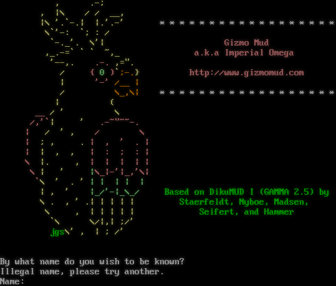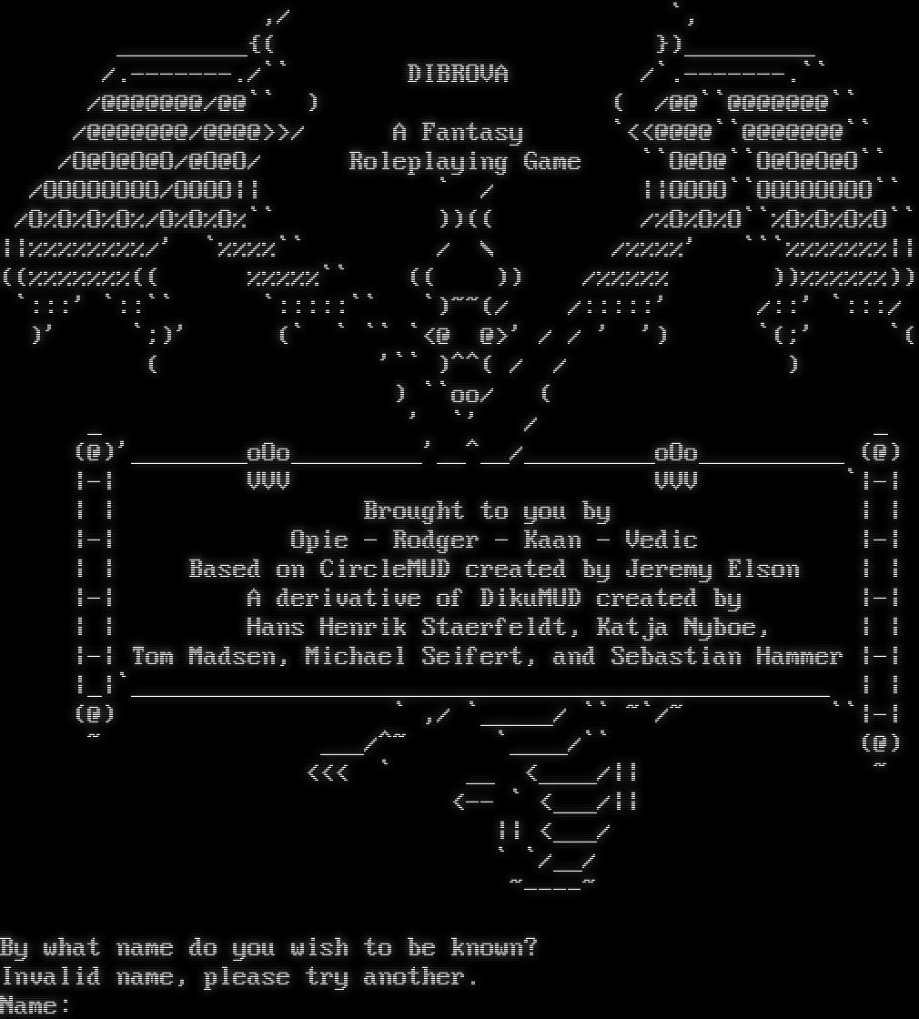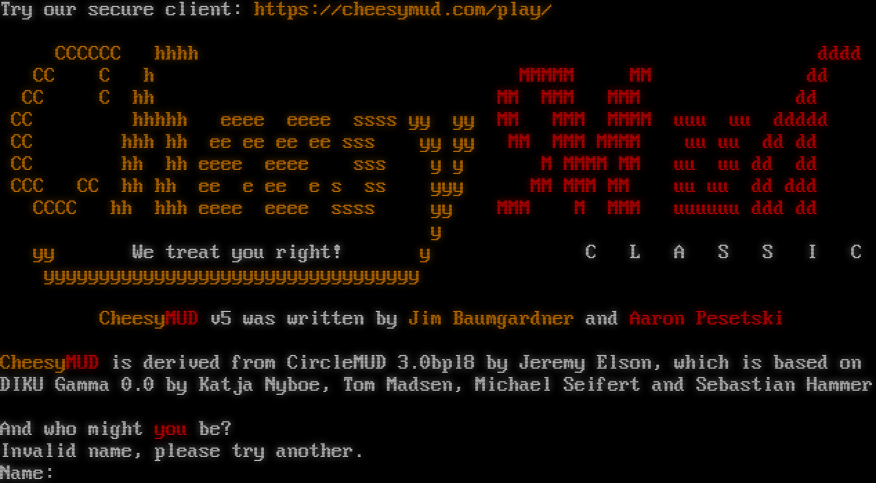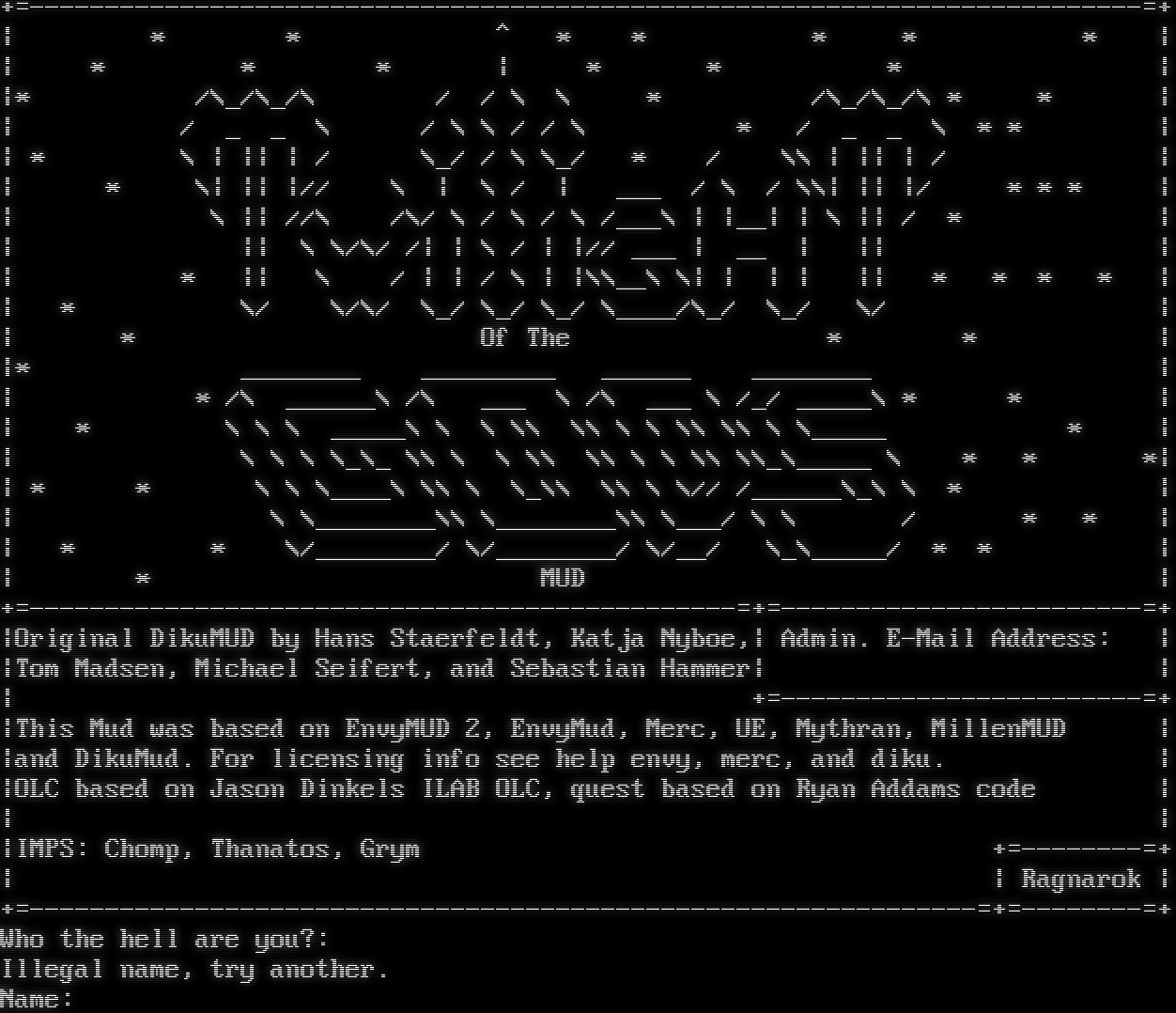 Welcome to NeonMOO, a MUD set in an alternate-history present day North America, in the city of Arnold Island, D.C., capital of the COS. Known for its smoggy air in the Banks and the glittering edifices on the island proper, simply called "Downtown", Arnold Island is, like the COS as a whole, tightly held in the grip of unchecked corporate power, most prominently the Arnold Island Neon Sequestration Company, Inc., and in the grip of unchecked state power, administered by WARD. So where do you fit in? Will you fight your way to the top of the pile to that shining office in the sky? Or will you stalk the streets, preying on the poor and the foolish? Or will you take up arms and bring the fight to WARD, breaking their iron grip on the people? If you do not have a character, you can register one by typing request <address@example.info>; if you do have a character, you can connect using connect <character name> <password>. For more information on the theme of NeonMOO, you can type theme, and to read this message again, type welcome. For any questions regarding the registration or login process, please contact characters@neon-moo.space for help. Due to aggressive handling by several mail providers, please be sure to check your spam folder if it appears the registration mail seems not to arrive. Also check out the NeonMOO discord at https://discord.gg/hzbMHxttpe. #$#LOGIN_TRIGGER Valid commands at this point are COnnect-, Quit, UPtime, Version, WElcome, REQuest, THeme, GET, or MSSP-REQUEST