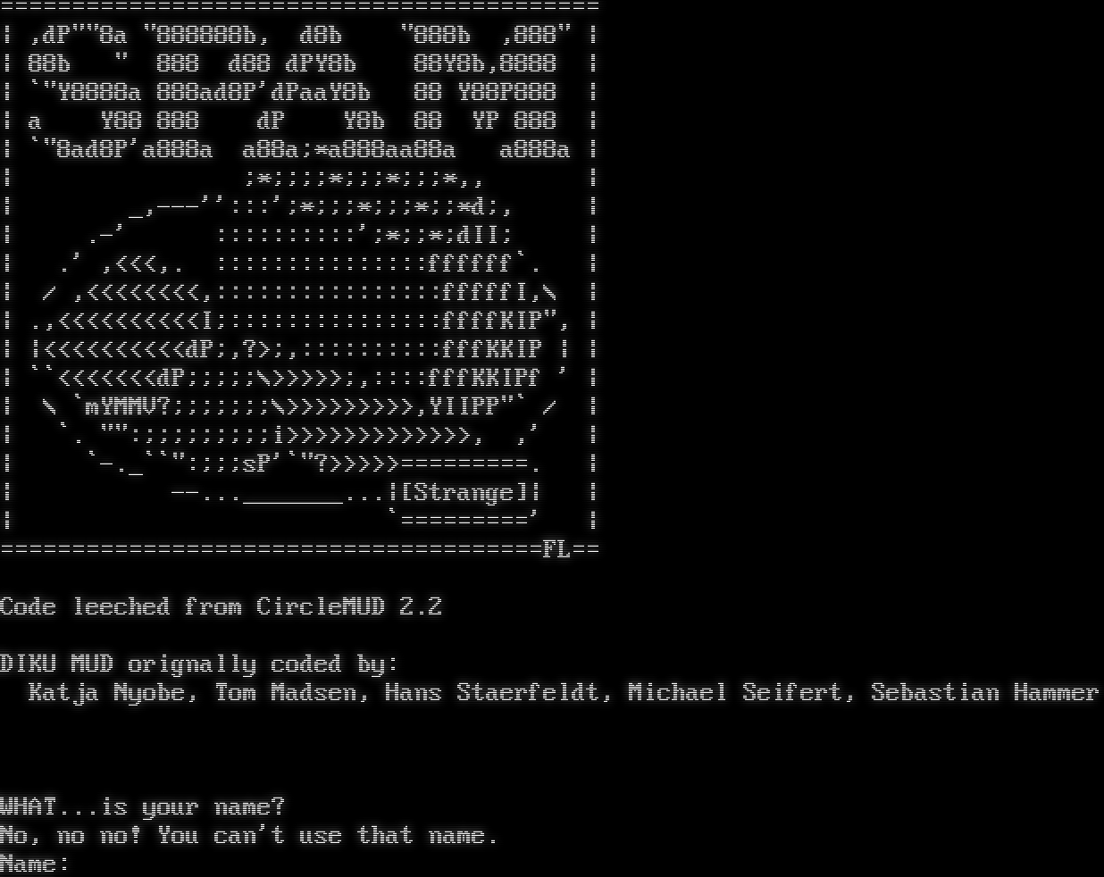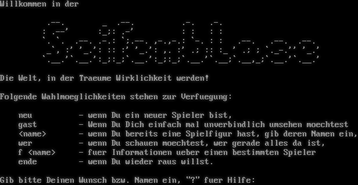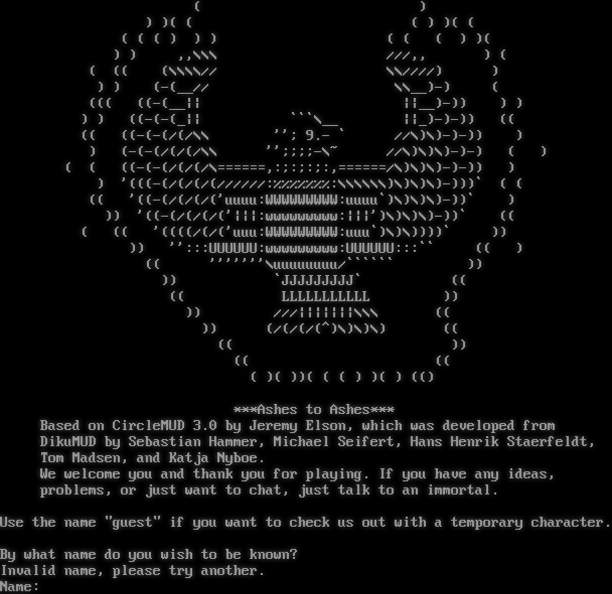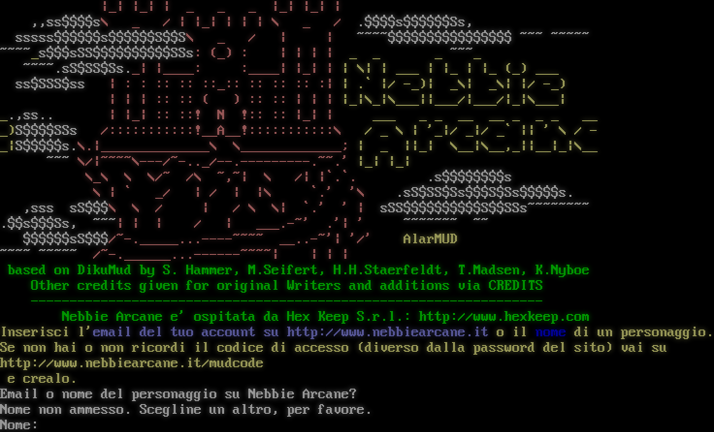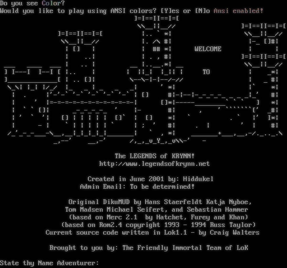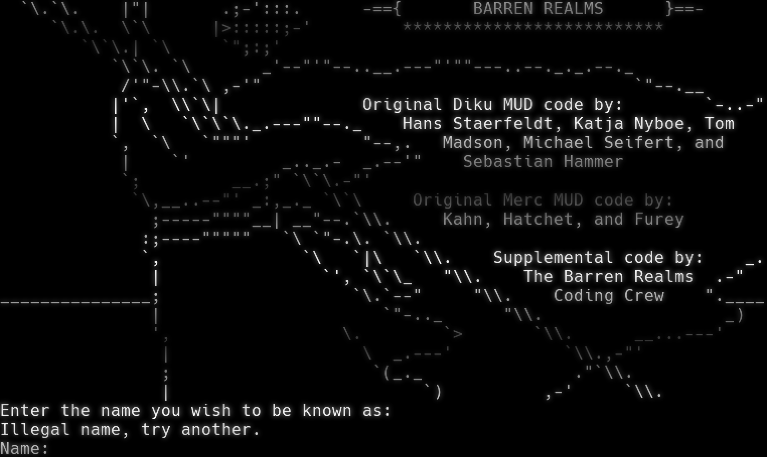 Welcome to NeonMOO, a MUD set in an alternate-history present day North America, in the city of Arnold Island, D.C., capital of the COS. Known for its smoggy air in the Banks and the glittering edifices on the island proper, simply called "Downtown", Arnold Island is, like the COS as a whole, tightly held in the grip of unchecked corporate power, most prominently the Arnold Island Neon Sequestration Company, Inc., and in the grip of unchecked state power, administered by WARD. So where do you fit in? Will you fight your way to the top of the pile to that shining office in the sky? Or will you stalk the streets, preying on the poor and the foolish? Or will you take up arms and bring the fight to WARD, breaking their iron grip on the people? If you do not have a character, you can register one by typing request <address@example.info>; if you do have a character, you can connect using connect <character name> <password>. For more information on the theme of NeonMOO, you can type theme, and to read this message again, type welcome. For any questions regarding the registration or login process, please contact characters@neon-moo.space for help. Due to aggressive handling by several mail providers, please be sure to check your spam folder if it appears the registration mail seems not to arrive. Also check out the NeonMOO discord at https://discord.gg/hzbMHxttpe. #$#LOGIN_TRIGGER Valid commands at this point are COnnect-, Quit, UPtime, Version, WElcome, REQuest, THeme, GET, or MSSP-REQUEST