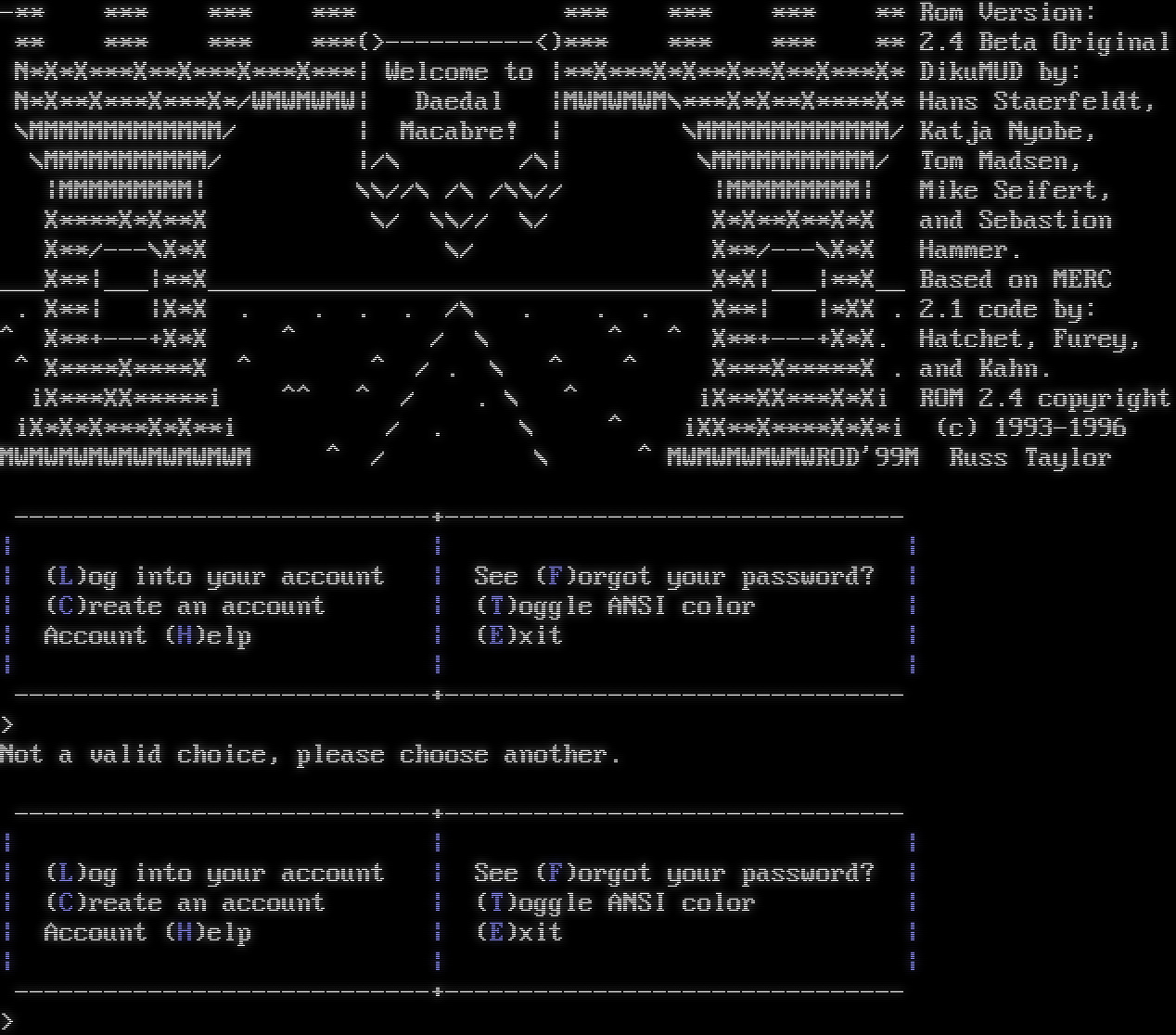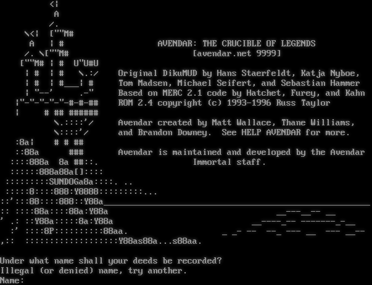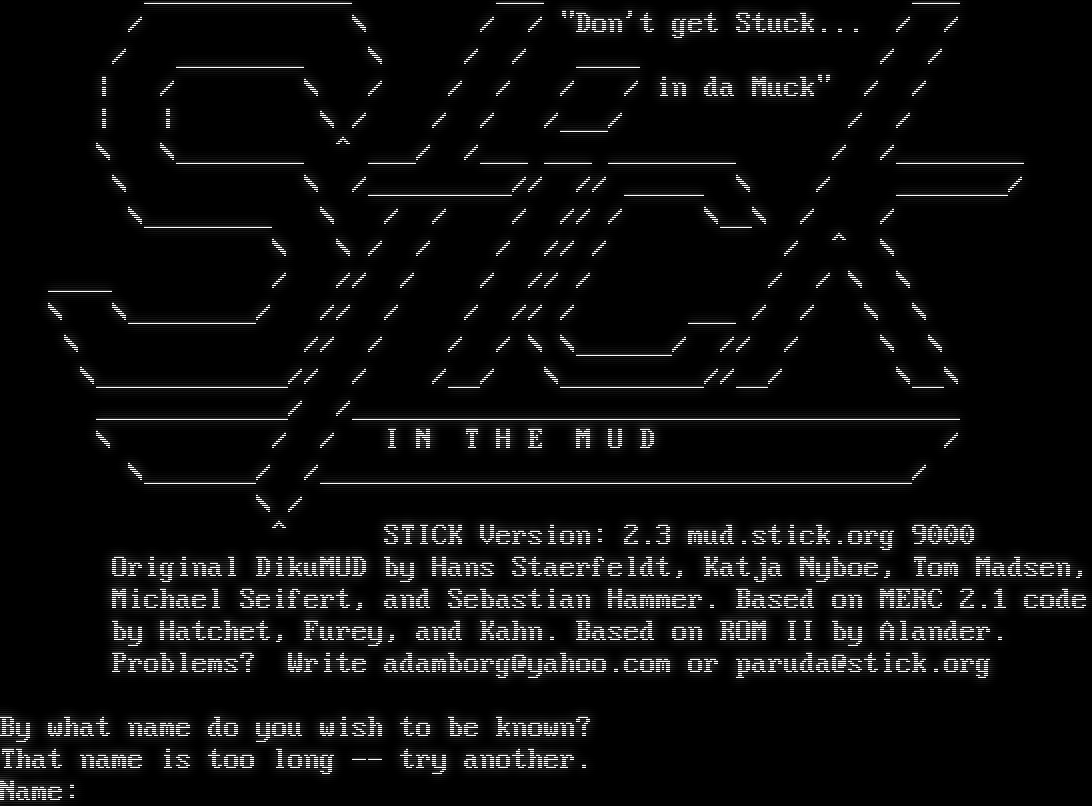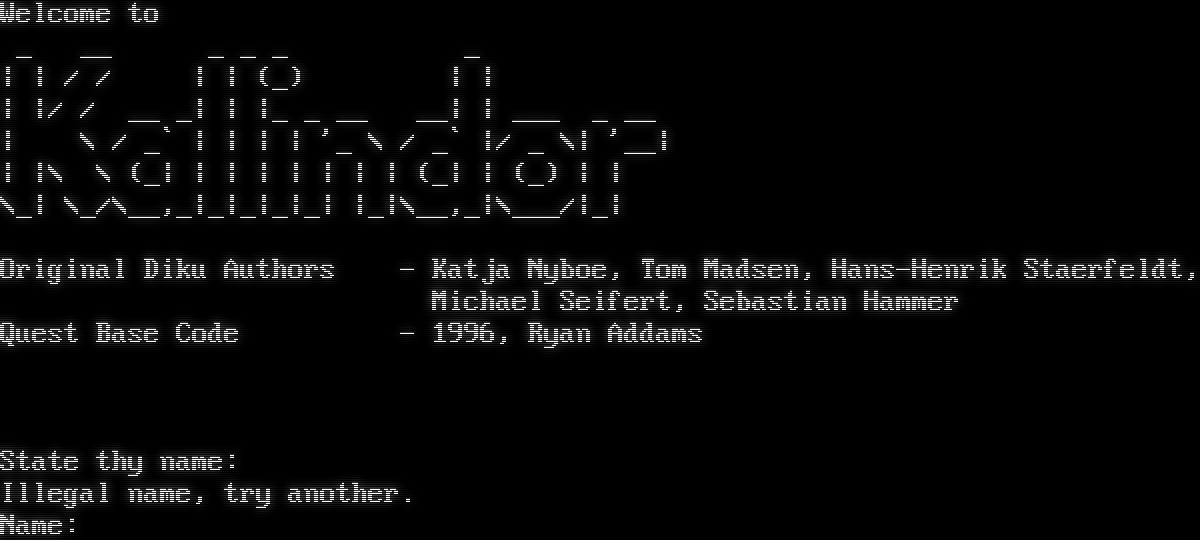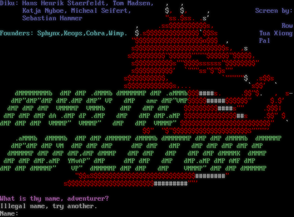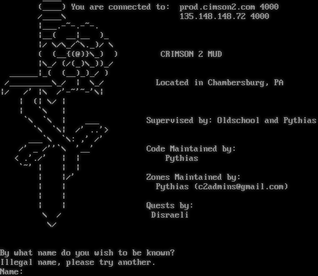 Welcome to NeonMOO, a MUD set in an alternate-history present day North America, in the city of Arnold Island, D.C., capital of the COS. Known for its smoggy air in the Banks and the glittering edifices on the island proper, simply called "Downtown", Arnold Island is, like the COS as a whole, tightly held in the grip of unchecked corporate power, most prominently the Arnold Island Neon Sequestration Company, Inc., and in the grip of unchecked state power, administered by WARD. So where do you fit in? Will you fight your way to the top of the pile to that shining office in the sky? Or will you stalk the streets, preying on the poor and the foolish? Or will you take up arms and bring the fight to WARD, breaking their iron grip on the people? If you do not have a character, you can register one by typing request <address@example.info>; if you do have a character, you can connect using connect <character name> <password>. For more information on the theme of NeonMOO, you can type theme, and to read this message again, type welcome. For any questions regarding the registration or login process, please contact characters@neon-moo.space for help. Due to aggressive handling by several mail providers, please be sure to check your spam folder if it appears the registration mail seems not to arrive. Also check out the NeonMOO discord at https://discord.gg/hzbMHxttpe. #$#LOGIN_TRIGGER Valid commands at this point are COnnect-, Quit, UPtime, Version, WElcome, REQuest, THeme, GET, or MSSP-REQUEST