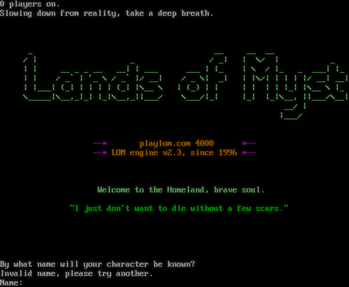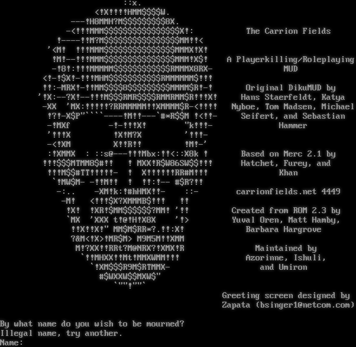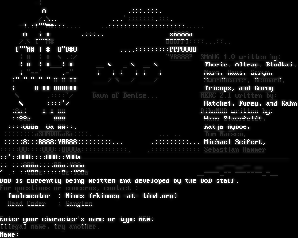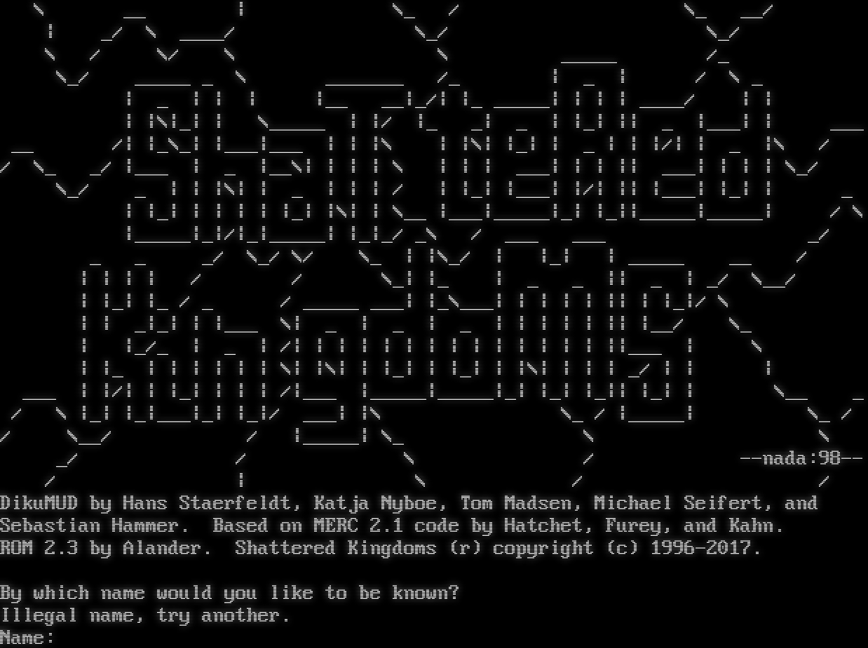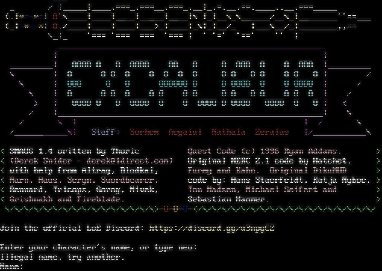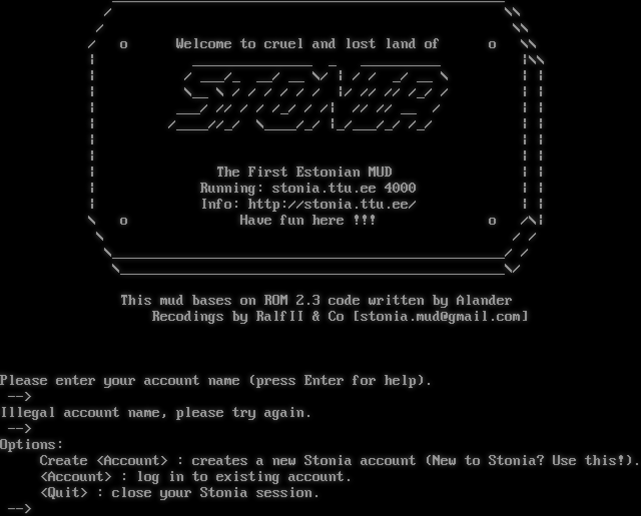 Welcome to NeonMOO, a MUD set in an alternate-history present day North America, in the city of Arnold Island, D.C., capital of the COS. Known for its smoggy air in the Banks and the glittering edifices on the island proper, simply called "Downtown", Arnold Island is, like the COS as a whole, tightly held in the grip of unchecked corporate power, most prominently the Arnold Island Neon Sequestration Company, Inc., and in the grip of unchecked state power, administered by WARD. So where do you fit in? Will you fight your way to the top of the pile to that shining office in the sky? Or will you stalk the streets, preying on the poor and the foolish? Or will you take up arms and bring the fight to WARD, breaking their iron grip on the people? If you do not have a character, you can register one by typing request <address@example.info>; if you do have a character, you can connect using connect <character name> <password>. For more information on the theme of NeonMOO, you can type theme, and to read this message again, type welcome. For any questions regarding the registration or login process, please contact characters@neon-moo.space for help. Due to aggressive handling by several mail providers, please be sure to check your spam folder if it appears the registration mail seems not to arrive. Also check out the NeonMOO discord at https://discord.gg/hzbMHxttpe. #$#LOGIN_TRIGGER Valid commands at this point are COnnect-, Quit, UPtime, Version, WElcome, REQuest, THeme, GET, or MSSP-REQUEST