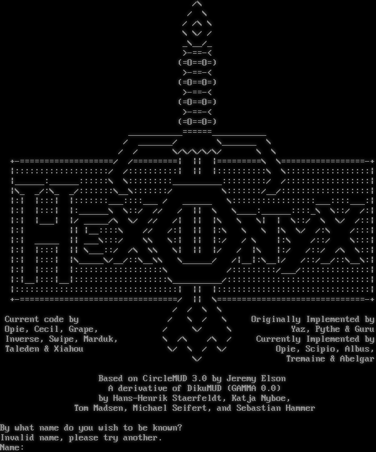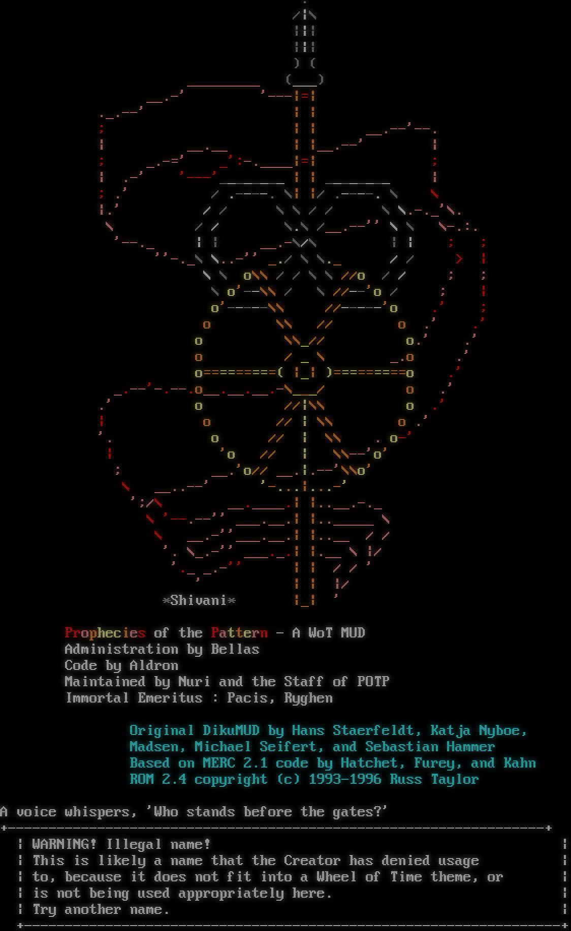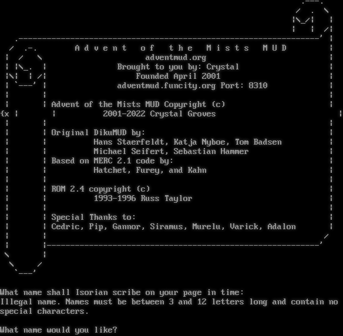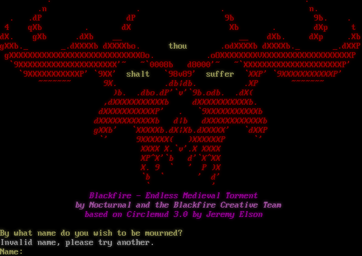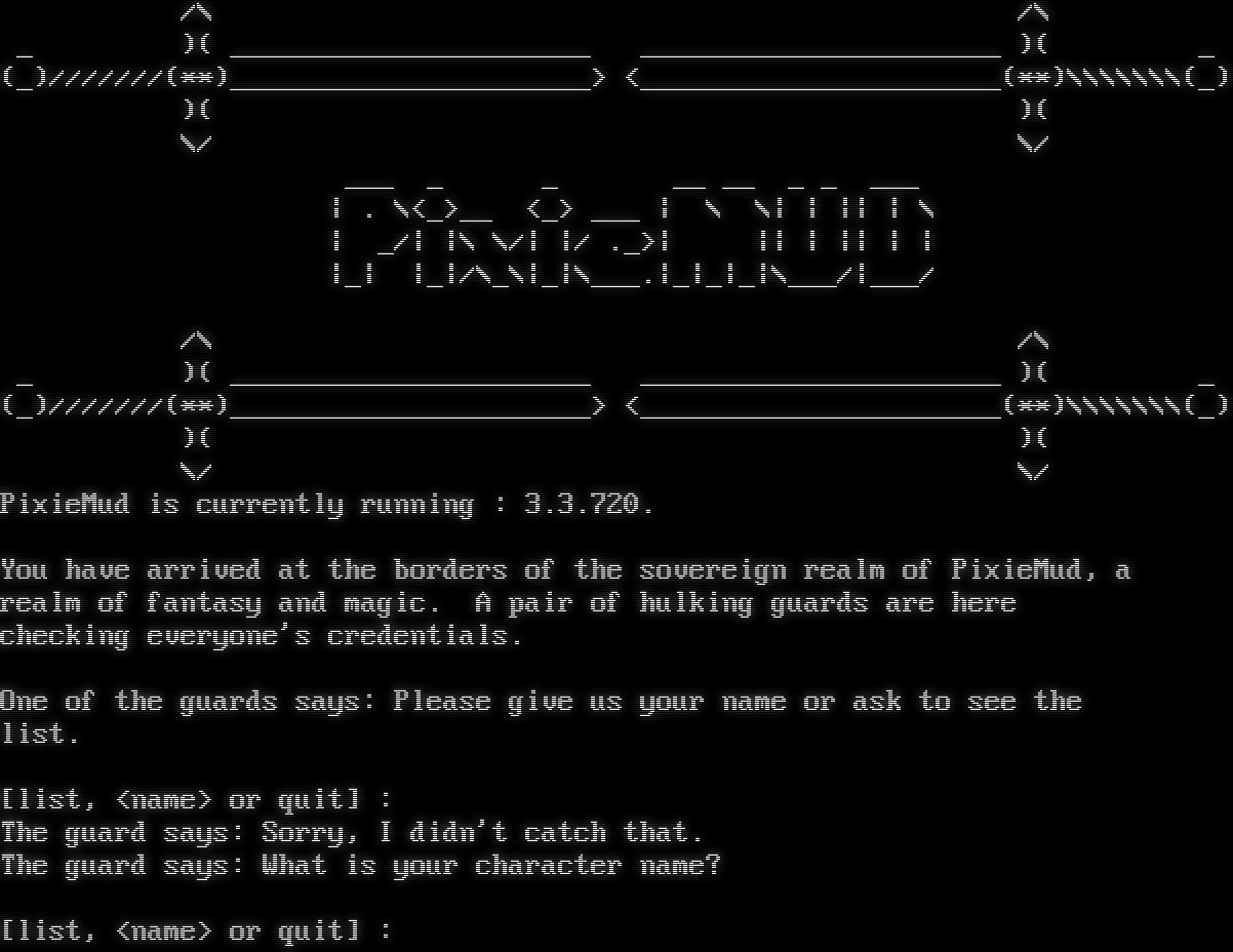 Welcome to NeonMOO, a MUD set in an alternate-history present day North America, in the city of Arnold Island, D.C., capital of the COS. Known for its smoggy air in the Banks and the glittering edifices on the island proper, simply called "Downtown", Arnold Island is, like the COS as a whole, tightly held in the grip of unchecked corporate power, most prominently the Arnold Island Neon Sequestration Company, Inc., and in the grip of unchecked state power, administered by WARD. So where do you fit in? Will you fight your way to the top of the pile to that shining office in the sky? Or will you stalk the streets, preying on the poor and the foolish? Or will you take up arms and bring the fight to WARD, breaking their iron grip on the people? If you do not have a character, you can register one by typing request <address@example.info>; if you do have a character, you can connect using connect <character name> <password>. For more information on the theme of NeonMOO, you can type theme, and to read this message again, type welcome. For any questions regarding the registration or login process, please contact characters@neon-moo.space for help. Due to aggressive handling by several mail providers, please be sure to check your spam folder if it appears the registration mail seems not to arrive. Also check out the NeonMOO discord at https://discord.gg/hzbMHxttpe. #$#LOGIN_TRIGGER Valid commands at this point are COnnect-, Quit, UPtime, Version, WElcome, REQuest, THeme, GET, or MSSP-REQUEST