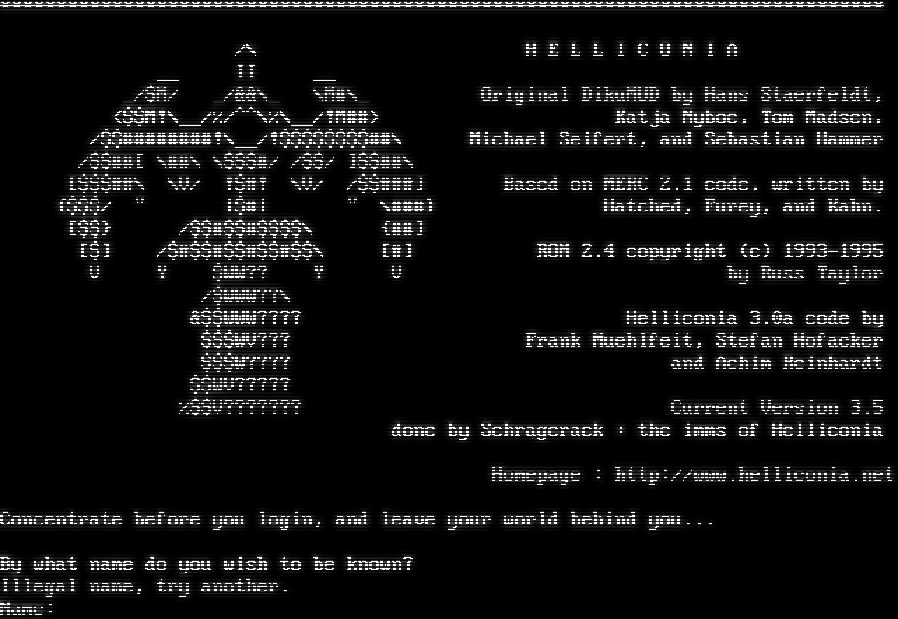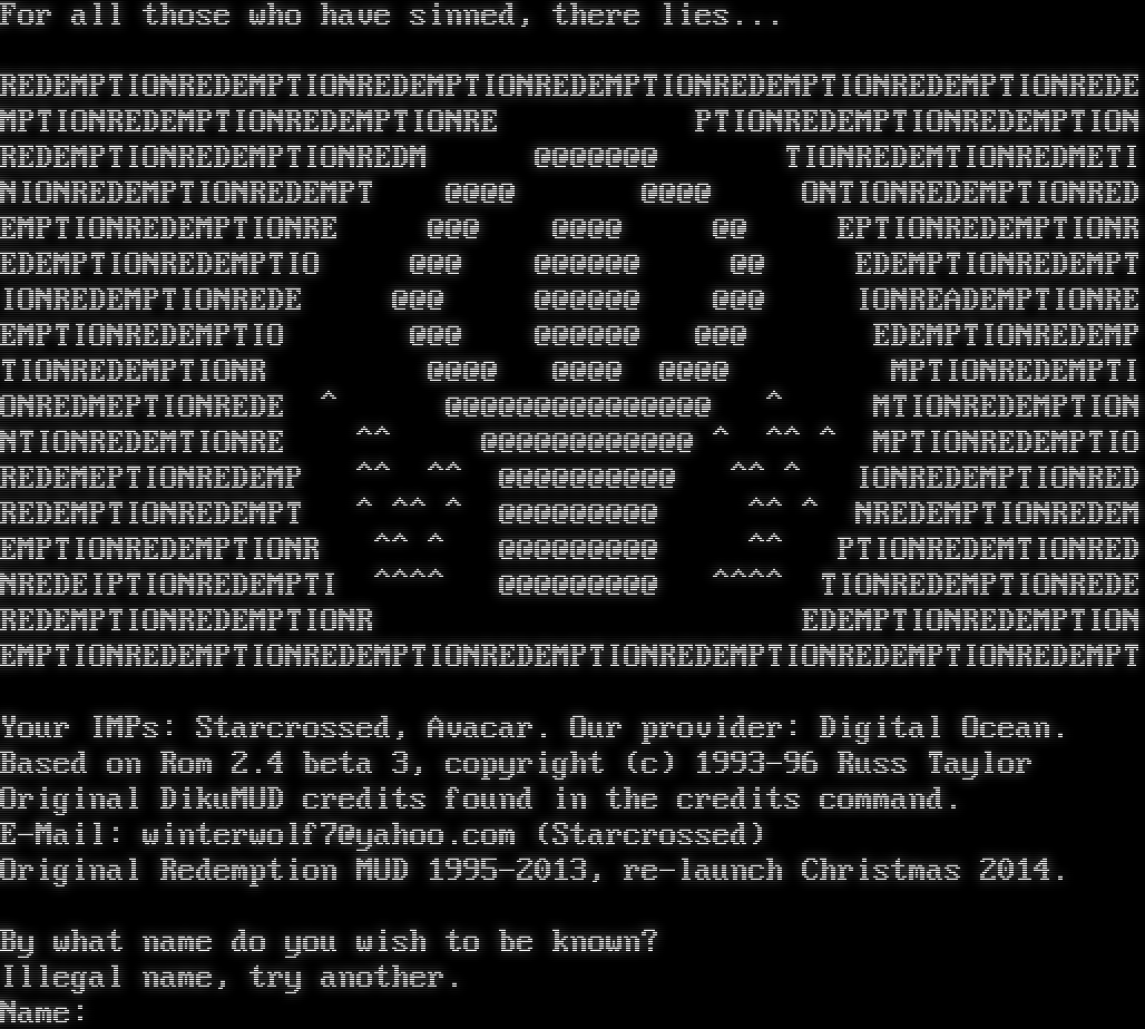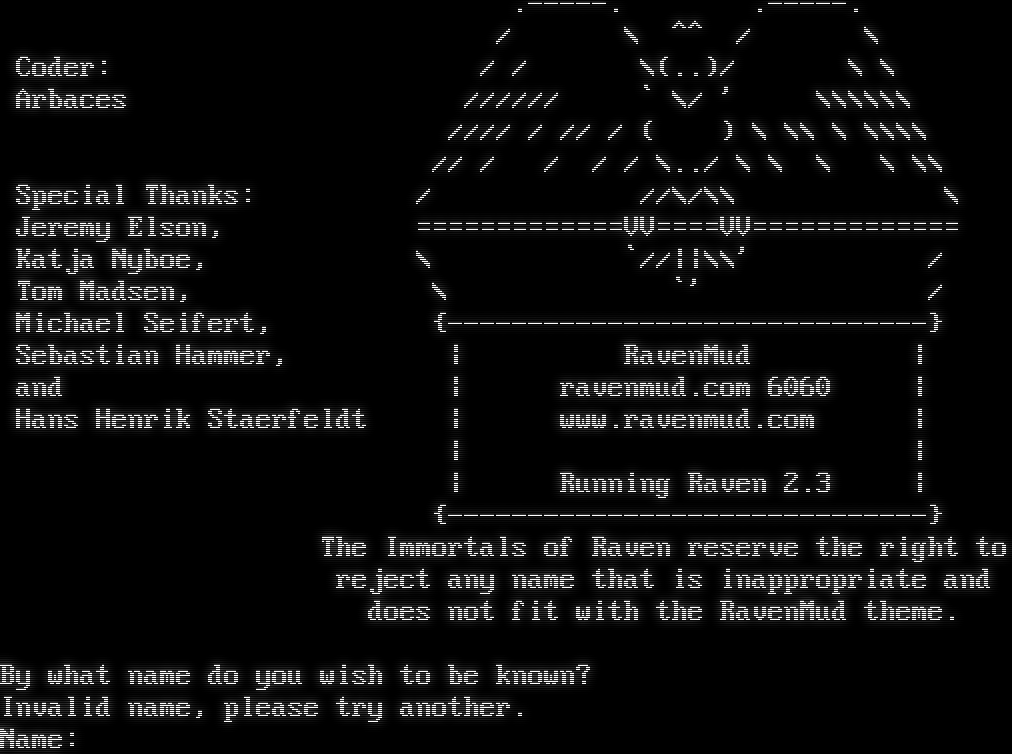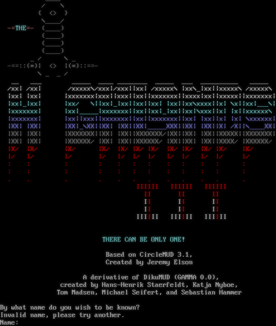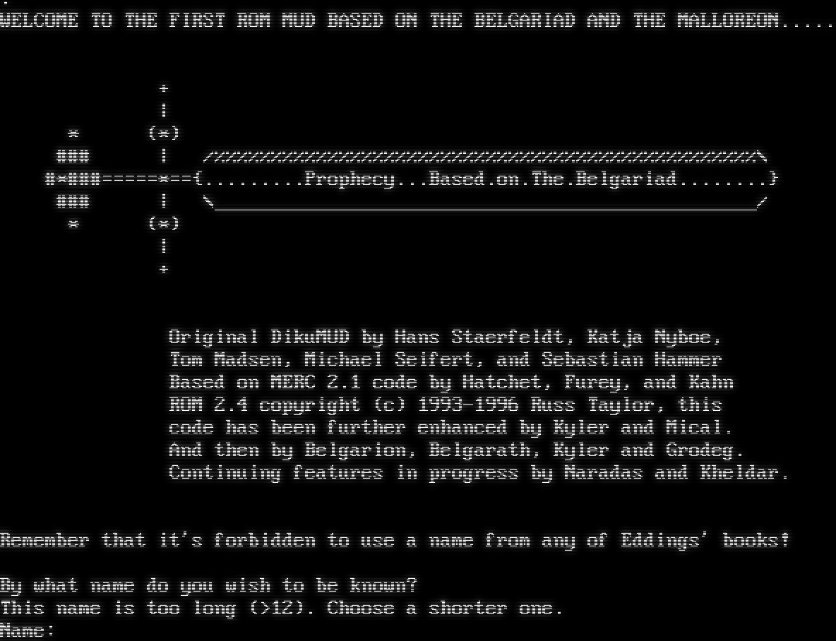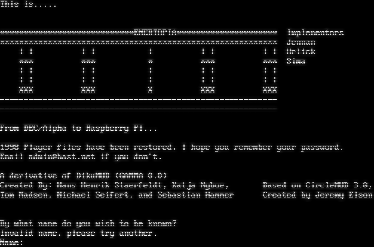 Welcome to NeonMOO, a MUD set in an alternate-history present day North America, in the city of Arnold Island, D.C., capital of the COS. Known for its smoggy air in the Banks and the glittering edifices on the island proper, simply called "Downtown", Arnold Island is, like the COS as a whole, tightly held in the grip of unchecked corporate power, most prominently the Arnold Island Neon Sequestration Company, Inc., and in the grip of unchecked state power, administered by WARD. So where do you fit in? Will you fight your way to the top of the pile to that shining office in the sky? Or will you stalk the streets, preying on the poor and the foolish? Or will you take up arms and bring the fight to WARD, breaking their iron grip on the people? If you do not have a character, you can register one by typing request <address@example.info>; if you do have a character, you can connect using connect <character name> <password>. For more information on the theme of NeonMOO, you can type theme, and to read this message again, type welcome. For any questions regarding the registration or login process, please contact characters@neon-moo.space for help. Due to aggressive handling by several mail providers, please be sure to check your spam folder if it appears the registration mail seems not to arrive. Also check out the NeonMOO discord at https://discord.gg/hzbMHxttpe. #$#LOGIN_TRIGGER Valid commands at this point are COnnect-, Quit, UPtime, Version, WElcome, REQuest, THeme, GET, or MSSP-REQUEST